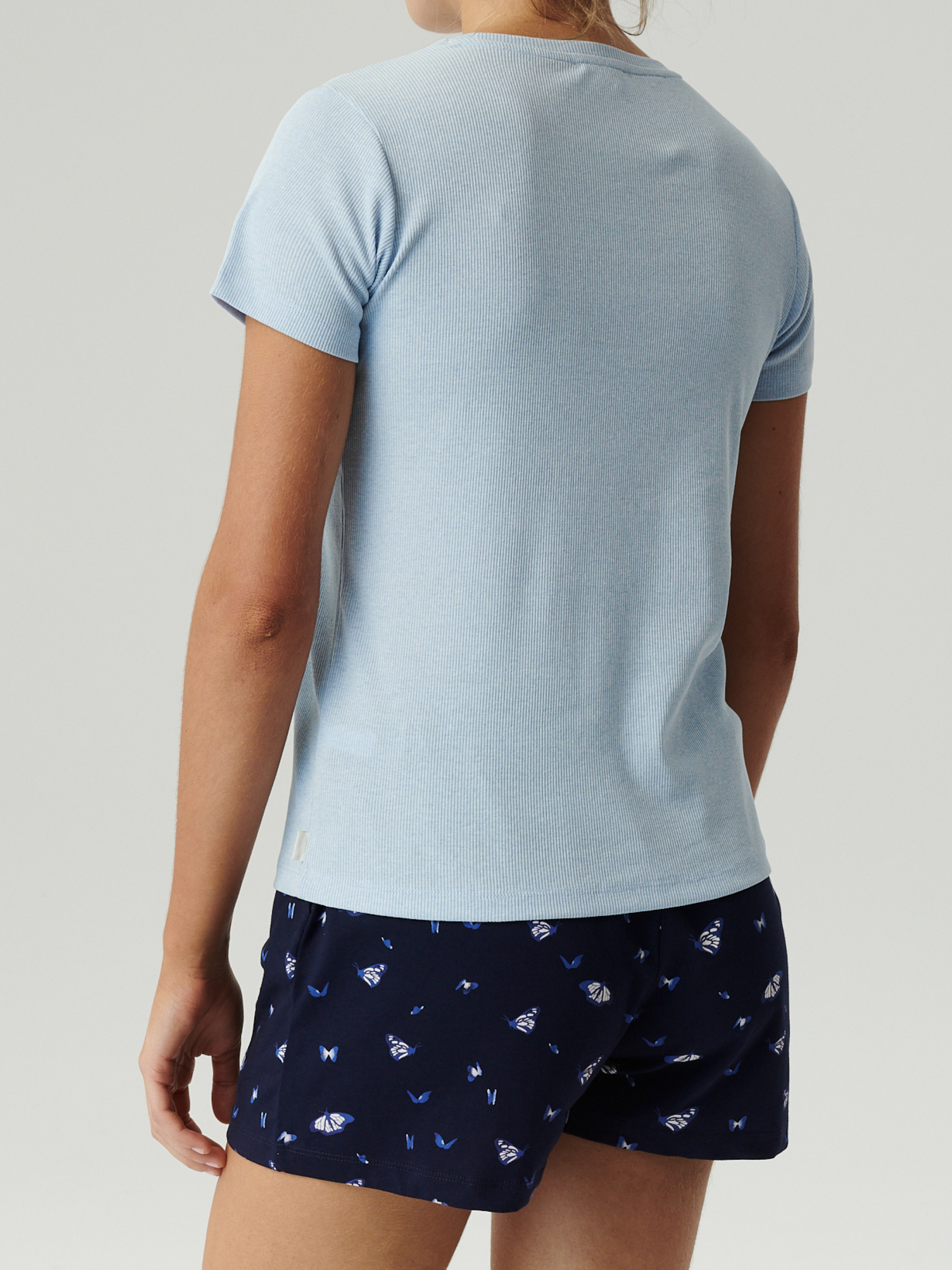 Женская пижама Atlantic сочетает в себе комфорт и стиль. Футболка выполнена из приятного материала в рубчик, в составе которого 98% хлопка и 2% вискозы, что обеспечивает мягкость и воздухопроницаемость. Светло-серый цвет футболки идеально сочетается с приталенным силуэтом и круглой горловиной, подчеркивающими элегантность и женственность. Шорты светло-голубого оттенка с небольшим принтом бабочек добавляют изысканности и игривости в образ. Они оснащены прорезными карманами по бокам и резинкой по талии, что делает их удобными для носки. Эта пижама — отличный выбор для тех, кто ценит комфорт в сочетании с привлекательным дизайном.