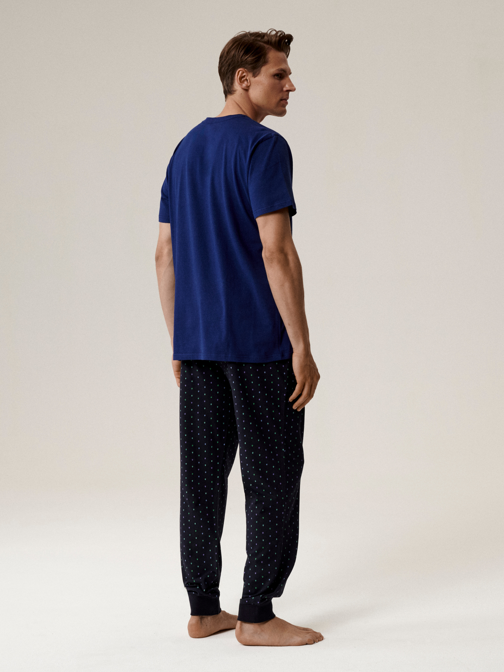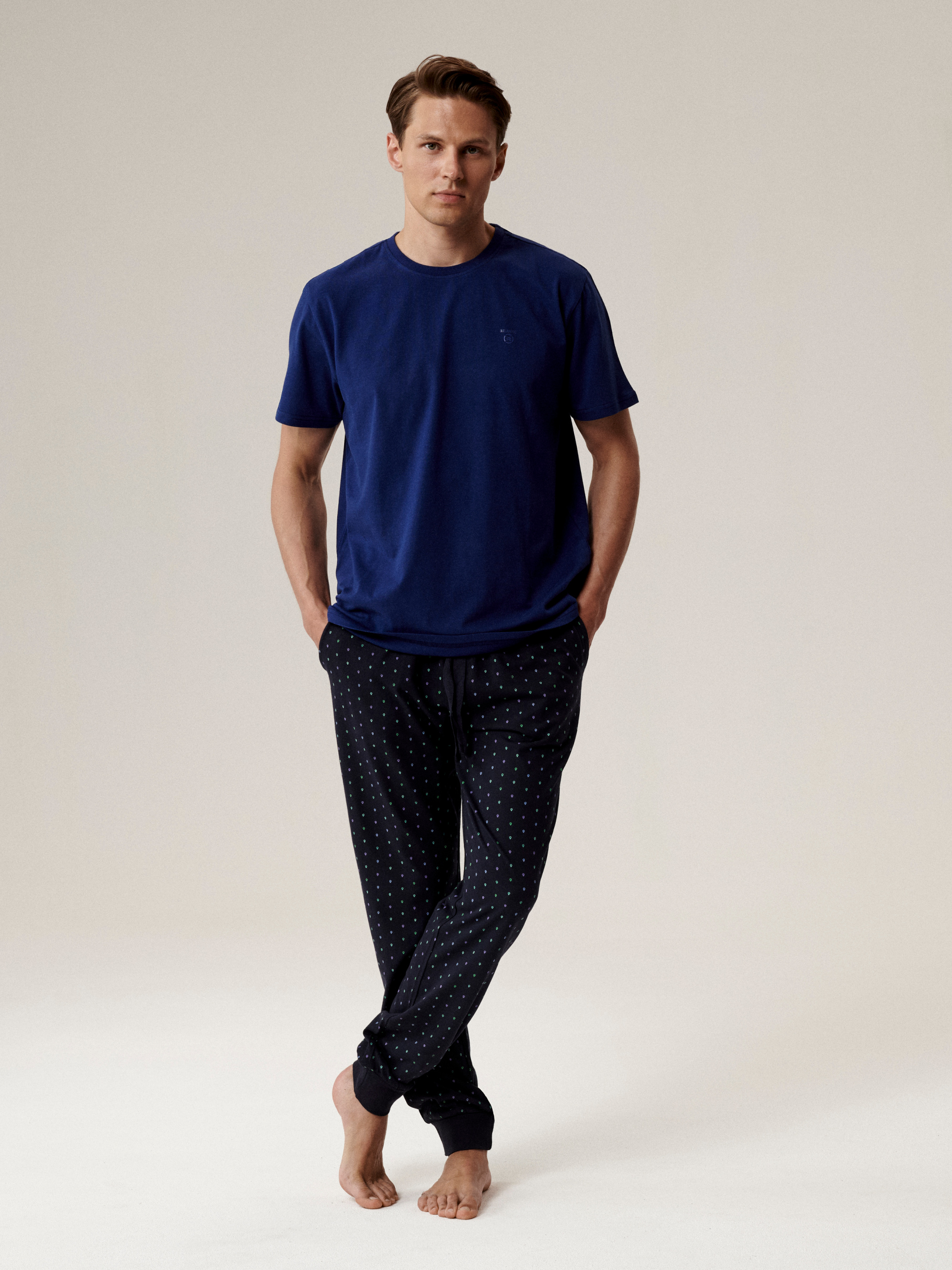 Мужская пижама из натурального хлопка сочетает комфорт и современный стиль. В комплект входит светло-серый лонгслив меланжевого оттенка с велюровой надписью Wild на груди и однотонные темно-синие брюки. Лонгслив выполнен прямого кроя, с круглым вырезом горловины и без манжетов — он не сковывает движения и дарит ощущение легкости. Брюки также прямого кроя, с удобным эластичным поясом и шнурком для регулировки посадки, что обеспечивает максимальный комфорт во время сна и отдыха. Благодаря натуральному хлопку пижама мягкая, дышащая и приятная к телу, а лаконичный дизайн делает её универсальным выбором для повседневного домашнего гардероба.