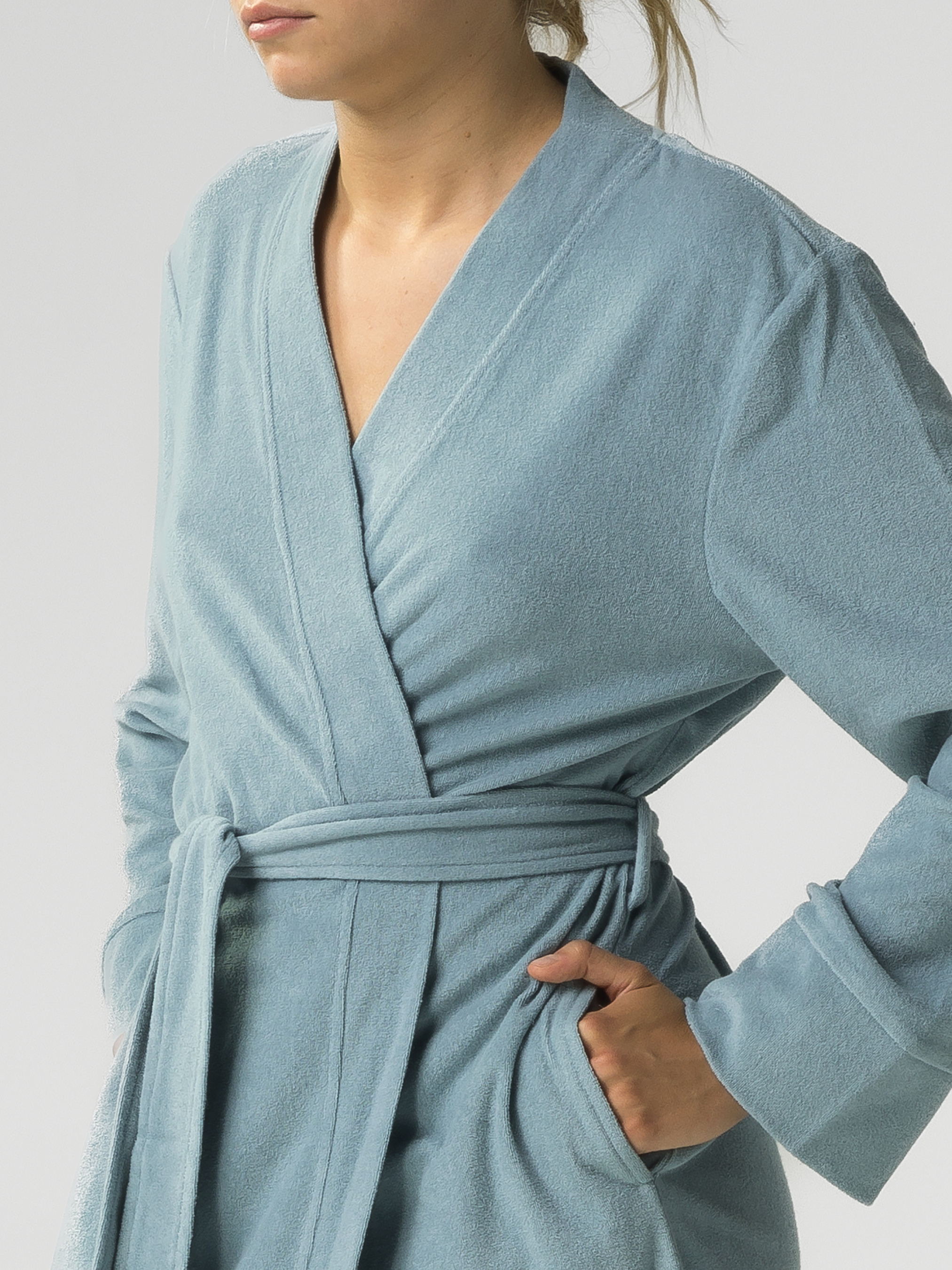 Женский халат Atlantic мятного цвета. Халат с длинным рукавом, длиной чуть ниже колена( рост модели 173, размер S), по бокам два кармана, по талии идет съемный пояс. Халат изготовлен из махры – 80% хлопка и 20% полиэстра. Такое сочетание позволяет ткане быстро впитывать влагу, помогая высушить тело после душа, ванной или бассейна. И защитить вас в прохланое время года от переохлаждения, даря ощущение комфорта и уюта. Благодаря своей мягкости халат поможет расслабится после тяжелого трудового дня, даря ощущение домашнего телпа.