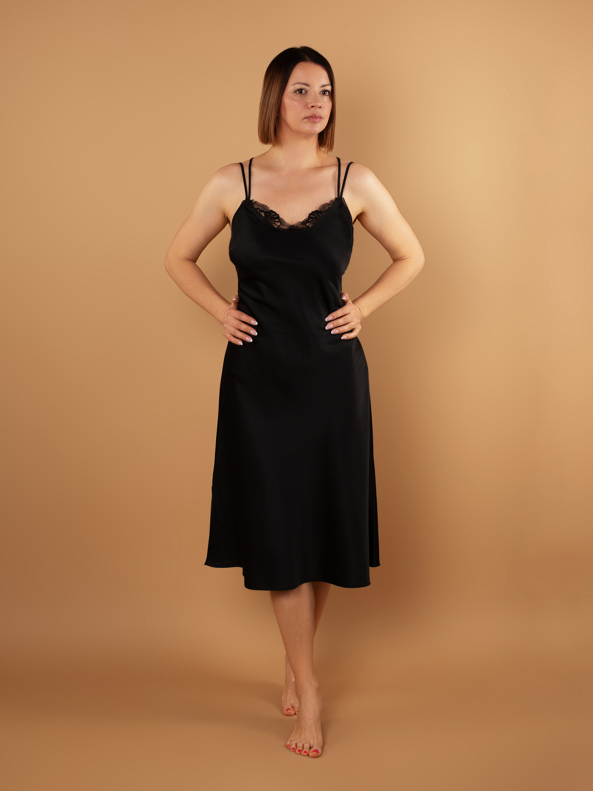 - Сорочка прямого кроя из сатинового полотна в сочетании с кружевом; - Длина – ниже колена; - Основное полотно – сатин, который сохраняет тепло и пропускает воздух; - В зоне декольте сорочки красивый U -образный вырез, декорированный неэластичным кружевом; - Горизонтальные вытачки на груди позволяют сорочке лучше садиться по фигуре; - Тонкие регулируемые бретели помогут скорректировать высоту посадки на теле; - Особенностью модели является расположение самих бретелей, они двойные, две бретели расположены как обычно, а еще две сочетаются на спине между собой и имеют отдельный регулятор; - Нижний край сорочки обработан технологией "плоский шов", это обеспечивает легкую и комфортную посадку; - Снизу сорочки с обеих сторон имеются небольшие разрезы, позволяющие свободно двигаться; - Металлическая фурнитура брендированная, цвета "розовое золото". Состав: - Сатин: 100% полиэстер; - Кружево: 100% полиэстер.