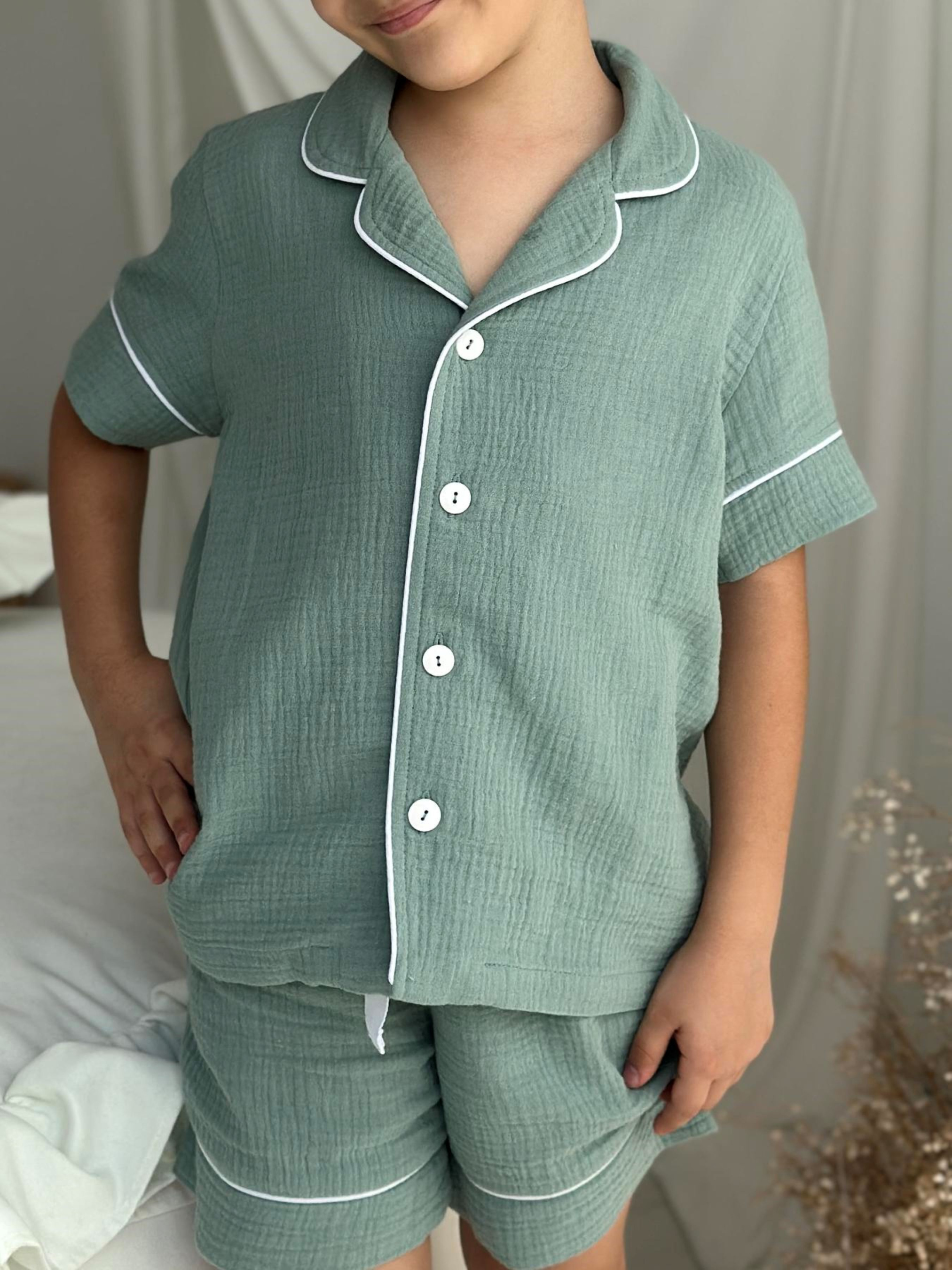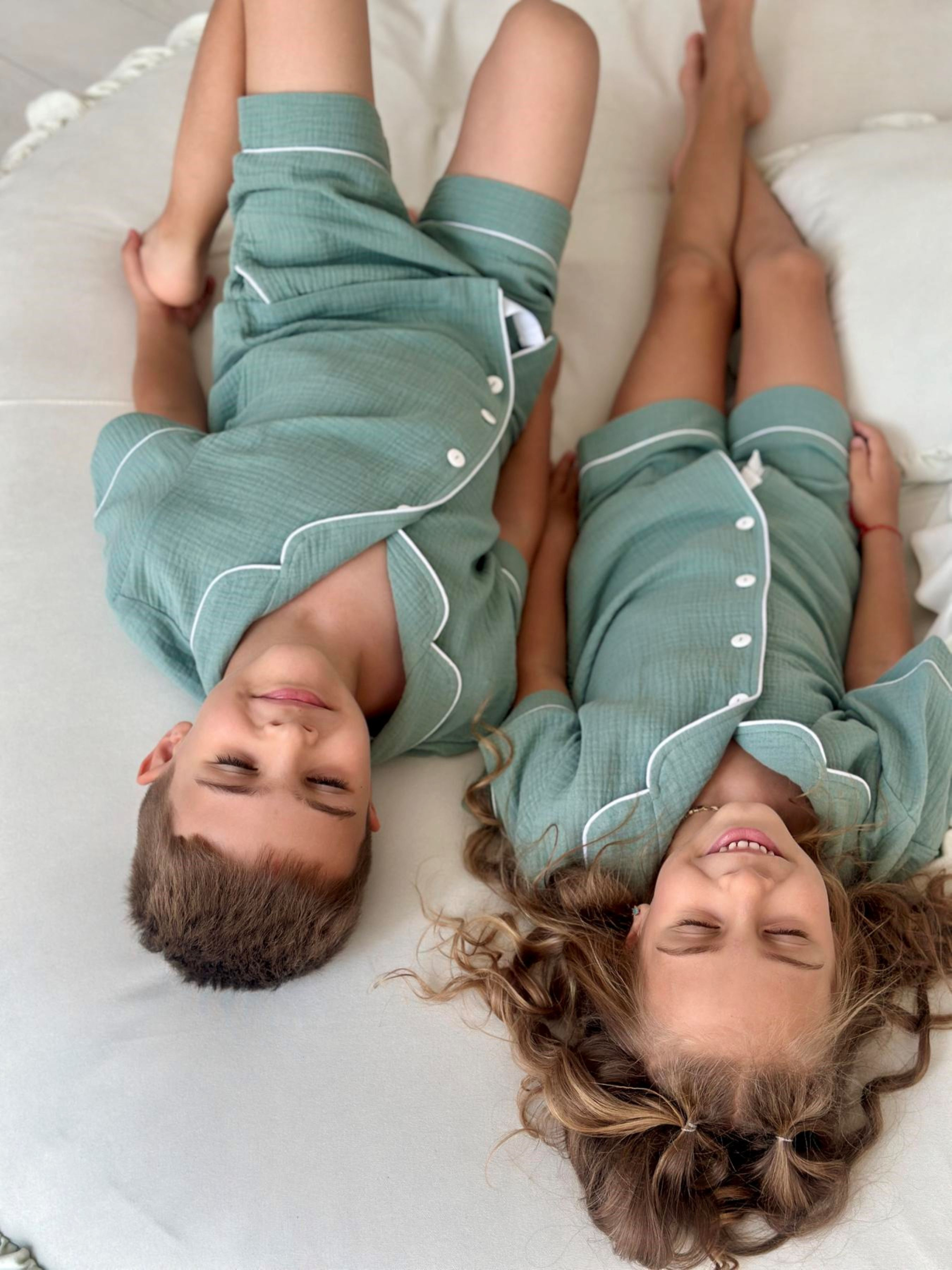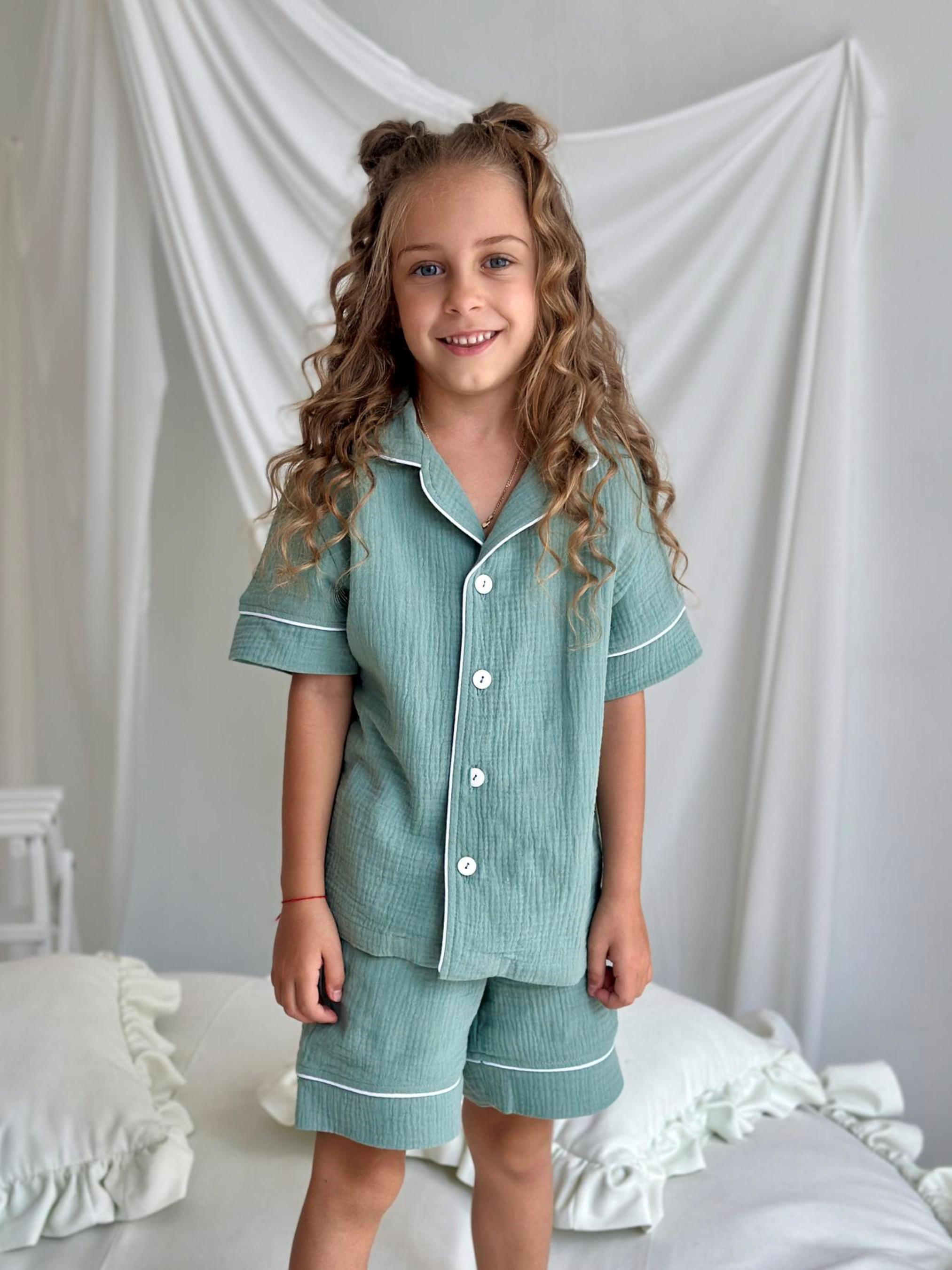Детская муслиновая рубашка VIVA с коротким рукавом – комфорт и стиль в каждом прикосновении Рубашка из коллекции VIVA – это сочетание мягкости, натуральности и удобства, которую дети оценят с первого одевания. Созданная для роста от 116 до 146 см (примерно 5–12 лет), она дарит свободу движений и приятные ощущения как во время сна, так и дома во время отдыха. Особенности модели: - Классический крой с коротким рукавом – оптимально, когда хочется легкости и свободы - Застежка на пуговицы – легко одевать и снимать - Декоративный белый кант, придающий чистоплотность и изысканность. - Природный цвет эвкалипт – спокойный и универсальный Ткань: 100% хлопок, двухслойный муслин — дышит, не парит, приятен к коже, гипоаллергенен. Рубашку можно сочетать с муслиновыми штанами или шортами из этой же серии, создавая как классический пижамный комплект, так и легкий домашний образ. VIVA - это часть семейной коллекции, где есть модели для взрослых, поэтому можно создавать гармоничные образы "как у мамы и папы" и делать время дома еще теплее.