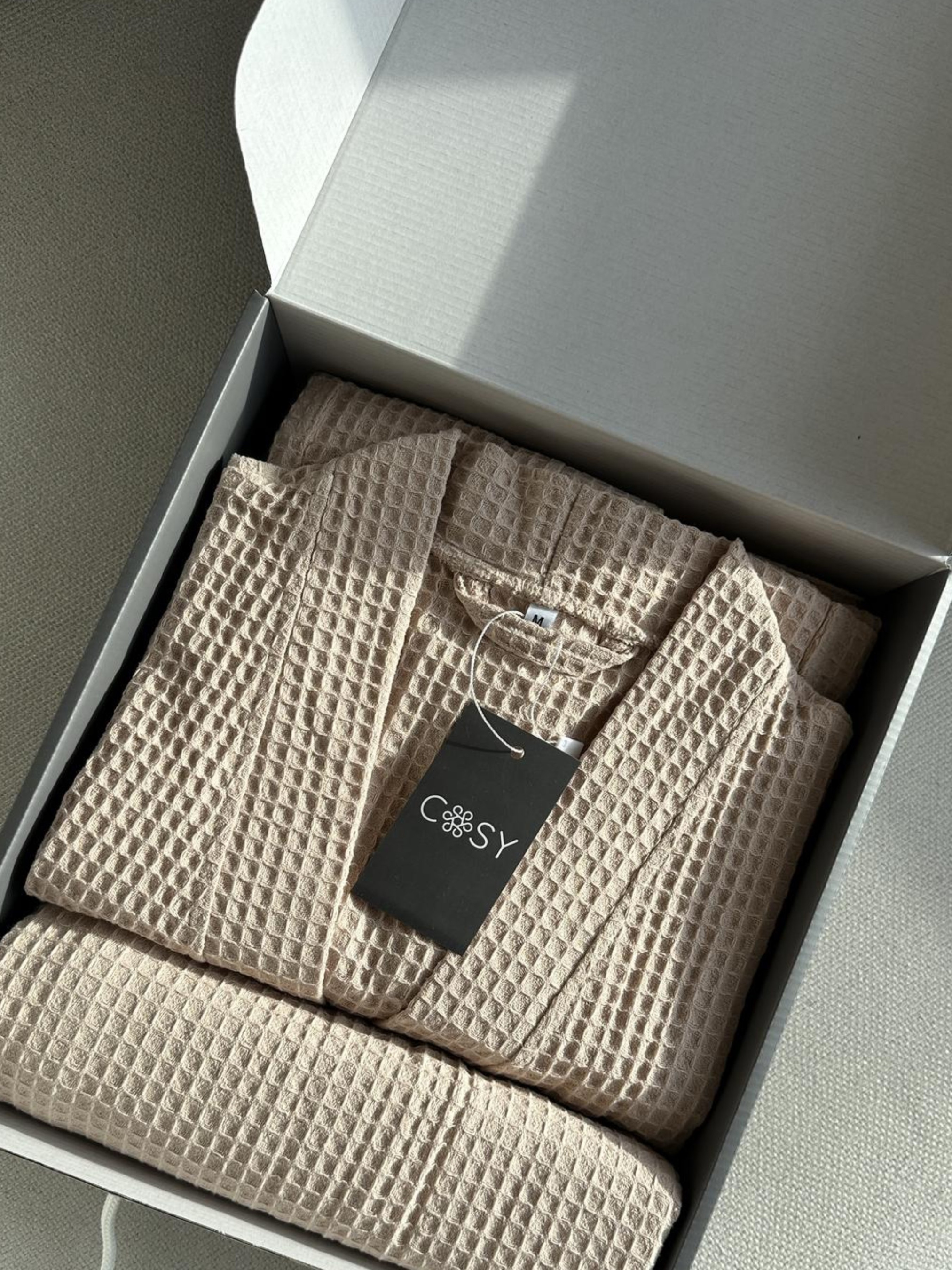 Подарочный набор для нее: короткий халат + полотенце в коробке COSY Забота, ощущаемая на ощупь. Короткий вафельный халат и полотенце – набор, который дарит комфорт после душа и создает атмосферу покоя дома. Вафельная ткань из 100% хлопка имеет легкий массажный эффект и прекрасно впитывает влагу, оставляя ощущение свежести. В наборе: - короткий вафельный халат с поясом - Полотенце 70×140 см - подарочная упаковка Материал: 100% хлопок (вафельная ткань) Цвет: Warm Sand (теплый беж) Идеальный подарок для тех, кто ценит натуральность, уют и заботу о себе каждый день. Рекомендации по уходу: 1. Стирать в холодной воде (при температуре не выше 40°С), отжим только на малых оборотах 400. Не использовать отбеливатели. 2. Естественная сушка. Рекомендуется немного растянуть изделие во время сушки. 3. Гладить при высоких температурах до 200°С (режим хлопка) с паром. После стирки вафельные клетки собираются, но после высыхания и глажки они расходятся.