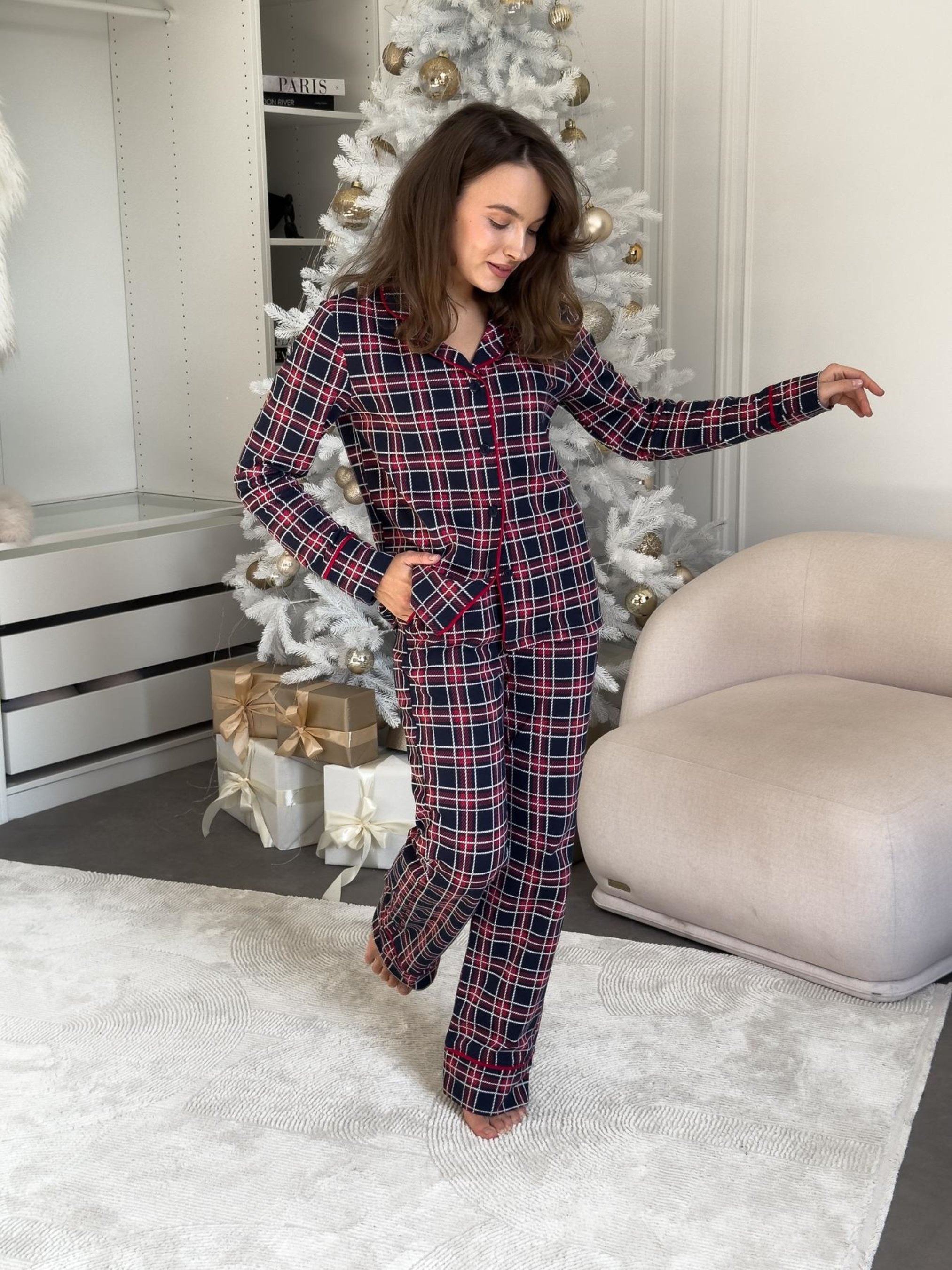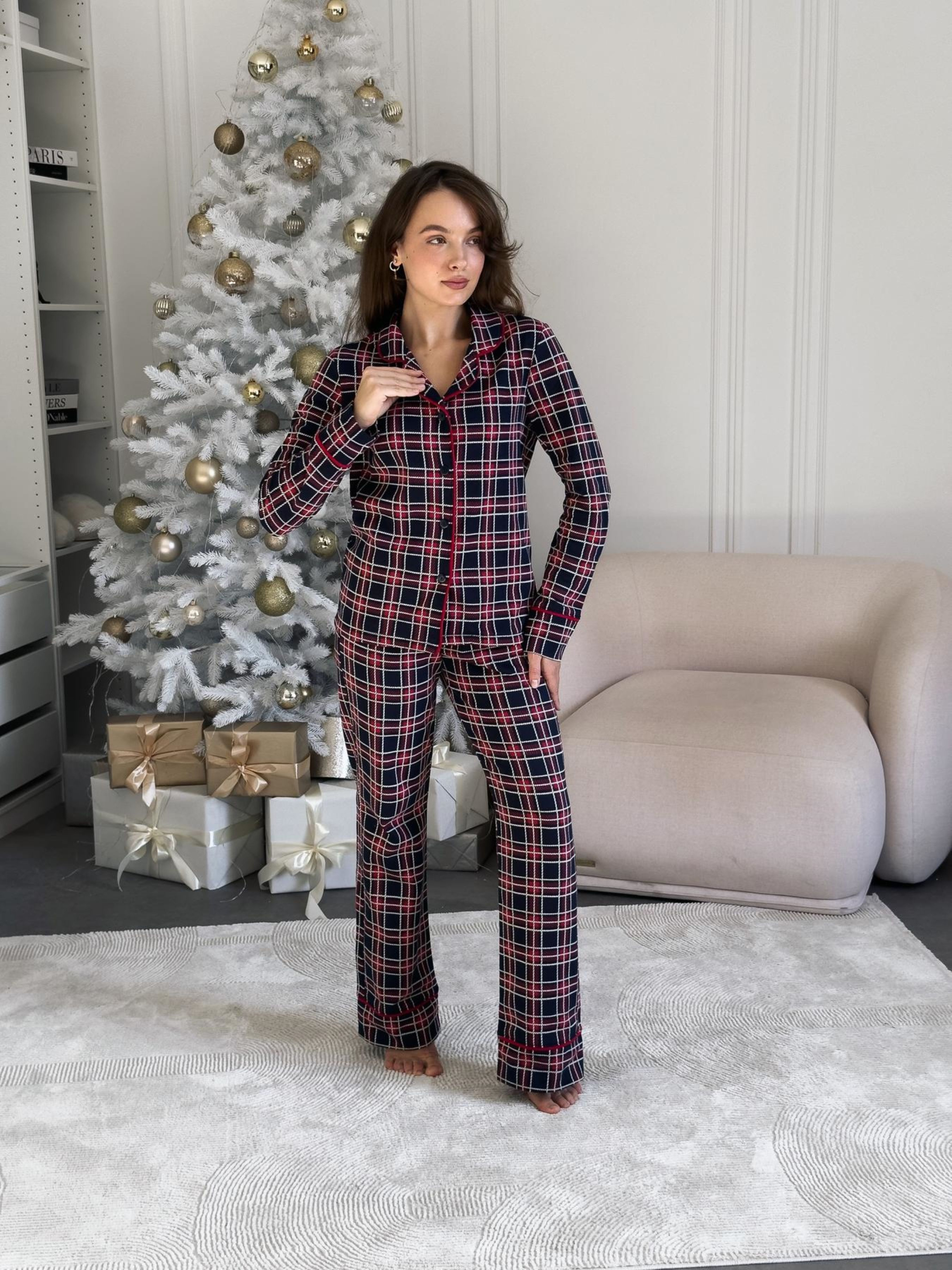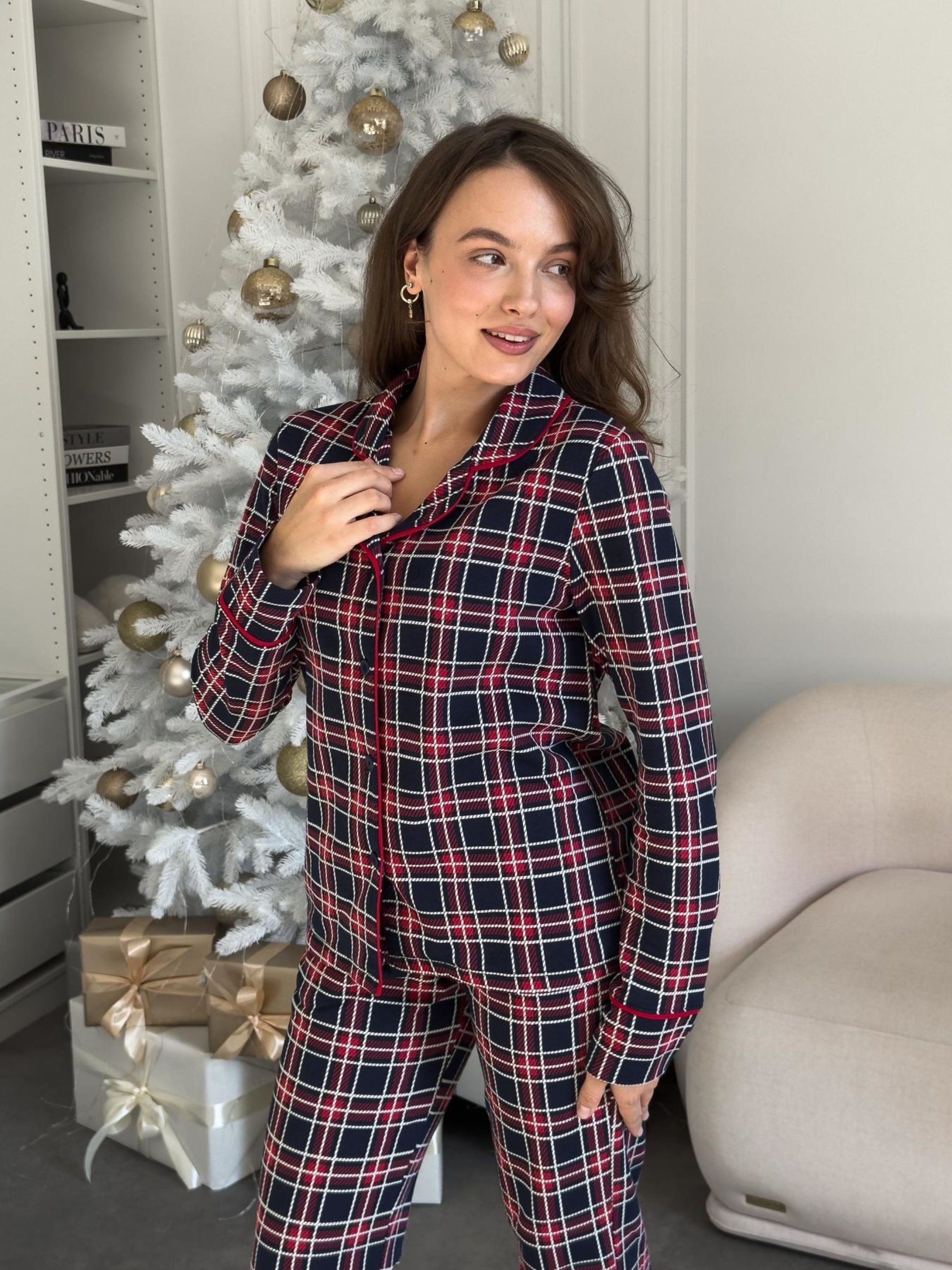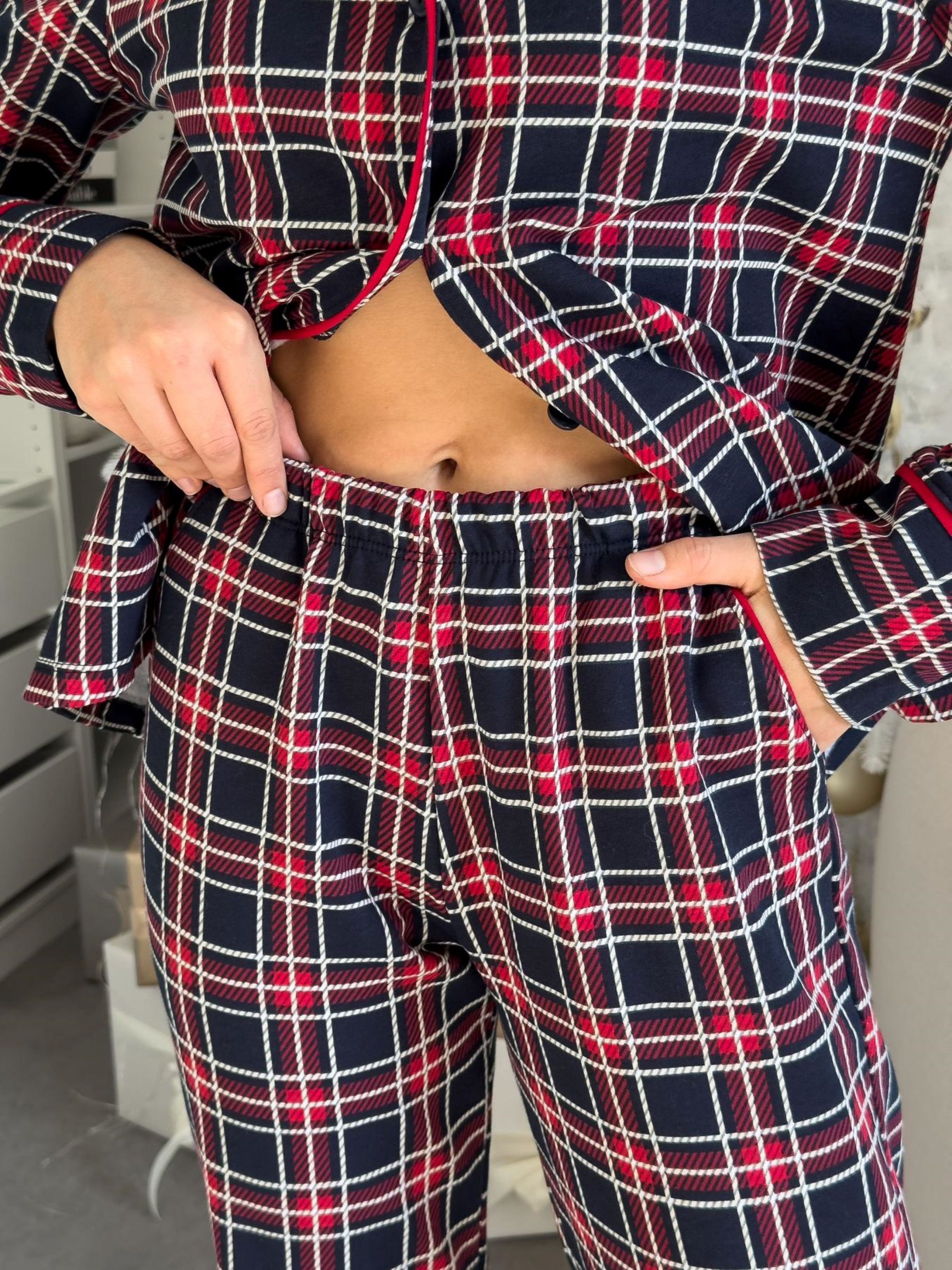 Женская теплая пижама рубашка + брюки. Теплая пижама с рубашкой на пуговицах и брюками – настоящий оберег тепла и уюта для холодных вечеров. Особенности модели: - классический принт в красно-синюю клеточку с элегантной контрастной окантовкой красного цвета; - универсальный фасон: комфортный дома и стильный для семейных фотосессий; Прекрасный вариант для подарка. Материал: футер-трикотаж с начесом (100% хлопок). Футер с начесом – утепленный трикотаж с гладкой лицевой стороной и мягким ворсистым изнанкой. Ткань приятна к телу, хорошо сохраняет тепло, не перегревает и выводит естественные испарения. Цвет: красно-синяя клетка Эффект: начес с внутренней стороны Размеры: S, M, L, XL, 2XL Для стильной гармонии эта модель доступна также в мужском варианте – идеально для парных сетов. Как ухаживать за изделием? Ручная или машинная стирка при температуре не более 30 градусов. Можно использовать любые моющие средства, но лучше отдать предпочтение гелям для стирки. Отжимайте на минимальных оборотах 400. Сушить изделие необходимо в расправленном виде в горизонтальном положении, вдали от нагревательных приборов и прямых солнечных лучей. Гладка не требует, при необходимости гладить через влажную ткань.