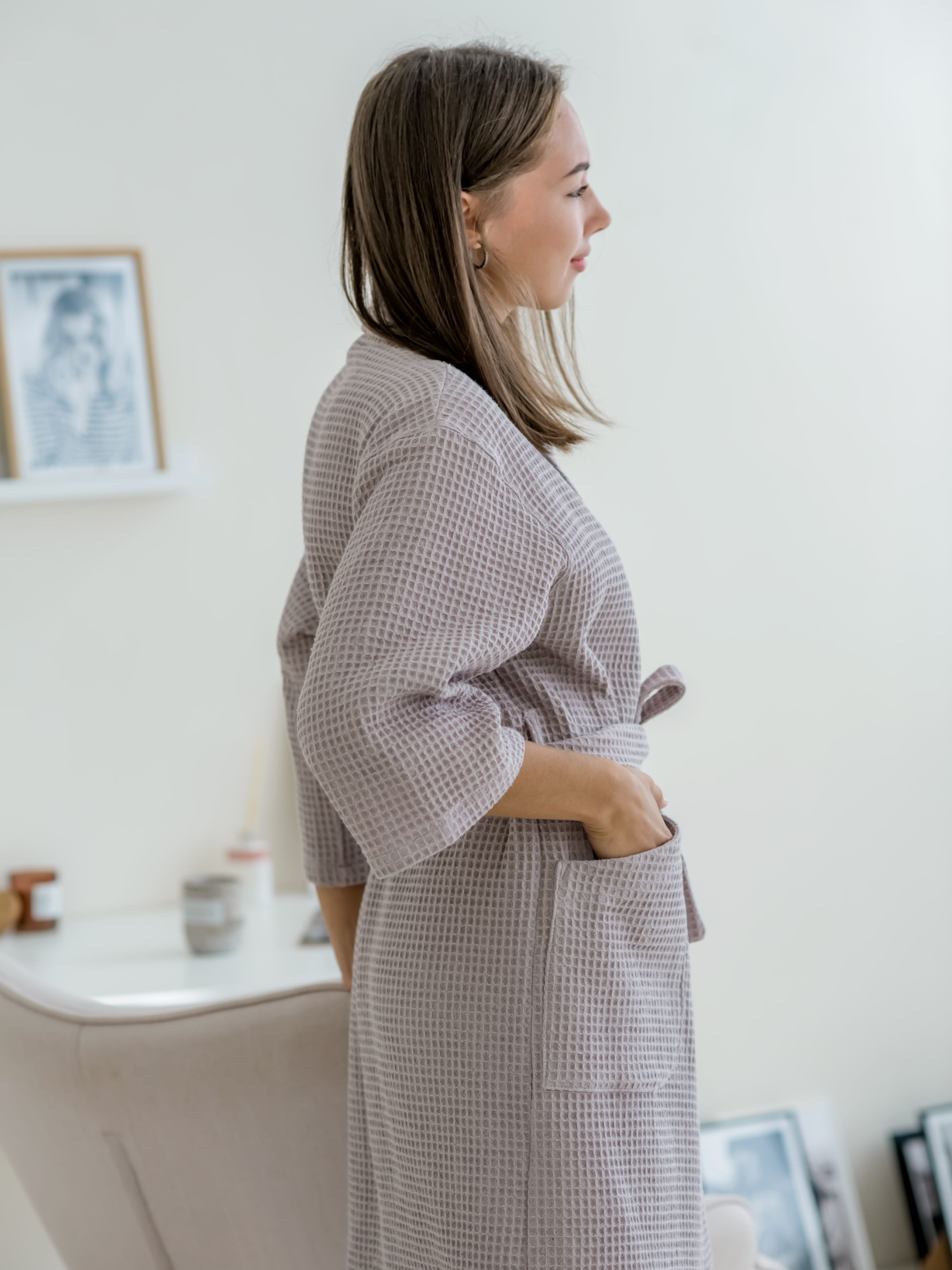 Вафельный халат может стать отличным приобретением или подарком, как для любителей активного отдыха, так и для людей, которым важен комфорт и возможность стильно выглядеть дома. Халат вафельный с шалевым воротником Длина халата 110 см. Ткань : 100% хлопок, Турция. Плотность: 220 грам/м2. Цвет: лавандово-серый Рекомендации по уходу: 1. Стирать в холодной воде (при температуре не выше 40°С), отжим только на малых оборотах 400. Не использовать отбеливатели. 2. Естественная сушка. Рекомендуется немного растянуть изделие во время сушки. 3. Гладить при высоких температурах до 200°С (режим хлопка) с паром. После стирки вафельные клетки собираются, но после высыхания и глажки они расходятся.