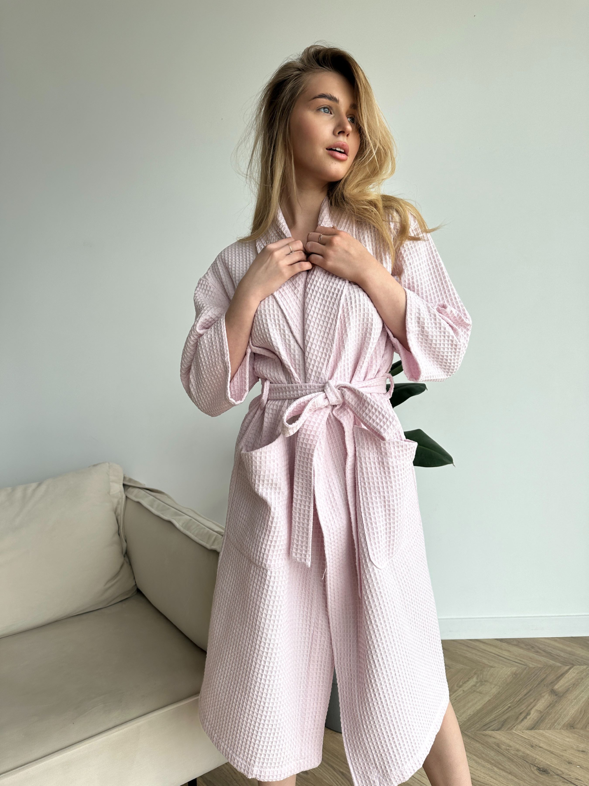 Вафельный халат с шалевым воротником Углубите в мир комфорта с нашим длинным вафельным халатом с шалевым воротником. Почувствуйте непревзойденную мягкость и уникальную способность впитывать влагу благодаря вафельной ткани, которая стала одной из самых популярных хлопчатобумажных материалов. Характеристики: Цвет: светло-лиловый(Almost Mauve) Ткань: 100% хлопок от Турции Плотность: 220 г/м2. Размер: M, L, XL, 2XL Вафельная ткань: Вафельная ткань благодаря своей структуре кажется объемной, но она легкая, намного тоньше махры и высыхает быстрее, при том, что влагу впитывает в три раза лучше обычного гладкого хлопкового полотна.(ткань не декатирована, после стирки дает усадку 5-6% ) Рекомендации по уходу: Легко ухаживать за халатом, стирать в холодной воде (при температуре не выше 40°C) и отжимать на низких оборотах (400). Запрещается использовать отбеливатели. Натуральная сушка рекомендована. Для достижения наилучших результатов растяните халат немного во время сушки. При глажке используйте высокие температуры до 200°C (режим хлопка) вместе с паром. Вафельные клетки могут собираться после стирки, но после высыхания и утюжка они разглаживаются, оставляя халат идеально обновленным. Углубите свой отдых со стилем и комфортом!