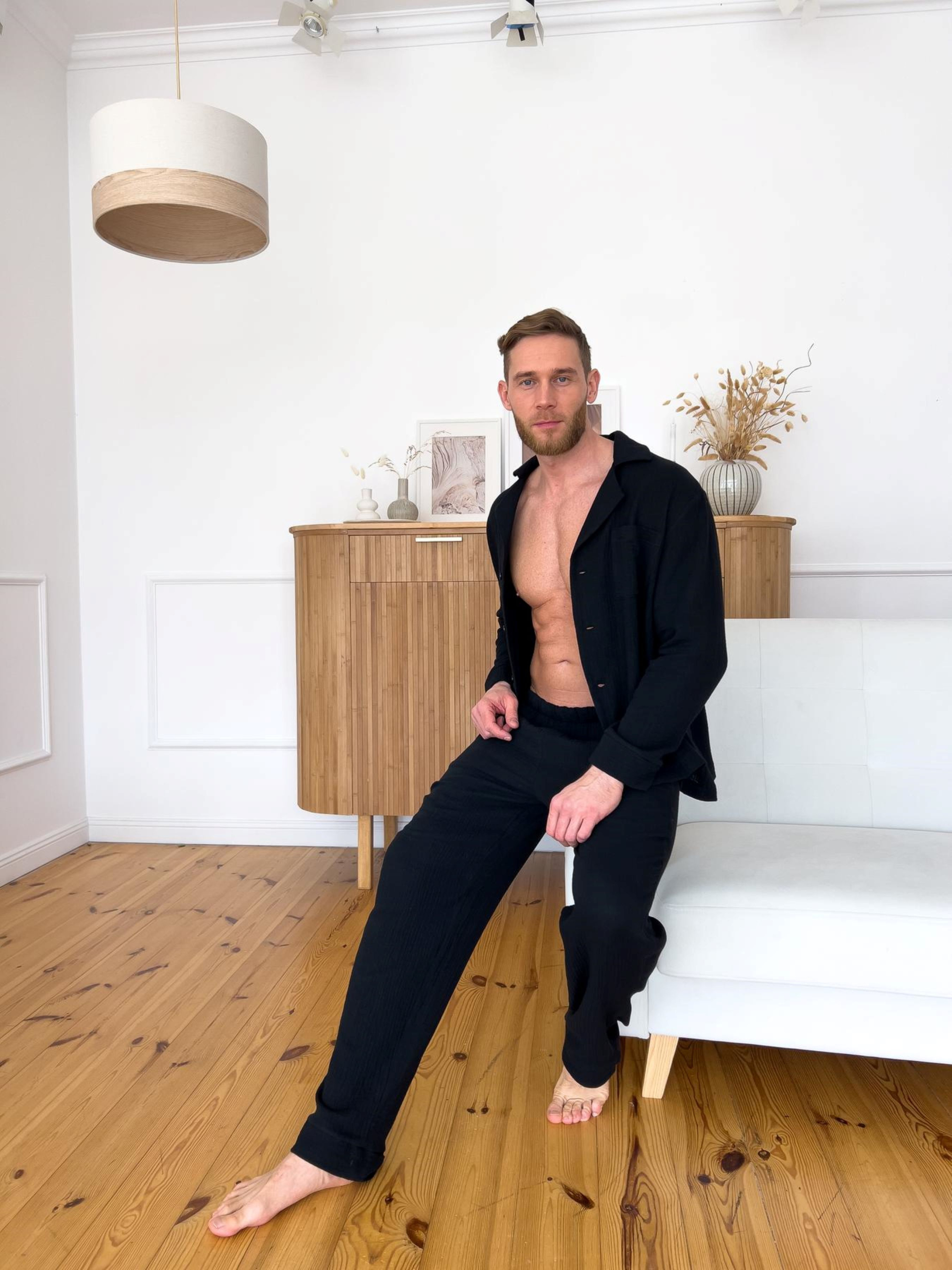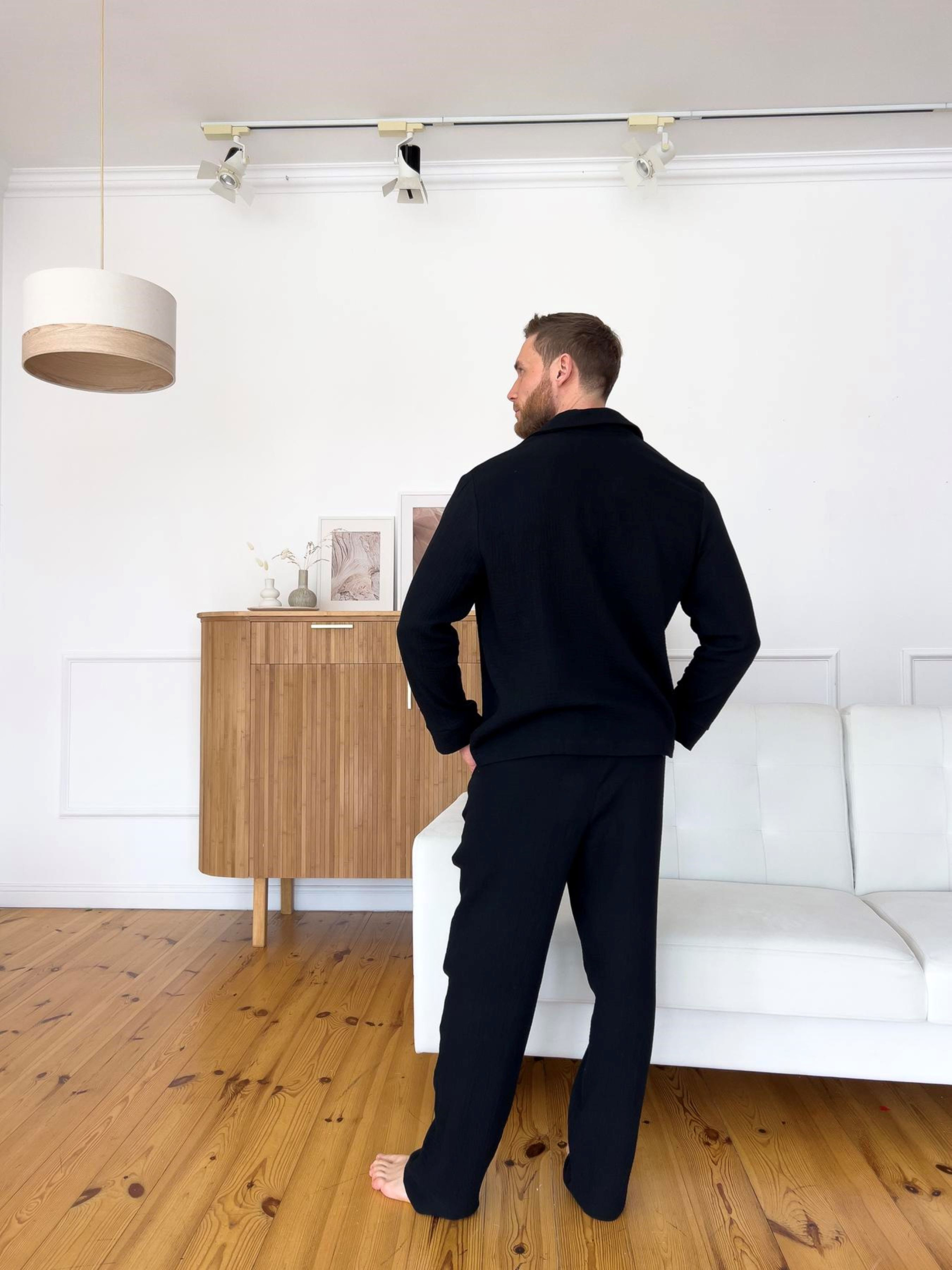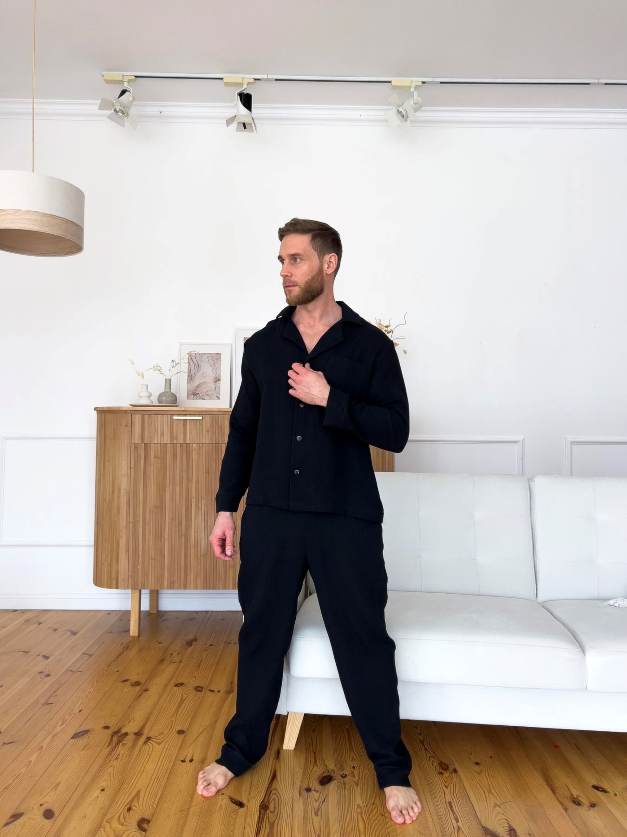 Мужская пижама из муслина обеспечит комфорт и уют дома. Изготовлена из 100% 2-слойного хлопка, мягкая и приятная на ощупь. Брюки на резинке, имеют карманы. Ткань: 100% хлопок, Корея. Плотность: 120 г/м2 Цвет: черный Размеры: M; L; XL; 2XL; 3XL