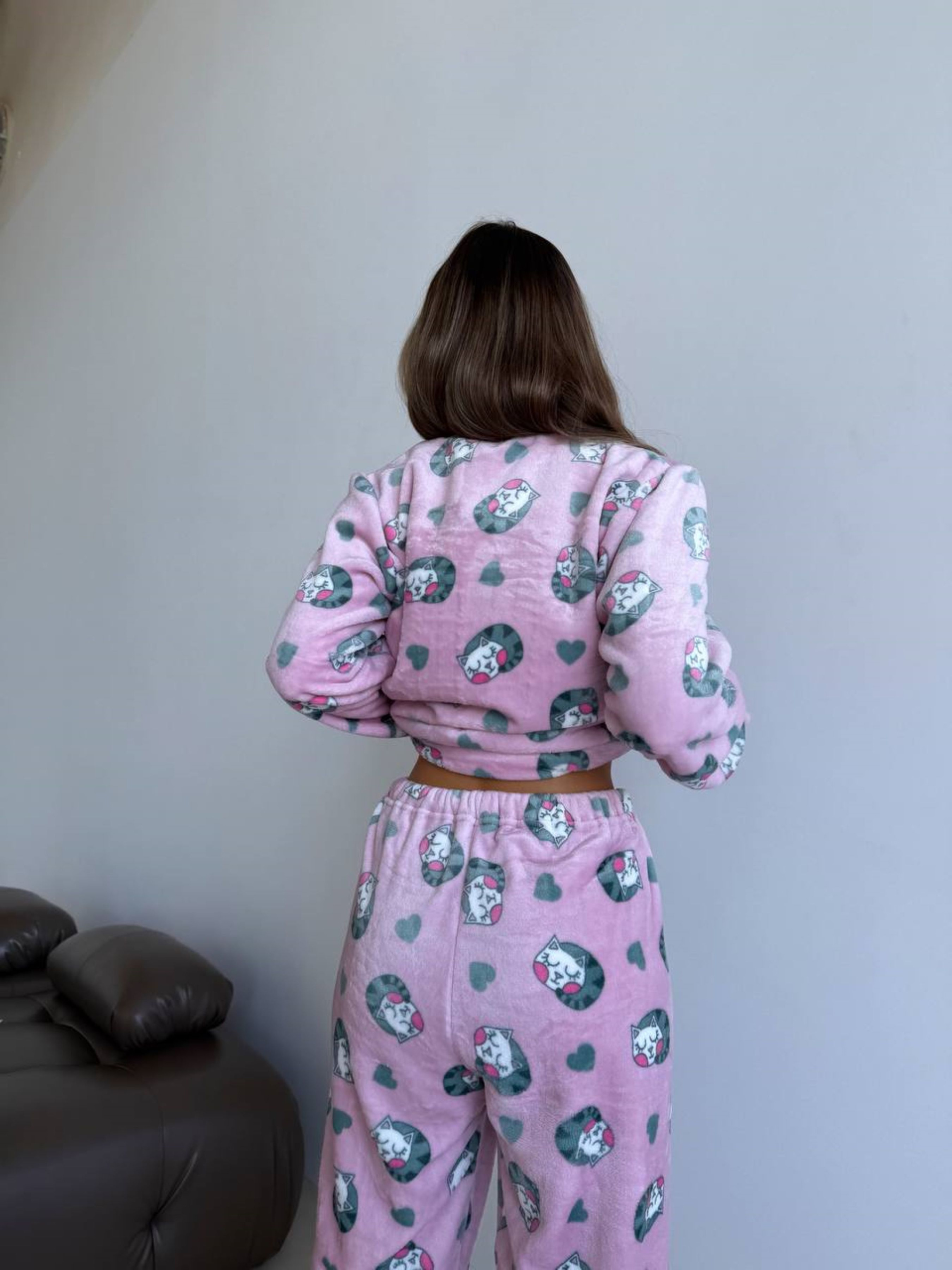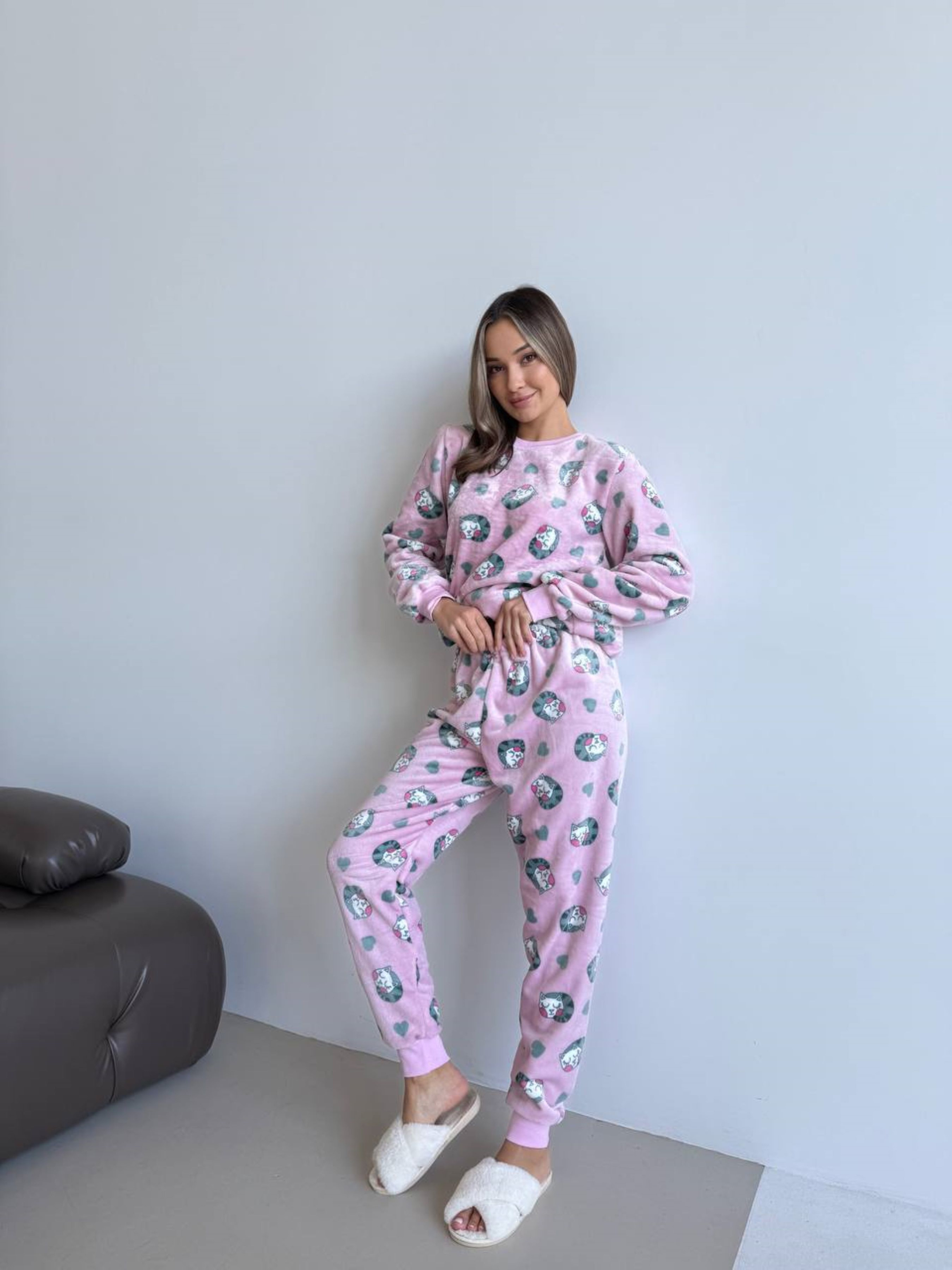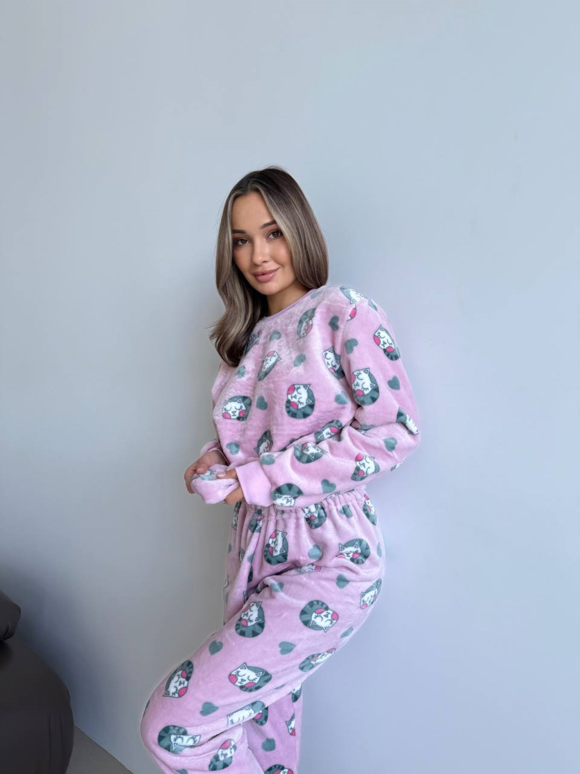 "Мяу-Лав" – нежность, тепло и стиль в одном образе! Эта очаровательная пижама в нежно-розовом цвете с милыми котятами и сердечками создана для тех, кто хочет чувствовать себя уютно даже в самые холодные дни. Комплект состоит из кофты и брюк, а манжеты на рукавах и брюках обеспечивают дополнительный комфорт и защиту от прохлады. Мягкий велсофт обнимает тебя с первых секунд – ткань невероятно приятна на ощупь и хорошо тянется, что позволяет чувствовать свободу движений. Пижама "Мяу-Лав" станет твоим любимым спутником для длинных вечеров под одеялом и холодных зимних утренников. Ткань легкая, но при этом тёплая, быстро нагревается от температуры тела, а в дальнейшем хорошо сохраняет ее. Благодаря пористой структуре, материал обладает хорошей воздухопроницаемостью (тело в одежде дышит, не перегревается). Ткань: полиэстер 100%, Турция. Плотность: 280 г/м2