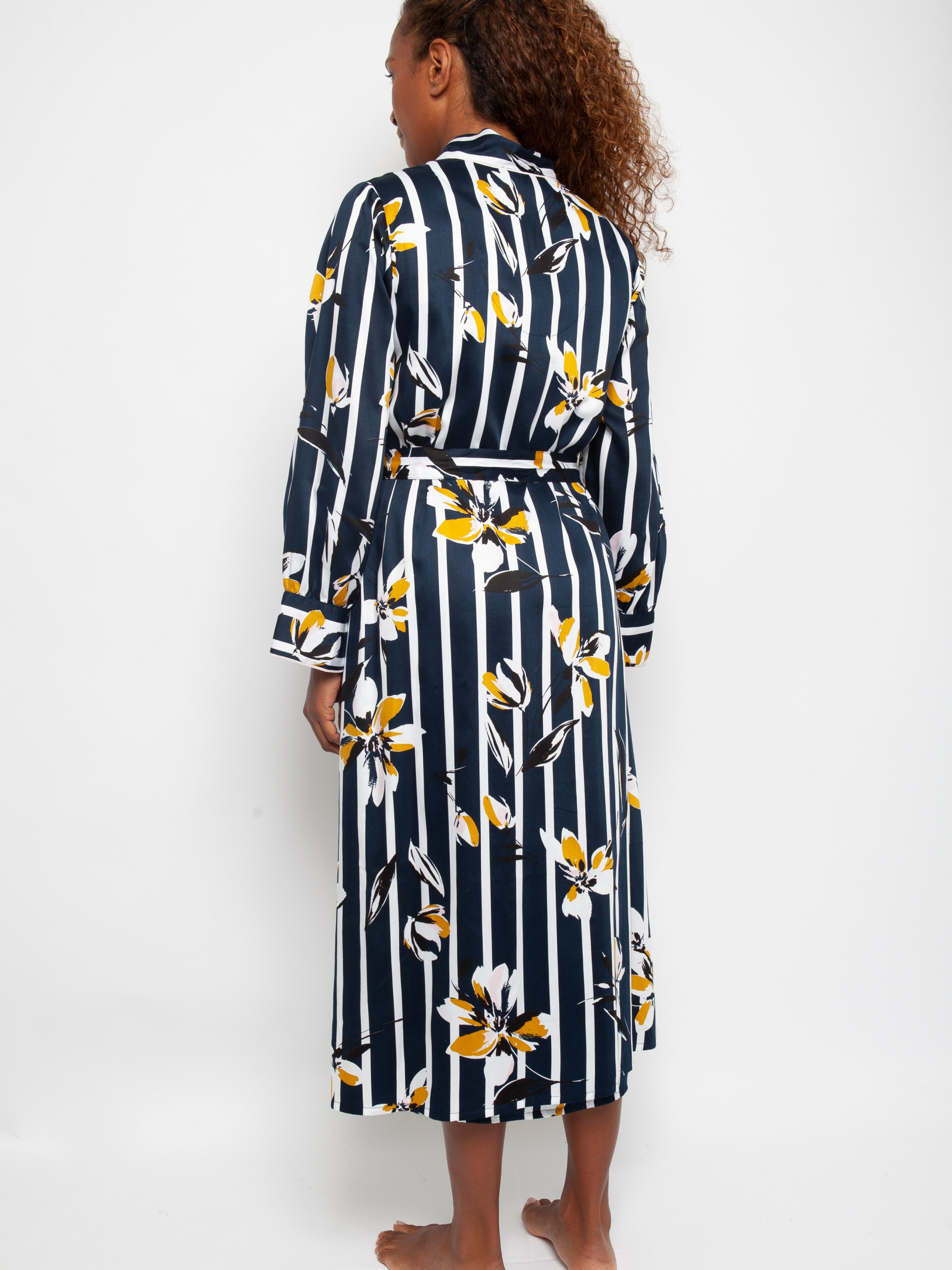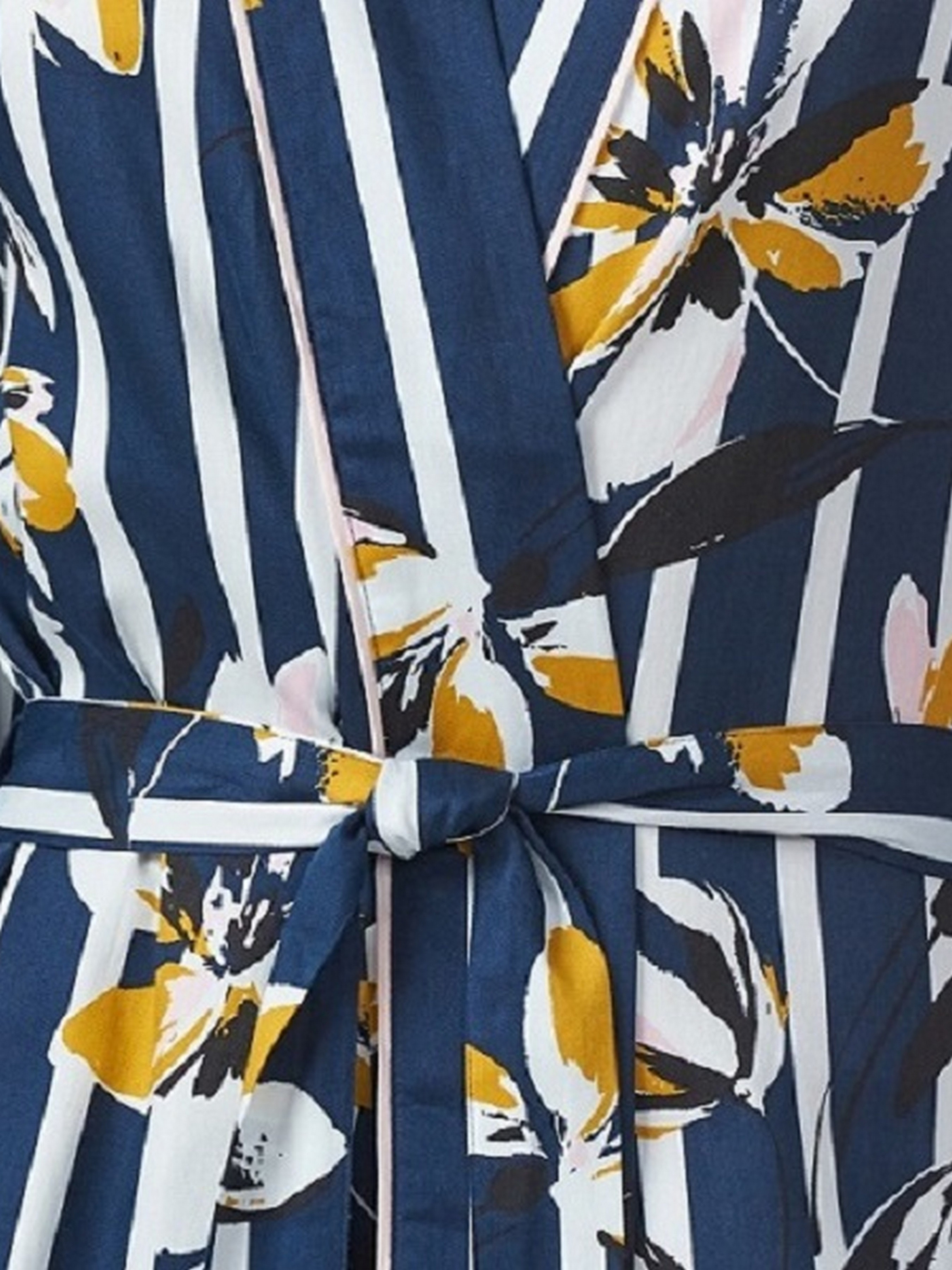 Экзотические крупные цветы на темно-синей полосе делают этот халат из тех, в которых вы будете отдыхать, спать и уверенно открываете входную дверь.