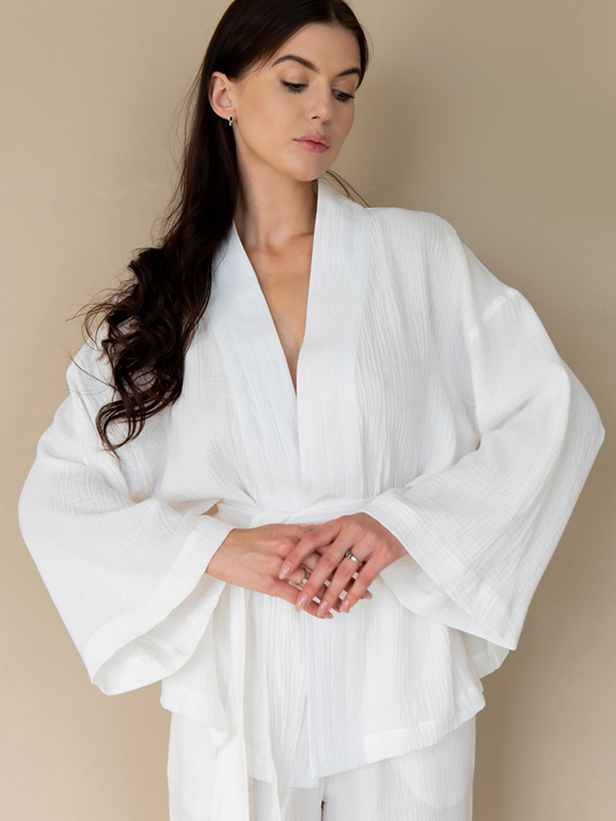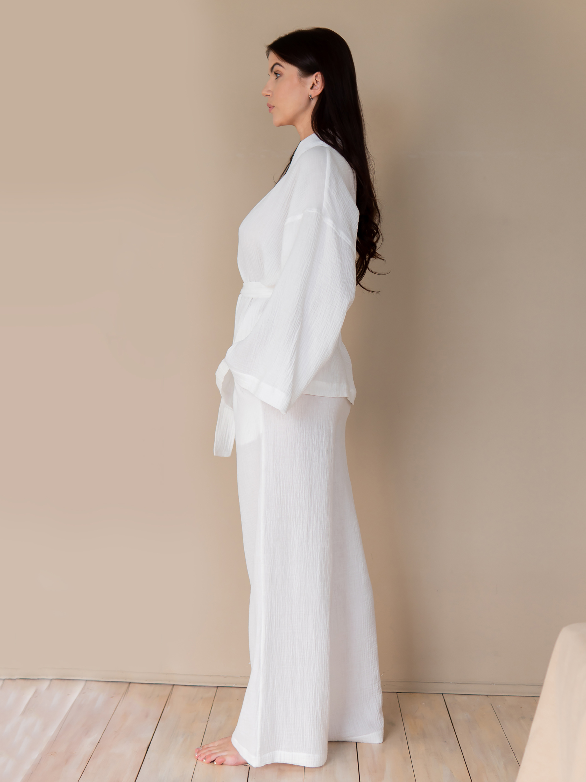 Пижамный костюм из белого муслина. Комплект состоит из кимоно с длинными рукавами и брюк. Кимоно на запах, с широким поясом. Брюки широкие с эластичным поясом на резинке, с карманами по бокам. Благодаря высокому качеству материала, пижама не дает усадку, практична и очень проста в уходе. ! Особенность пошива – закрытые мягкие швы, которые не только смотрятся аккуратно и безупречно, но и обеспечивают комфортное прикосновение ткани к телу, не позволяют изделию деформироваться. Размер XS/S. Грудь: 88 - 112 см. Талия 68 см. Бедра: 86 - 104 см. Длина рубашки 71 см. Размер M/L. Грудь: 112 – 120 см. Талия 74 см. Бедра: 104 – 114 см. Длина рубашки 73 см. Размер XL/XXL. Грудь: 120 – 130 см. Талия 80 см. Бедра: 114 – 124 см. Длина рубашки 75 см. Длина рукава 62 – 67 см. Длина брюк 105 – 106 см. Параметры модели на фото: Рост 173 см Грудь 87 см Талия 65 см Бедра 95 см Примечание по уходу: ручная или машинная стирка при температуре воды до 30°C при минимальной скорости отжима. Изделие не отбеливать. Не сушите в сушильной машине. Сушить на горизонтальной поверхности в расправленном состоянии в тени. Гладить при умеренной температуре снизу. Не использовать химчистку.