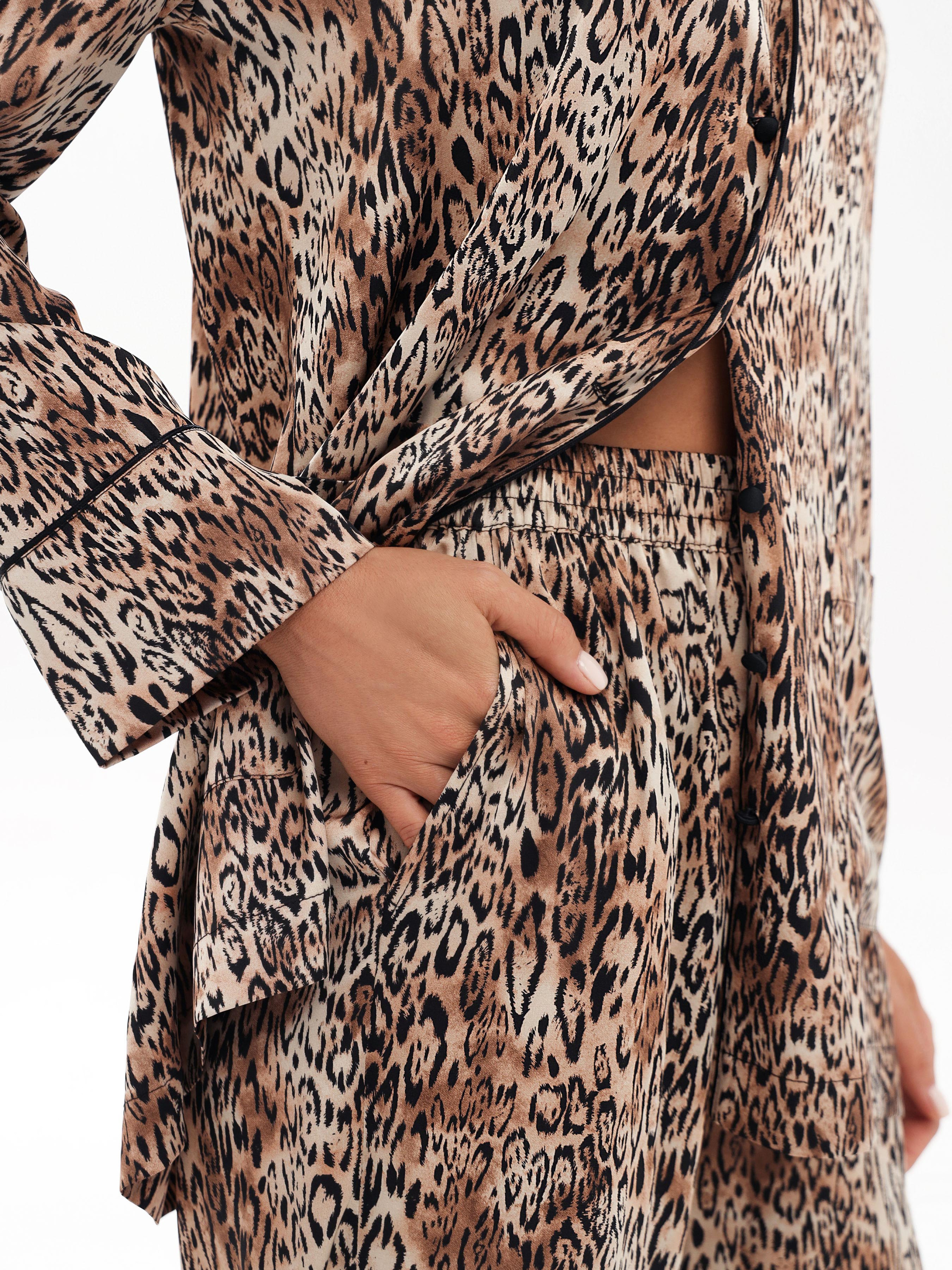 Пижамный комплект из искусственного шелка с леопардовым принтом – это воплощение роскоши и комфорта в одном образе. Легкая, приятная к телу ткань мягко окутывает кожу, создавая чувство нежности и прохлады. Классическая рубашка с длинным рукавом, воротничком и пуговицами выглядит стильно и удобно для ежедневного ношения дома. Брюки прямого кроя с эластичным поясом обеспечивают комфорт и свободу движений. В комплект также входит пояс, который придает акцент силуэту и позволяет носить рубашку как легкий халат. Яркий леопардовый принт придает образу игривости и женственности. Этот комплект идеально подходит как для сна, так и для уютного отдыха дома, а также стильный вариант домашнего наряда
