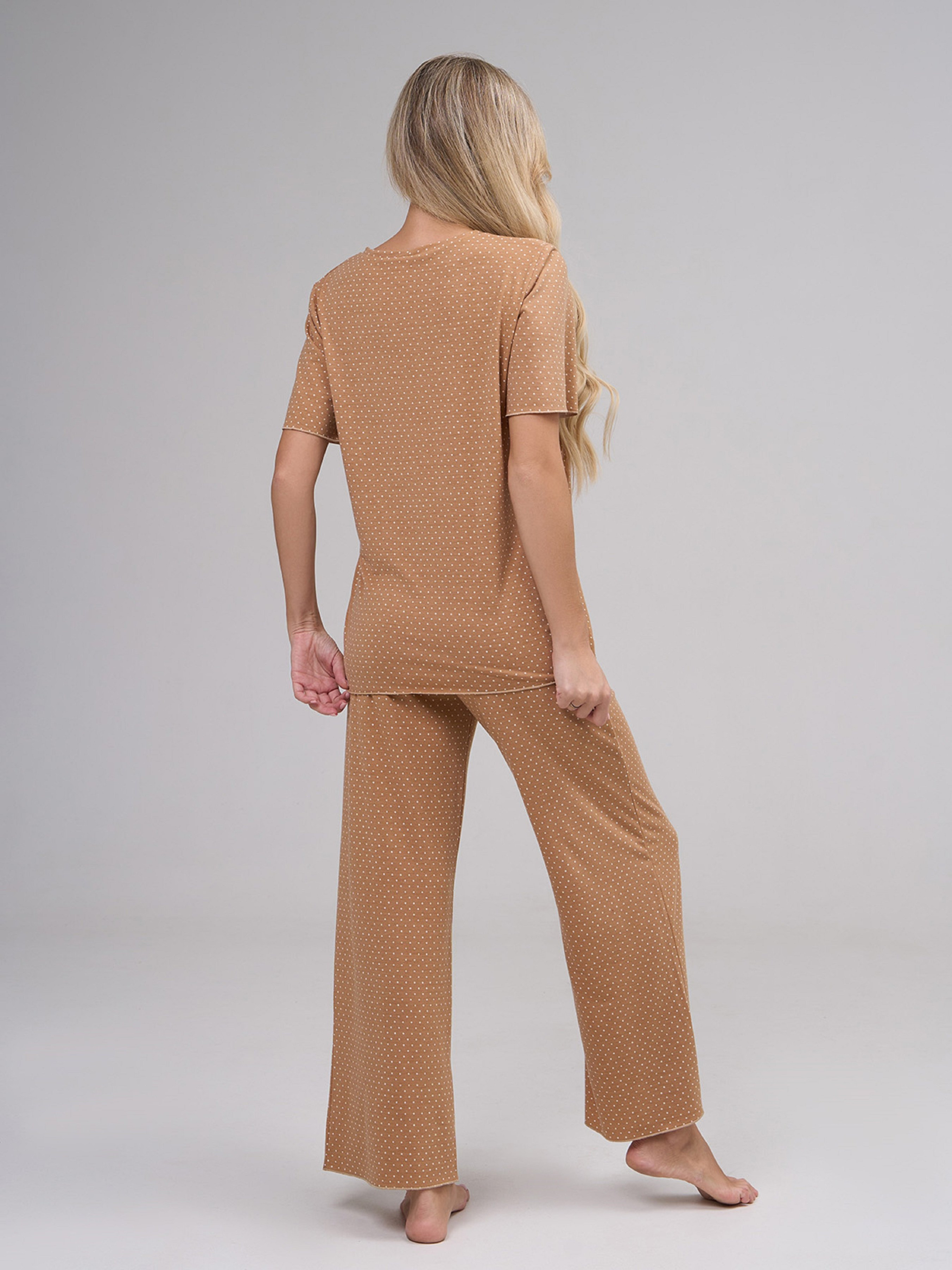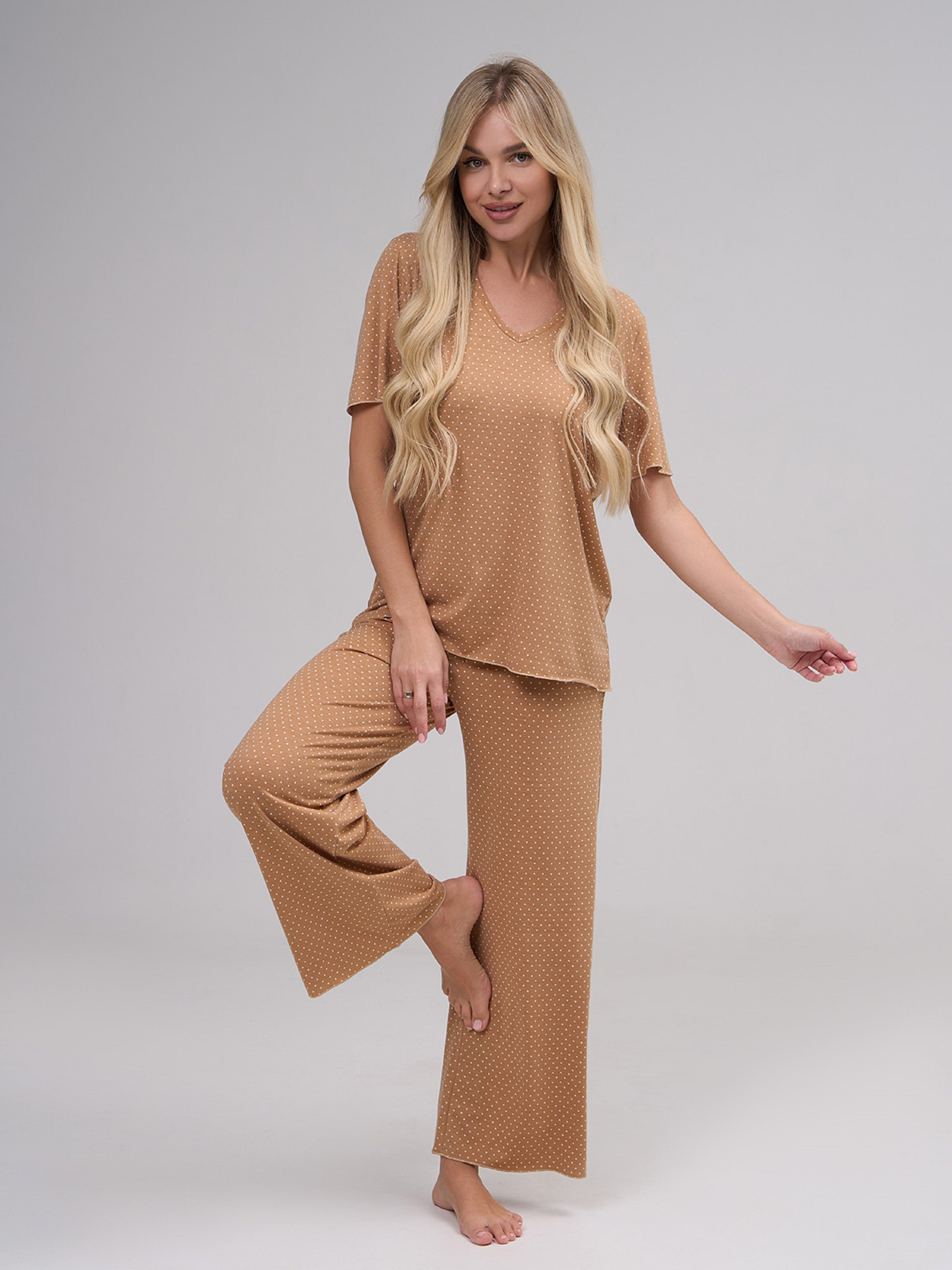 Бежевая брючная пижама с короткими рукавами, выполненная из вискозного трикотажа в горошек. Футболка с V-образной горловиной и прямым кроем. Брюки прямого кроя на резинке. Полуобхват: Футболка: Грудь: S (50), M (52), L (54), XL (56), Длина изделия - 64, Рукав - 23, Брюки: Талия: S (31-38), M (33-40), L (35-42), XL (37-44), Бедра: S (48), M (50), L (52), XL (54), Длина изделия - 97, Длина по внутреннему шву - 69, Ткань: Высокой эластичности.