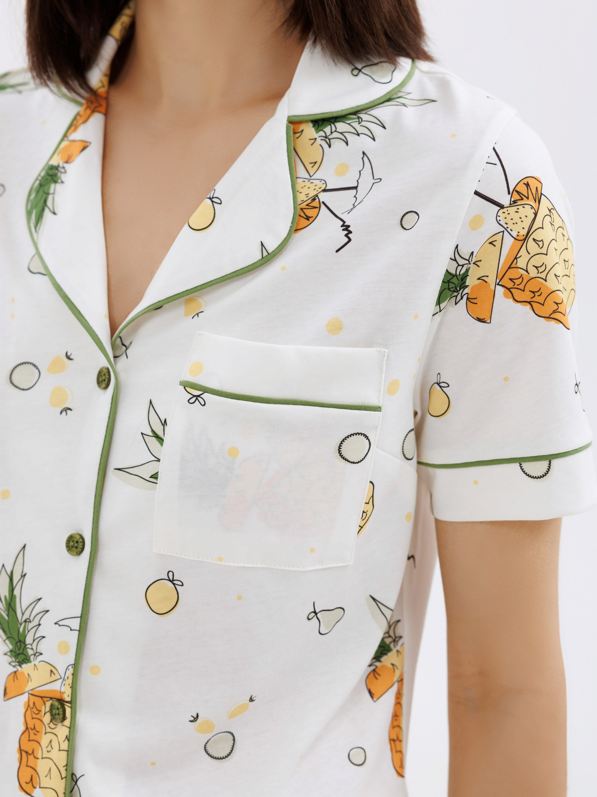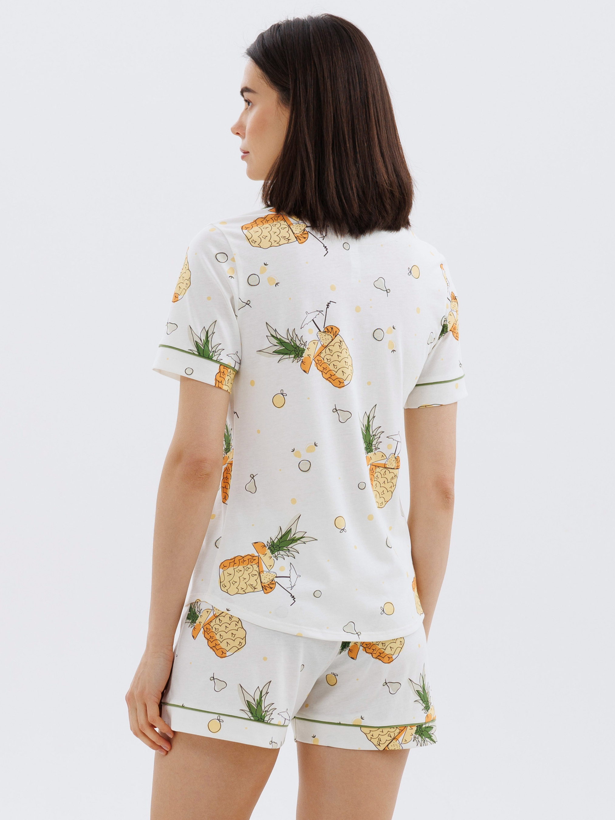 100% cotton. Піжама складається з сорочки та шорт, надаючи вам дивовижне поєднання свободи та стилю. Акцент на цій піжамі знаходиться у маленькій кишені на декольте, яка додає чарівності вашому вигляду. Виконана у білому відтінку, вона прикрашена веселими зображеннями ананасів, цитрусових та коктейлів, що додають їй особливого літнього настрою. Такий дизайн дарує відчуття легкості та безтурботності, роблячи піжаму ідеальним вибором для відпочинку та сну.