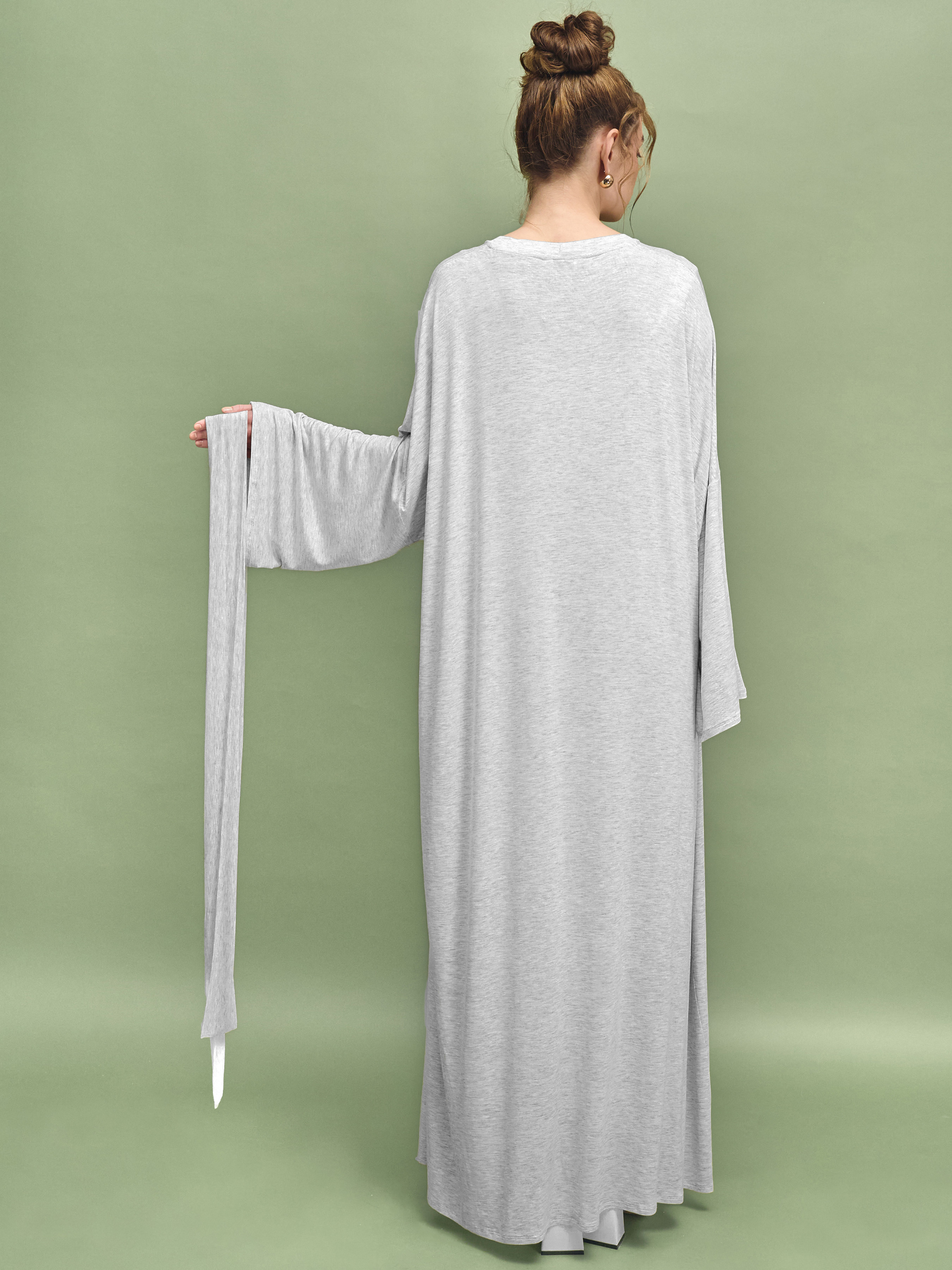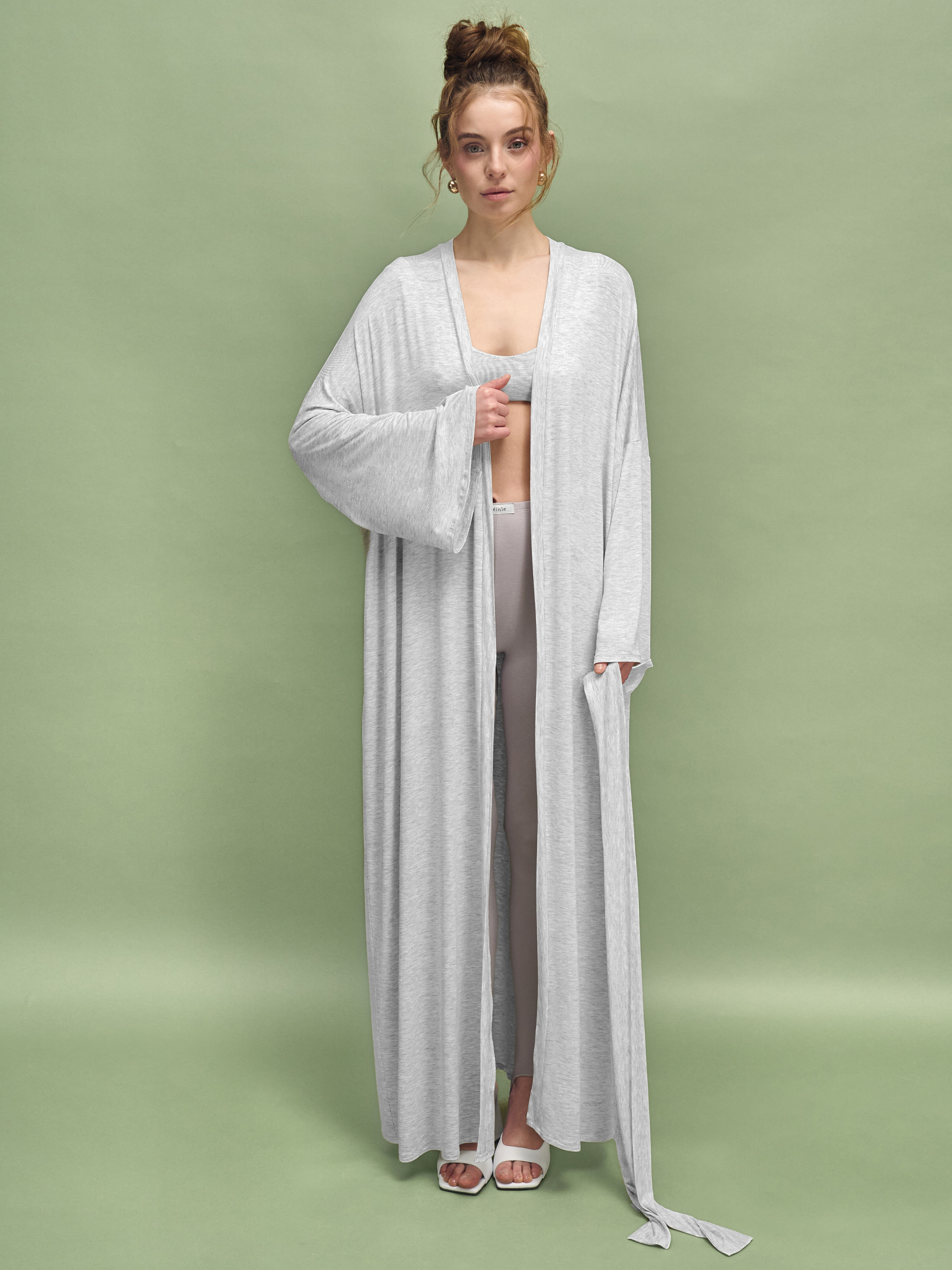 95% viscose, 5% elastane. Халат, который хочется накинуть после ванны перед медитацией или утром с еще теплой чашкой чая. Он не просто дополняет атмосферу, а создает состояние. В коллекции NUA эта модель задумана как ритуал покоя: для дома, спа, массажа, медленных утренников и тихих вечеров, когда тело имеет право отдыхать. Длинный халат макси с мягкой линией плеча и широкими рукавами хорошо струится вдоль тела. Силуэт легкий, пластичный, с поясом, который можно завязать или оставить раскрытым – в зависимости от настроения. В палитре NUA он представлен в естественных оттенках: серый меланж, серый и спокойный светло-зеленый. Эти цвета не перегружают, а успокаивают именно то, что нужно для домашнего пространства, медитаций или восстановления после насыщенного дня. Серый меланж – это о гладкости и мягком скольжении. Вискоза с эластаном создает легкое, почти шелковистое чувство на коже. Ткань деликатно струится вдоль тела, красиво ложится в движении и придает силуэту плавности. Она не тяготит, а будто повторяет каждый жест, сохраняя форму и аккуратный вид. Заказать халат NUA можно онлайн на нашем сайте. Купить – выбрать свой цвет, добавить в корзину и позволить себе чуть больше тишины каждый день. Оттенок ткани может иметь легкие отличия от изображения из-за особенностей фото и цветопередачи на различных устройствах.