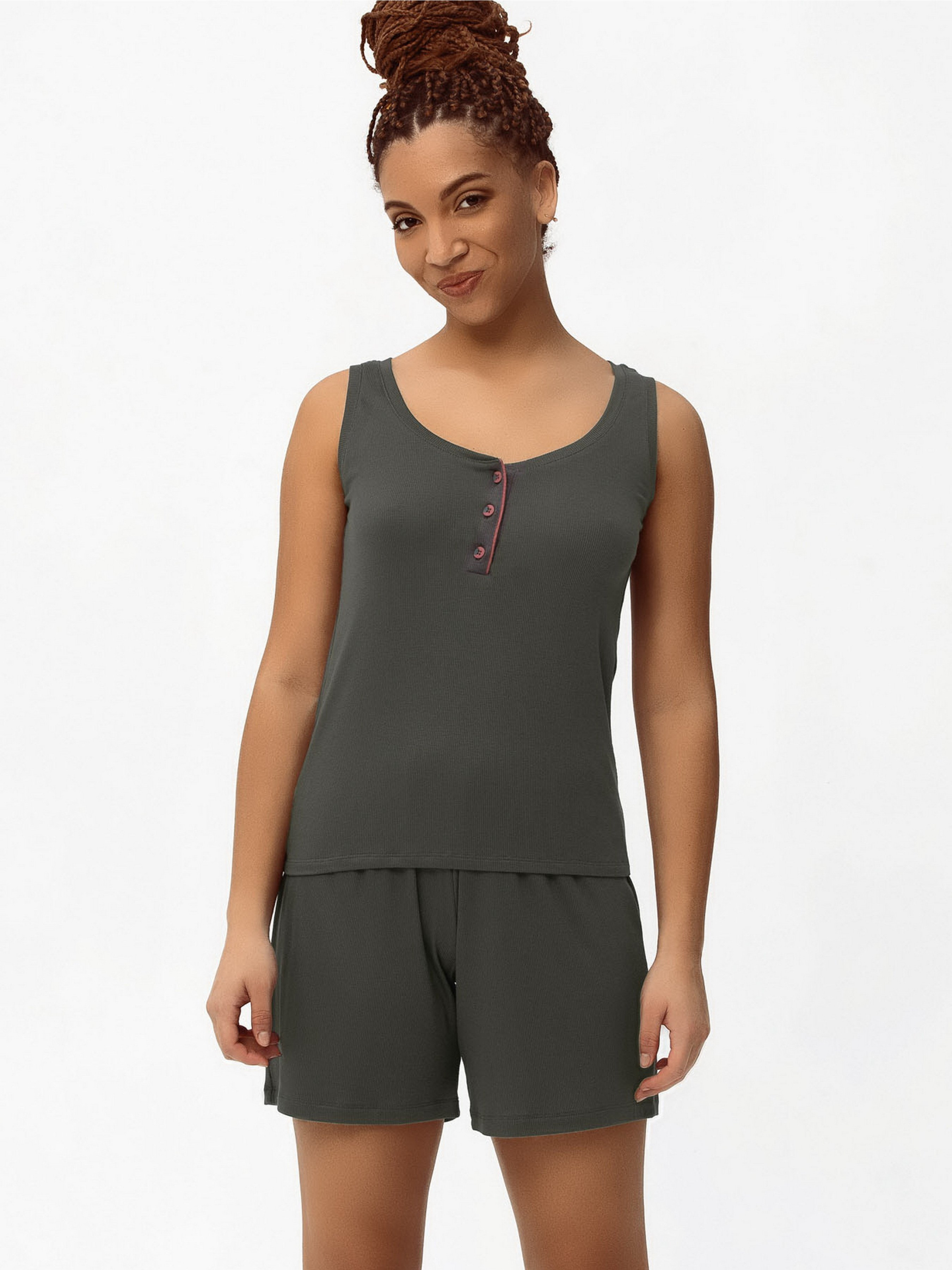 Комплект з колекції MIRRA, складається з майки на широкій бретелі та шорт. На майці декоративна застібка на ґудзик. Така маєчка дарує жіночому образу нових фарб і красиво виділяє плечі. Другим елементом комплекту є короткі шорти вільного крою. Комплект дуже зручний, пошитий з бавовни, ергономічний і акуратний. Відмінний вибір домашнього одягу на кожен день!