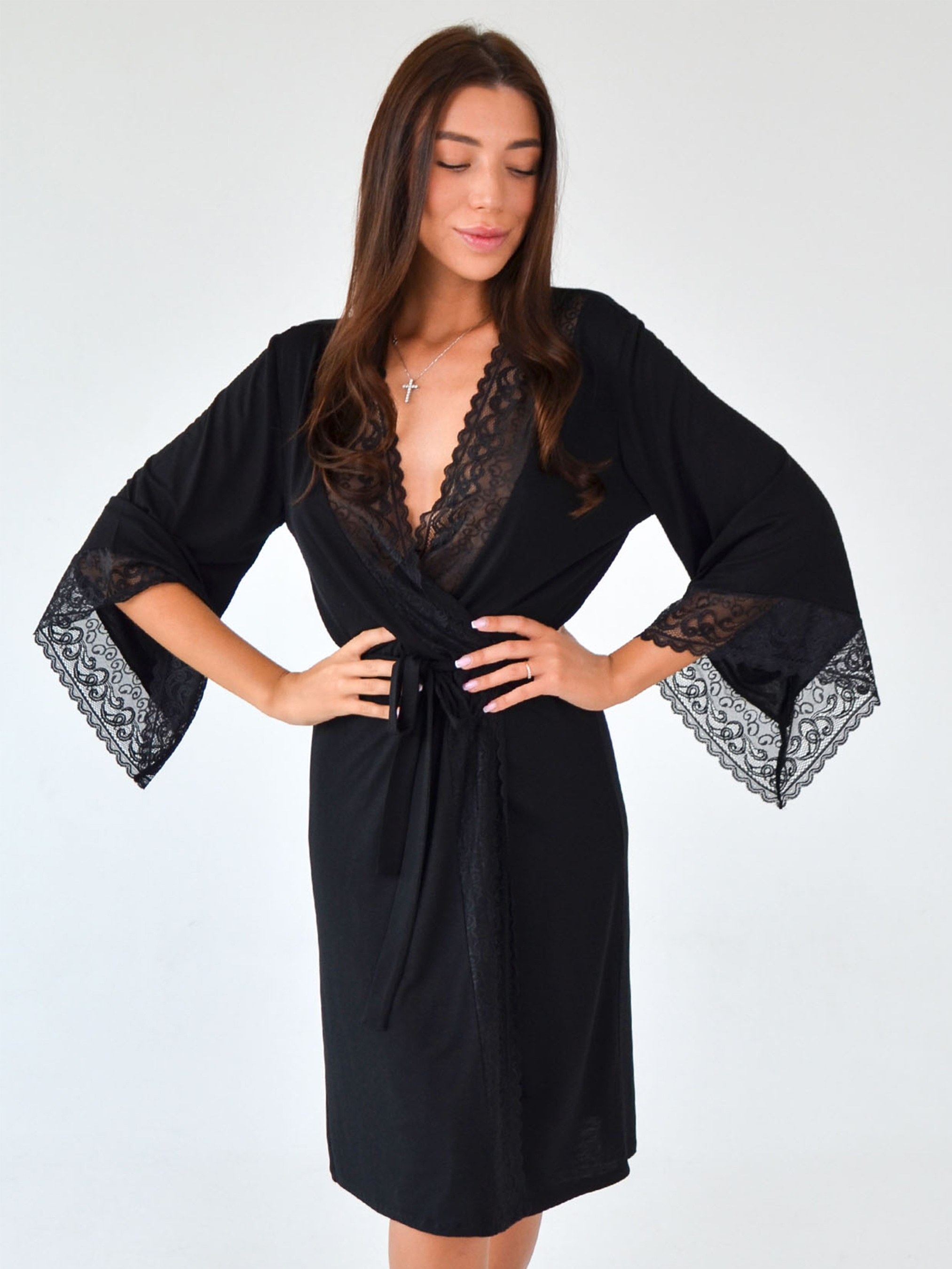 95% viscose, 5% elastaneВиглядати спокусливо і красиво не складно, якщо у вас є мереживний халат чорного кольору. Тонкий і невагомий як перо, він стане прикрасою для вашої фігури і не залишить байдужим ваше оточення. Темний колір виглядає загадково, сприяє романтиці і додає привабливості. Мереживо грає особливу роль - їм прикрашена зона декольте і рукав, що розширюється до низу. Довжина халата до коліна зав'язується поясом на талії.