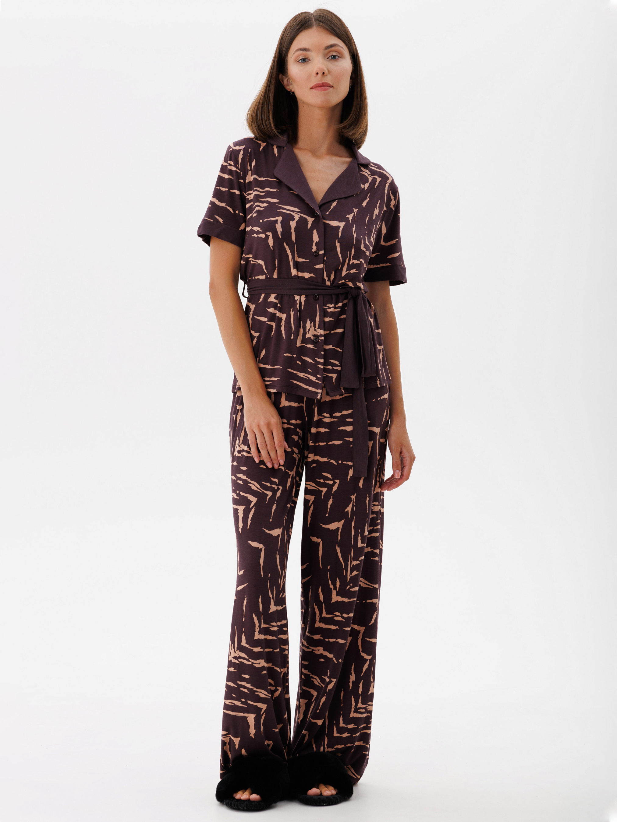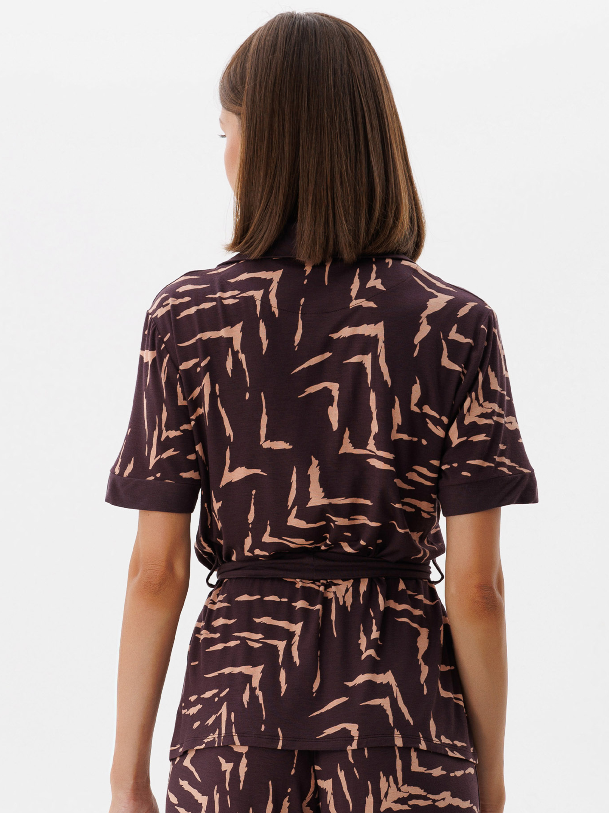 95% viscose, 5% elastane. Джемпер з поясом із коротким рукавом для затишного відпочинку вдома. Гарно пасує зі штанами цієї ж колекції та створює гармонійне поєднання. Мінімалістичний дизайн підкреслює ваш стиль і дарує комфорт.