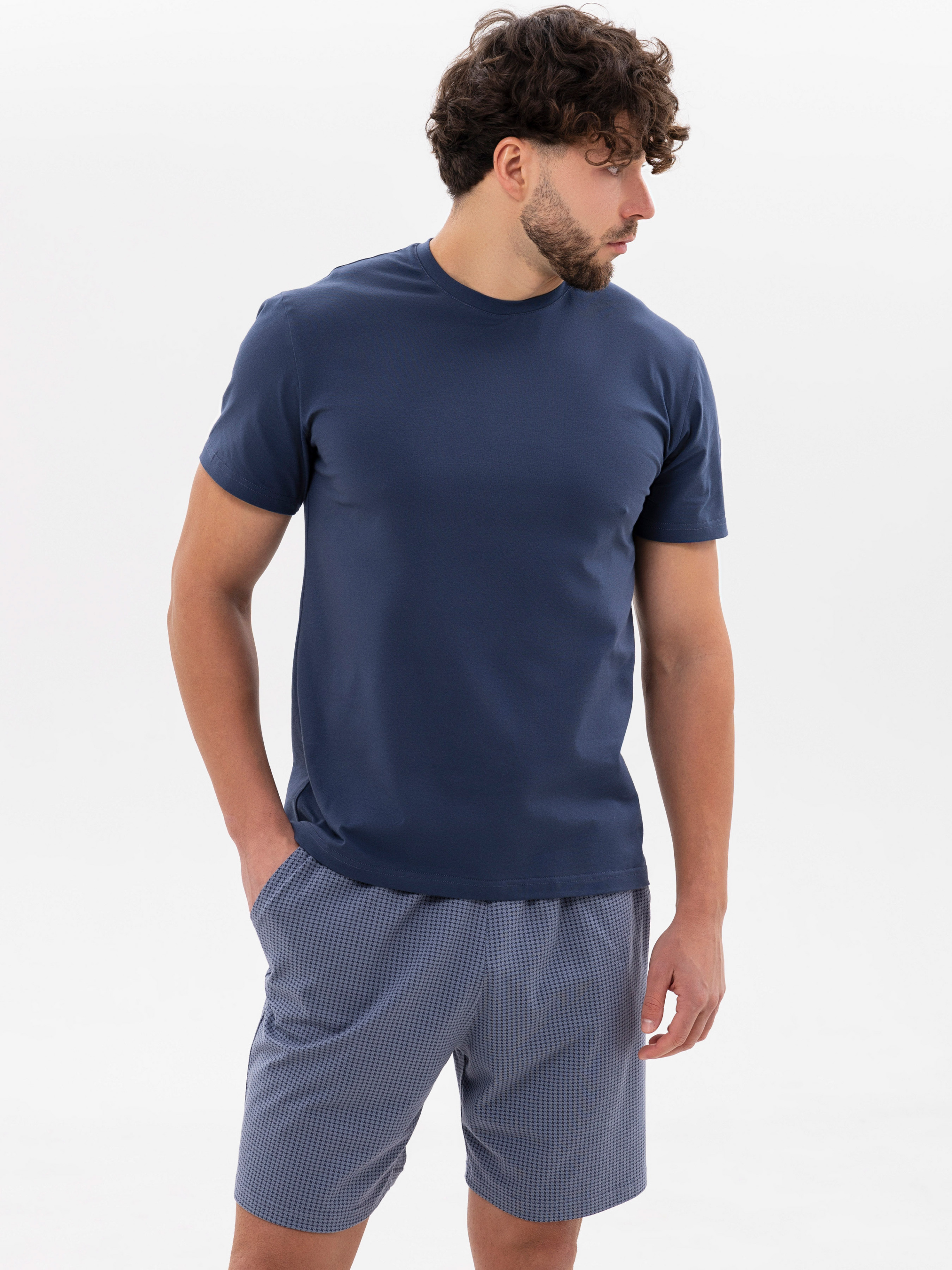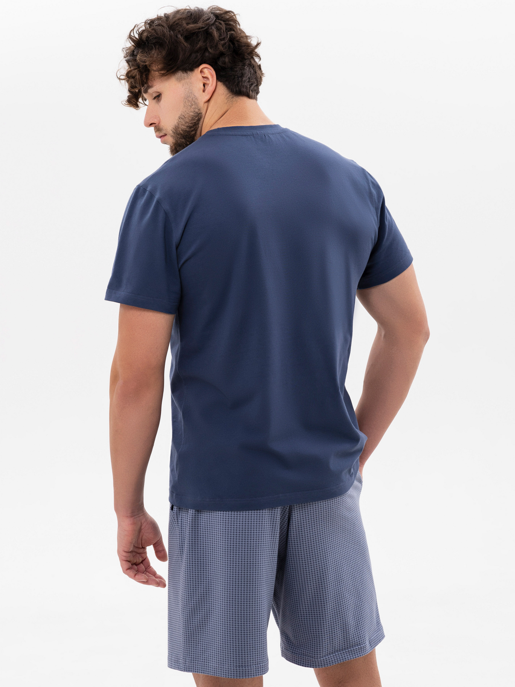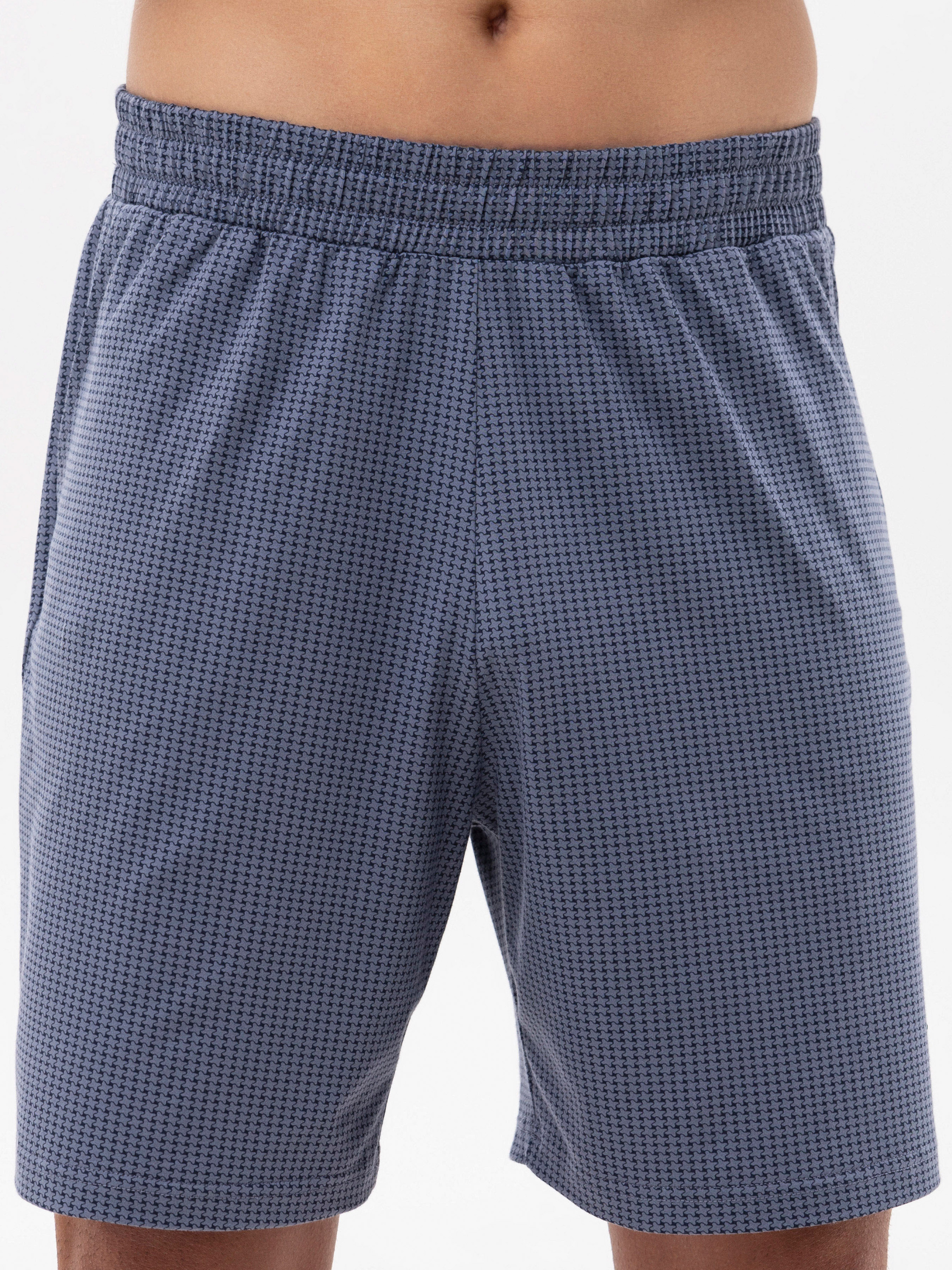 95% cotton, 5% elastane. Чоловіча піжама з бавовни поєднує затишок та естетику. Темно-блакитний верх виглядає стримано та стильно, а шорти з витонченим принтом роблять комплект універсальним. Тканина м’яка, приємна до шкіри, не парить і не обмежує рухів.