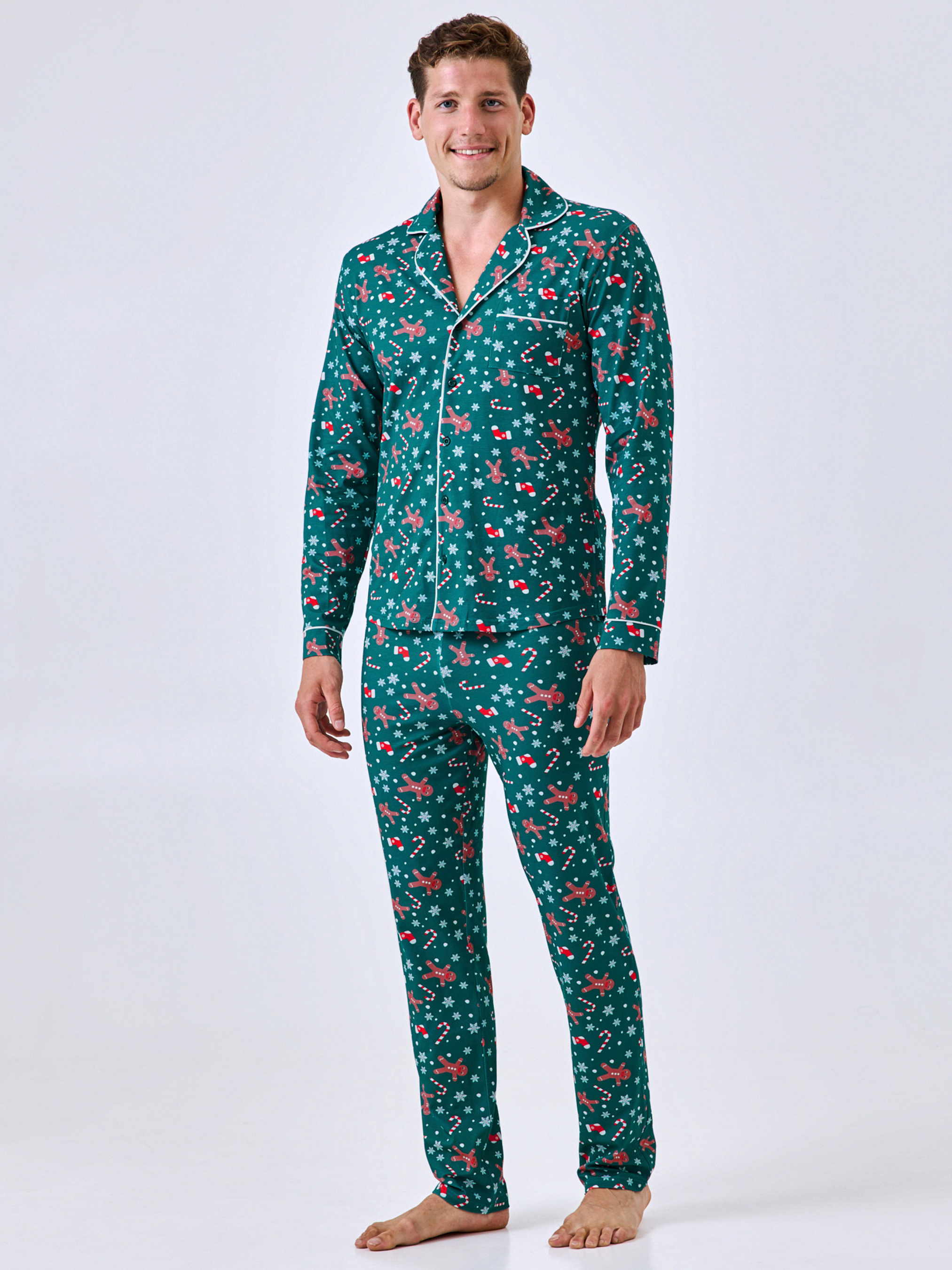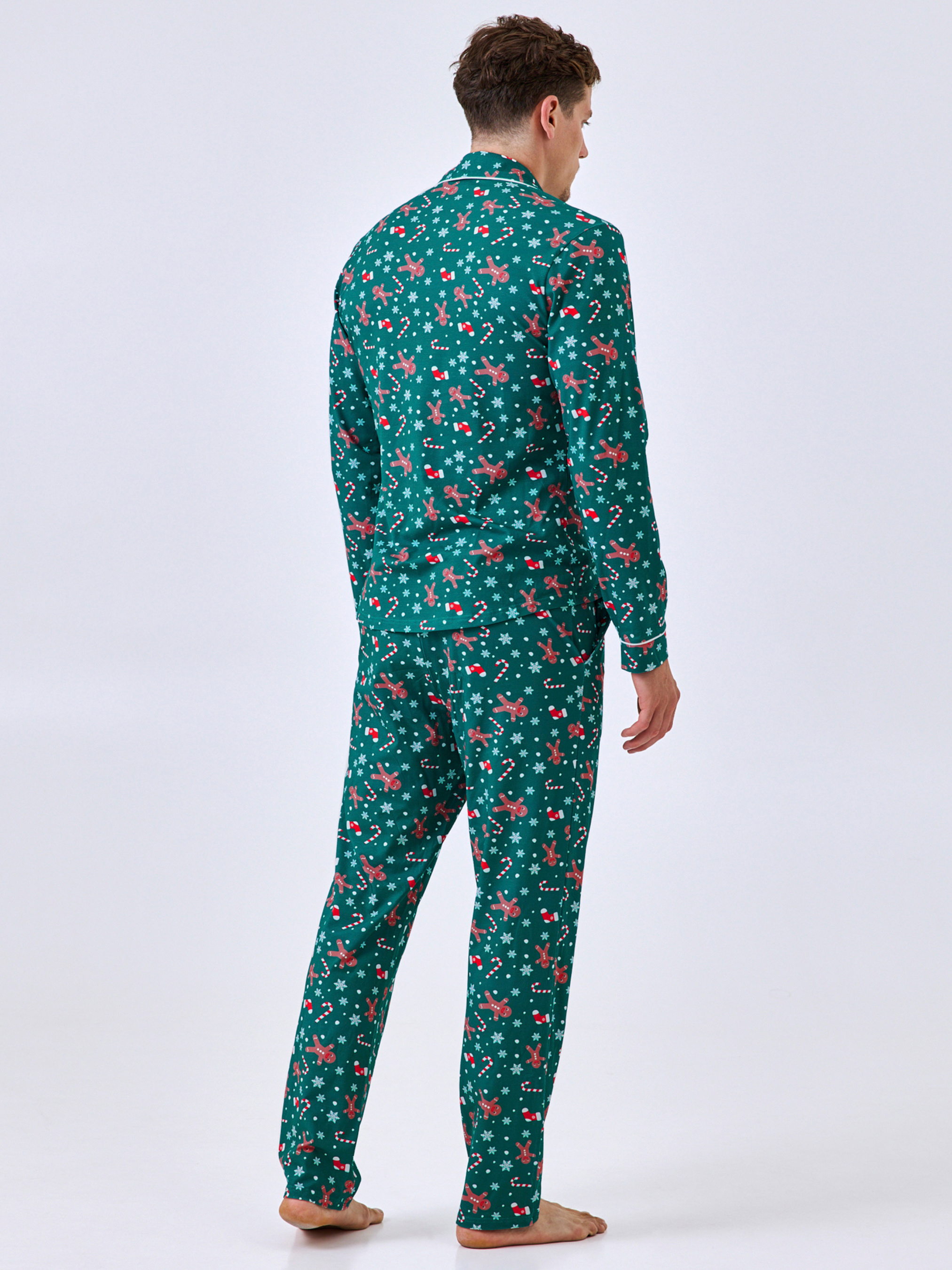 95% cotton, 5% elastane. Святковий настрій у зручному форматі. Ця піжама створена для тих, хто цінує комфорт і стиль навіть удома. Виготовлена з м’якої бавовни, вона дихає, приємно торкається шкіри та забезпечує свободу рухів. Натуральна тканина не парить і гарантує комфорт у будь-яку пору року. Класична сорочка на ґудзиках і прямі штани поєднують охайність і практичність. Контрастний білий кантик підкреслює форму, а яскравий зелений колір із новорічним принтом – пряники, сніжинки й цукерки – створює святкову атмосферу, додаючи образу грайливості й тепла. Піжама ідеально підходить для сну, відпочинку вдома чи затишних вечорів у колі родини. Ви можете замовити та купити чоловічу піжаму з бавовни в зеленому кольорі – і відчути поєднання комфорту, стилю та святкового настрою.