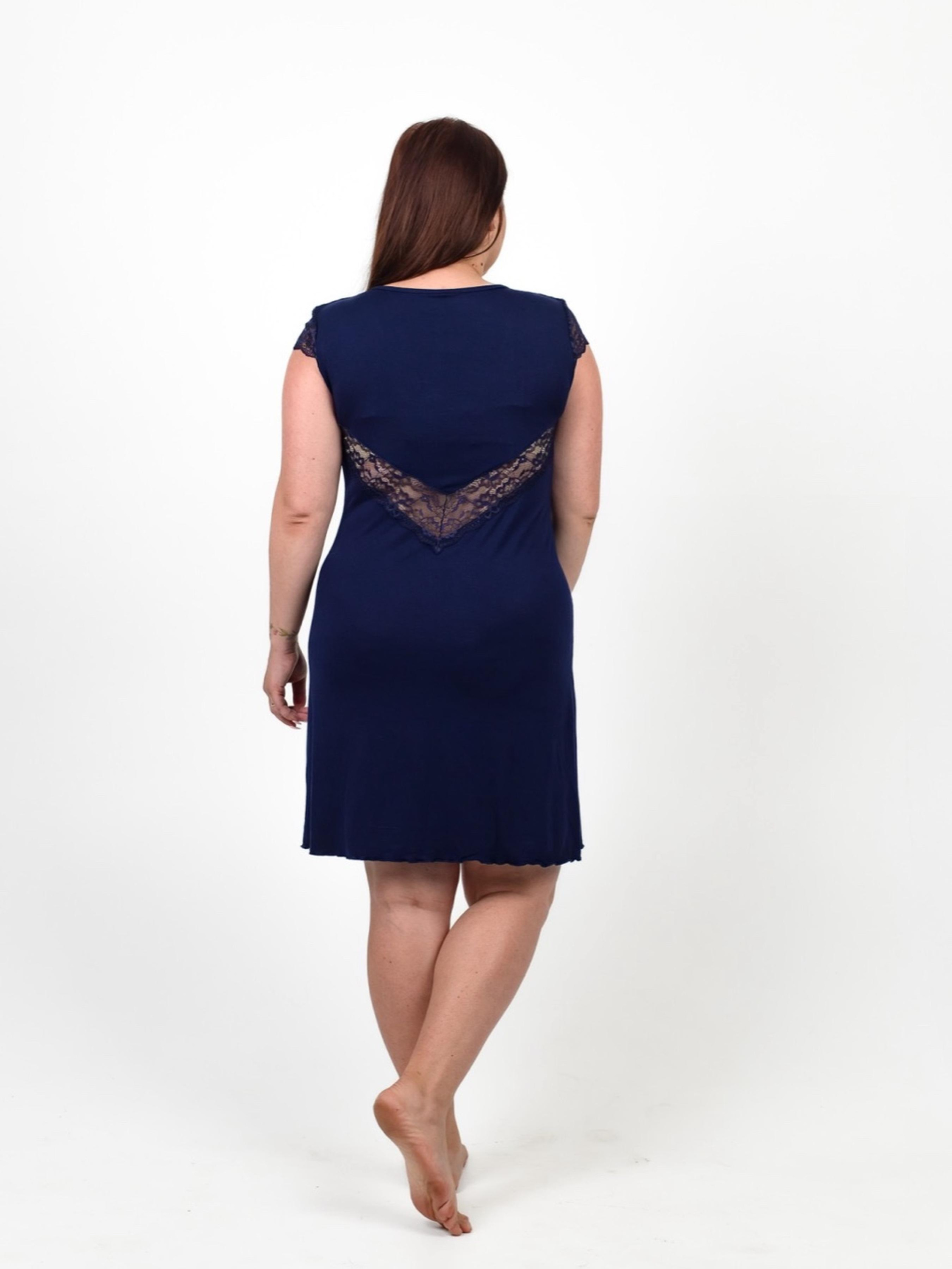 Эта домашняя рубашка выполнена в темно-синем цвете из вискозного полотна, легкой и приятной к телу. Модель имеет короткие рукава и V-образный вырез со вставками из кружева спереди и сзади, что придает образу женственности и изящества. Длина рубашки- до колен, крой прямой обеспечивающий свободу движения. Уход за изделием: 1.Вискозы подходит ручная или машинная стирка на деликатном режиме 2.Не отбеливать, сушить без отжима. 3.Если вы стираете вручную, не выкручивайте вискозу, дайте изделию стечь естественным образом, затем сушите в расправленном виде. 4.Праты вискозной ткани рекомендуется при температуре указанной на этикетке (в основном это не более 30°С) 5.Использовать мягкие моющие средства (на кондиционеры при стирке, вискоза реагирует хорошо, приобретая дополнительную мягкость и шелковистость)