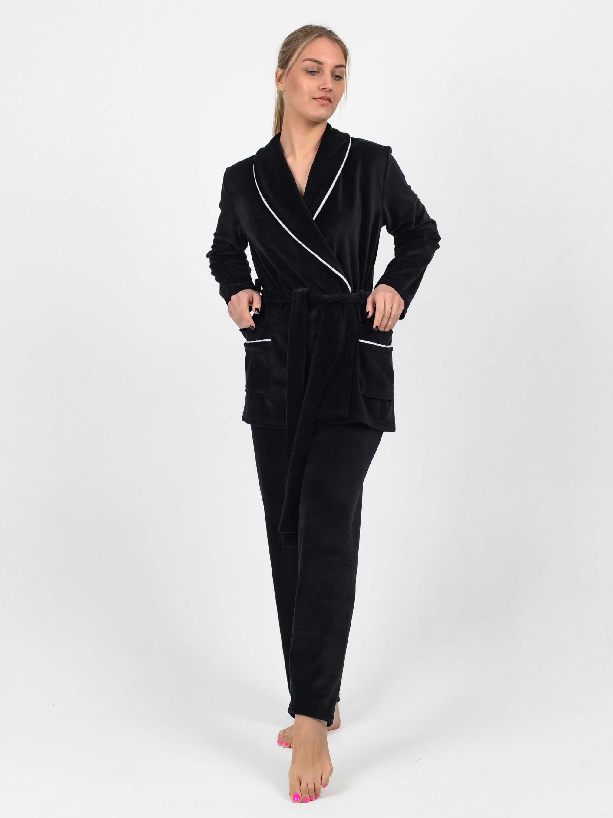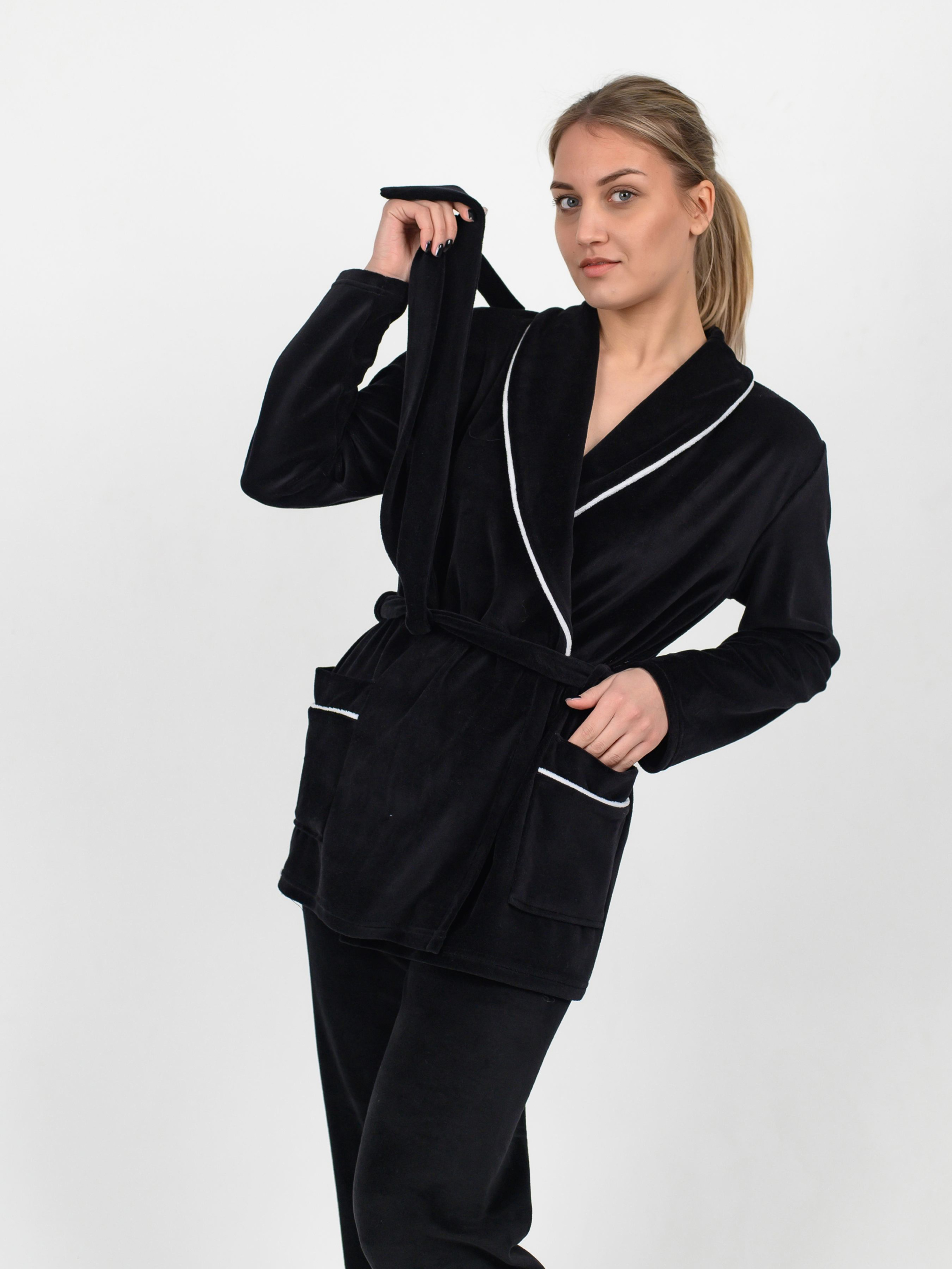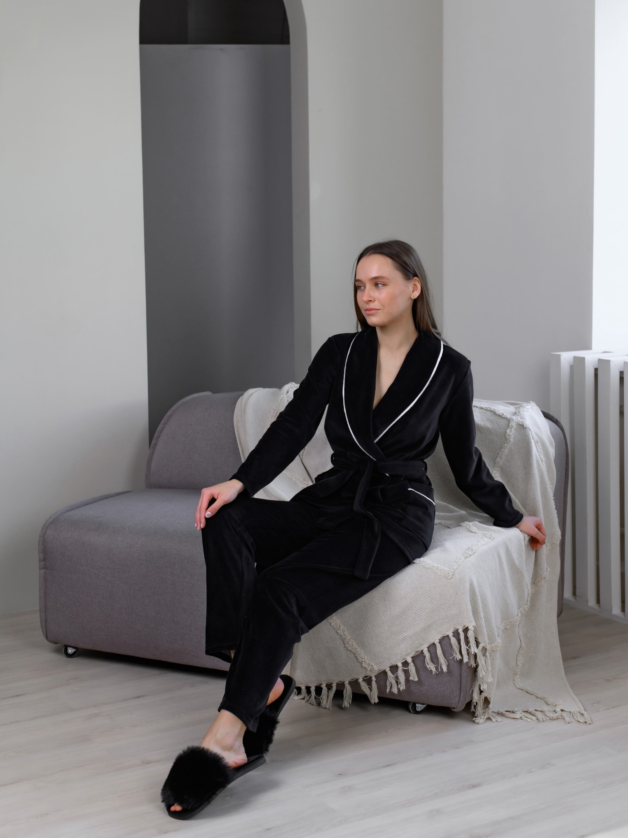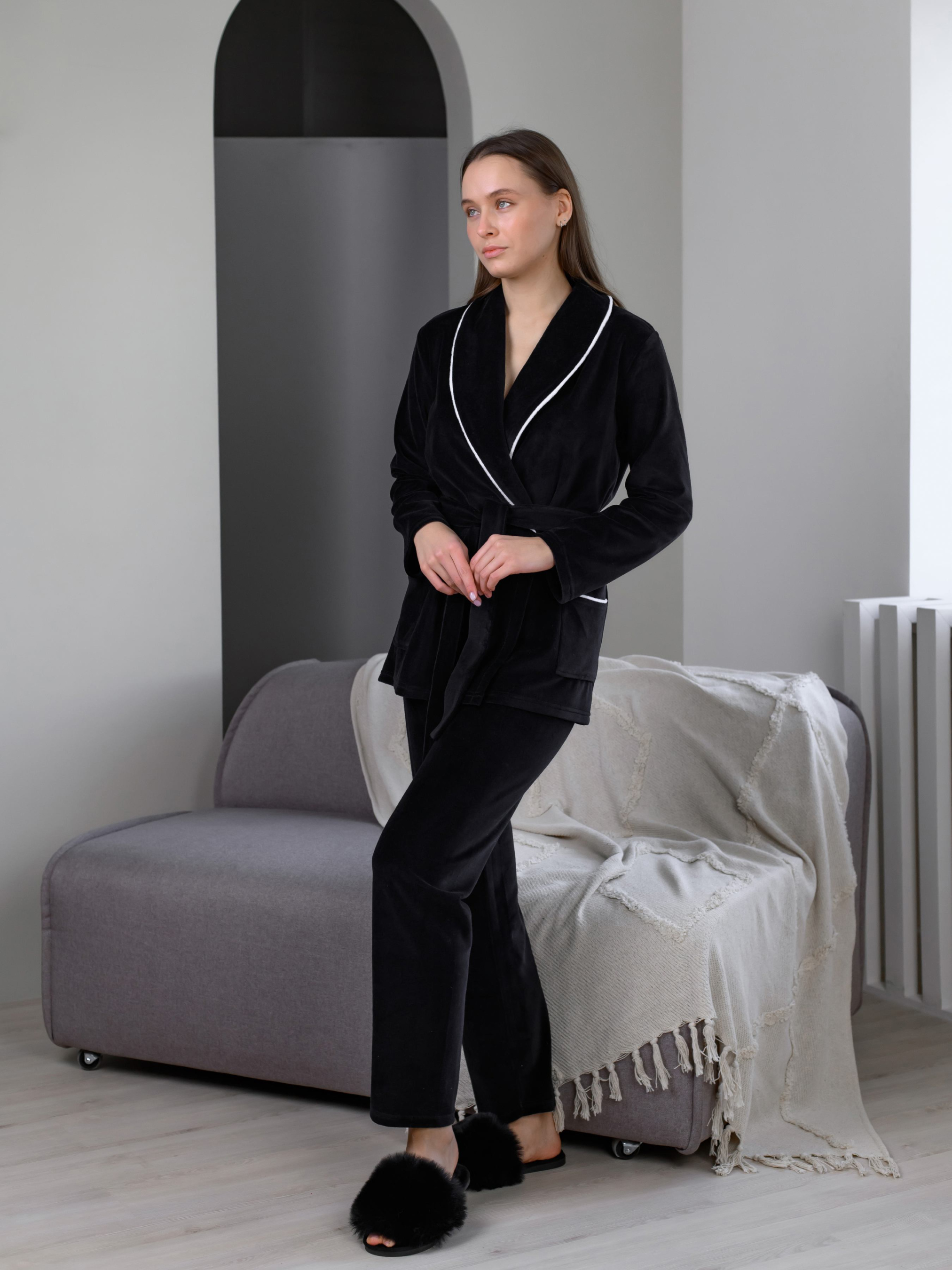 Красивая, мягкая, удобная пижама из материала велюр-плюш на хлопковой основе. В комплекте короткий халат на запах с воротом и брюки. Пижаму можно использовать в качестве домашнего костюма, в котором вы будете чувствовать себя комфортно и тепло занимаясь домашними делами. Как ухаживать за одеждой из велюра? 1. Стирка при тридцати градусах в машинке. Как и любой «ворсистый» материал, велюр лучше не подвергать воздействию высоких температур. 2. Если вы стираете вручную, избегайте долгого замачивания – вода не лучше всего влияет на структуру волокон. 3. Выбирайте мягкий порошок для цветного белья или специальные шампуни для ворсистых тканей. 4. Исключите из ухода за велюром все то, что включает в себя хлор или отбеливающие частицы. 5. Такая ткань отлично сохраняет форму и не мнется, а потому гладить ее не рекомендуется вовсе – а если и гладить, то с изнаночной стороны.