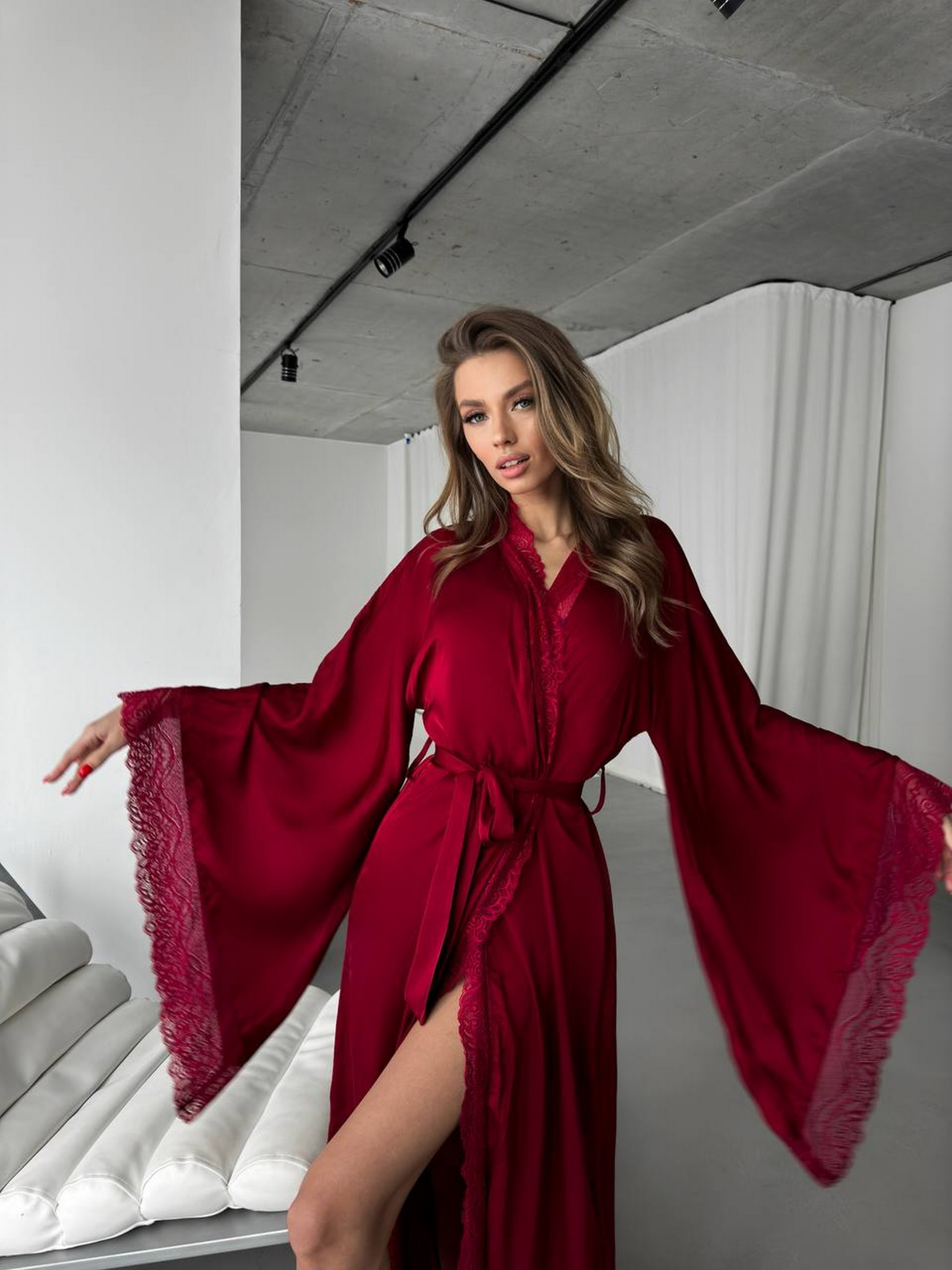 Эффектный халат выполнен из шелка и дополнен изысканным кружевом, придающим образу нежности, женственности и роскошному виду. Таблица размеров: S: грудь 86-96, бедра 86-97 см М: грудь 97-105, бедра 97-105 см Товар обмену и возврату не подлежит!