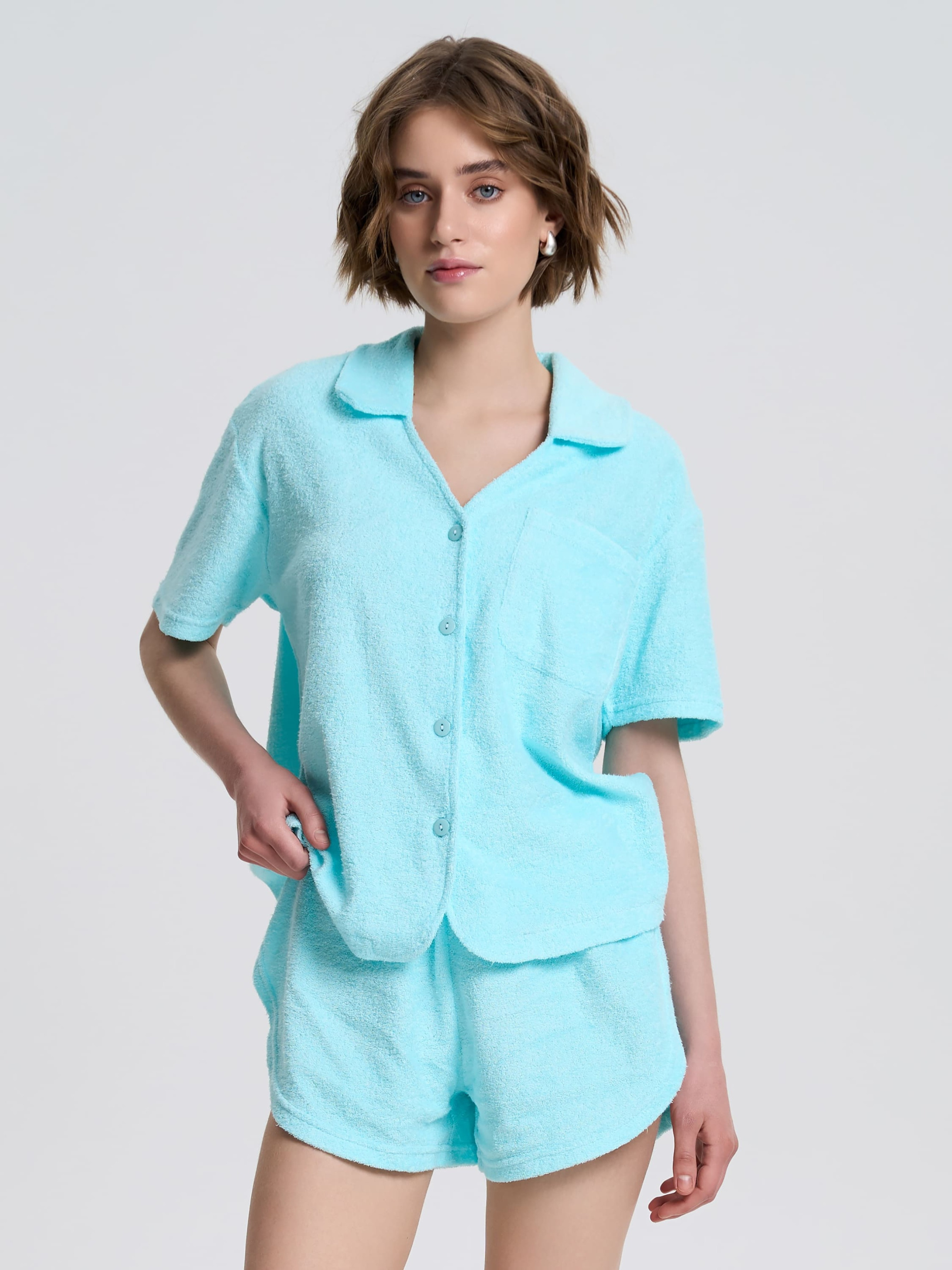Женская пижама из мягкой махровой ткани – идеальный выбор для комфортного отдыха и сна. Комплект состоит из рубашки свободного кроя и шорт на эластичном поясе. Рубашка имеет классический отложной воротник, короткие рукава и удобную застежку на пуговицы. Небольшой накладной карман на груди подчеркивает стильность модели. Шорты с мягким поясом и шнурком обеспечивают комфортную посадку, а фигурный крой придает легкость и свободу движений. Благодаря приятной на ощупь махровой ткани пижама отлично пропускает воздух, сохраняя чувство уюта и тепла. Идеально подходит для домашнего ношения и комфортного сна. Материал махра – это ткань с мелким ворсом на поверхности, созданная на основе высококачественного натурального хлопка. Она имеет плотную структуру, прочна и устойчива к износу, хорошо сохраняет цвет после стирки. Благодаря хлопку в составе, махровая ткань хорошо поглощает влагу и пропускает воздух. Высококачественная хлопковая махра гарантирует мягкость за счет приятного на ощупь ворса. Хорошо держит цвет и не склонна к деформации. За счет текстуры и средней плотности отлично драпируется. Рекомендации по уходу:рекомендуется стирать вручную при низкой температуре до 30°C. Избегать сушки под прямыми солнечными лучами. Отжимать на оборотах не выше 800. Сушите при низкой температуре для сохранения мягкости и пушистости ворса.