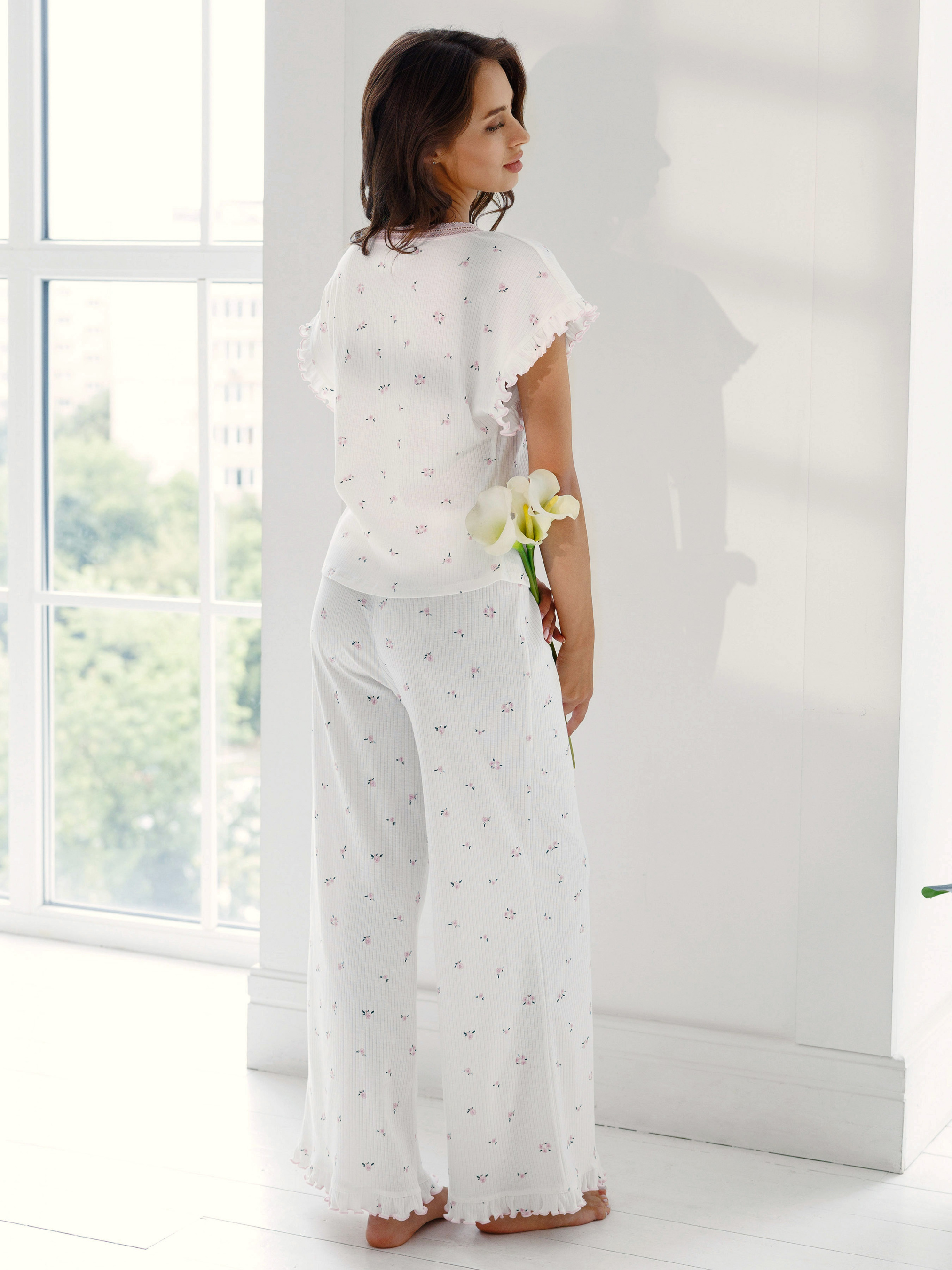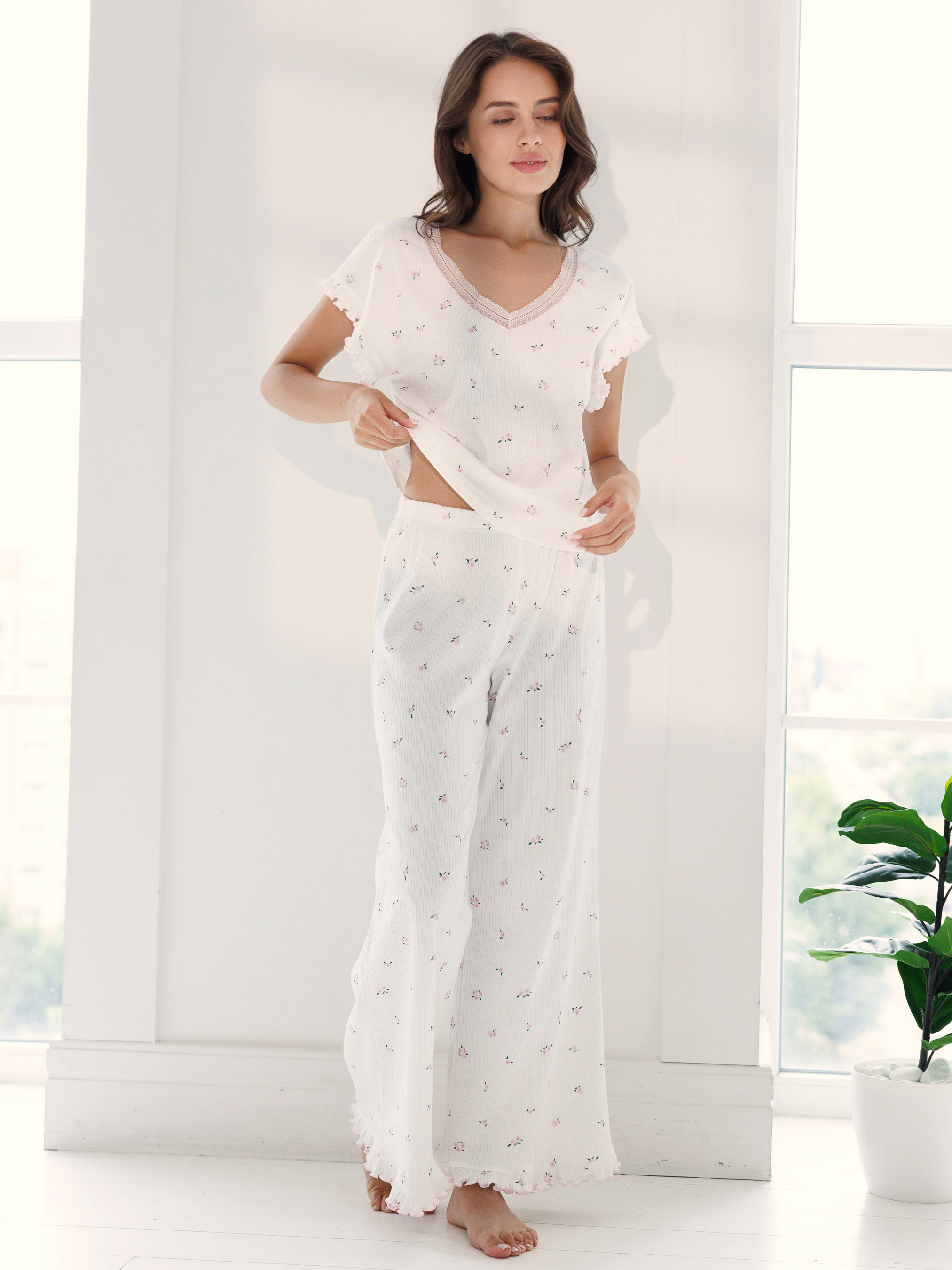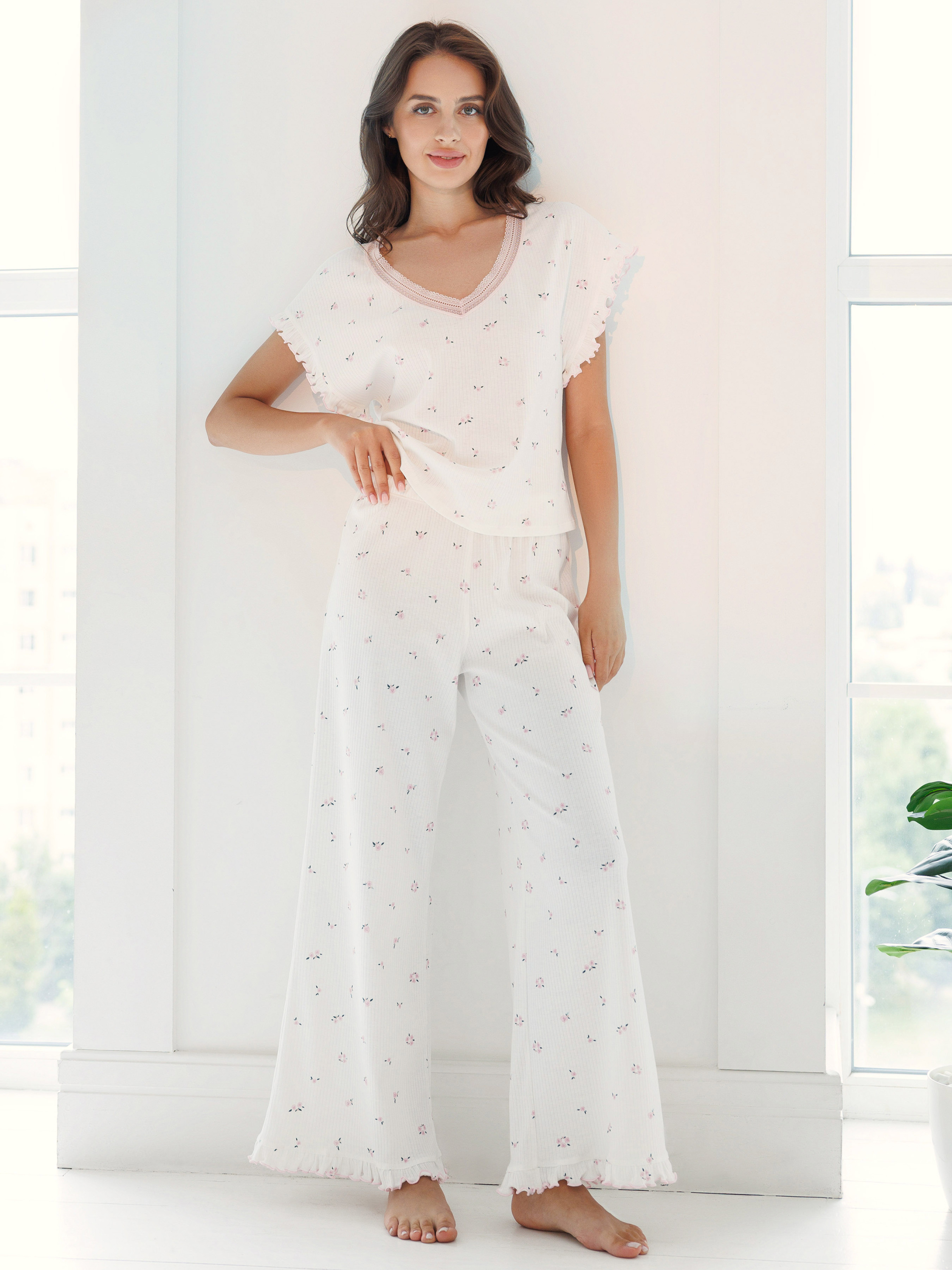 100% cotton. Ідеальний варіант, коли хочеться більше стилю та класичного шарму - піжама з футболкою та широкими штанами. Пряма футболка з V-подібним вирізом і мереживом гарно лягає по фігурі, не сковує рухів. Довгі прямі штани з білої тканини з дрібним квітковим принтом подовжують силует і дають витончений, романтичний та ненав’язливий образ. Ніжний квітковий малюнок і хвилясті краї додають комплекту мрійливі нотки та романтичний лад. Хоча це і базовий повсякденний жіночий одяг для сну та відпочинку, але він вміє створити правильний настрій! Натуральна бавовна м’яко огортає тіло, не парить і дозволяє розслабитися після насиченого дня. У такій піжамі приємно проводити довгі вечори вдома, дивитися фільми, читати, готувати сніданки на вихідних. Ця жіноча піжама стане вашим базовим комплектом як на прохолодні ночі так і на міжсезоння. Вона поєднує практичність довгих штанів і ніжний, квітковий настрій колекції РОЗКВІТАЙ. У ній комфортно зустрічати гостей, працювати з дому чи просто відпочивати. Якщо ви шукаєте піжаму з квітковим принтом, яка виглядає акуратно та сучасно, такий комплект можно купити онлайн на нашому сайті - для себе чи в подарунок. Обирайте потрібний розмір, замовляйте та отримуйте гарний настрій на кожен день з нашим жіночим домашнім одягом!