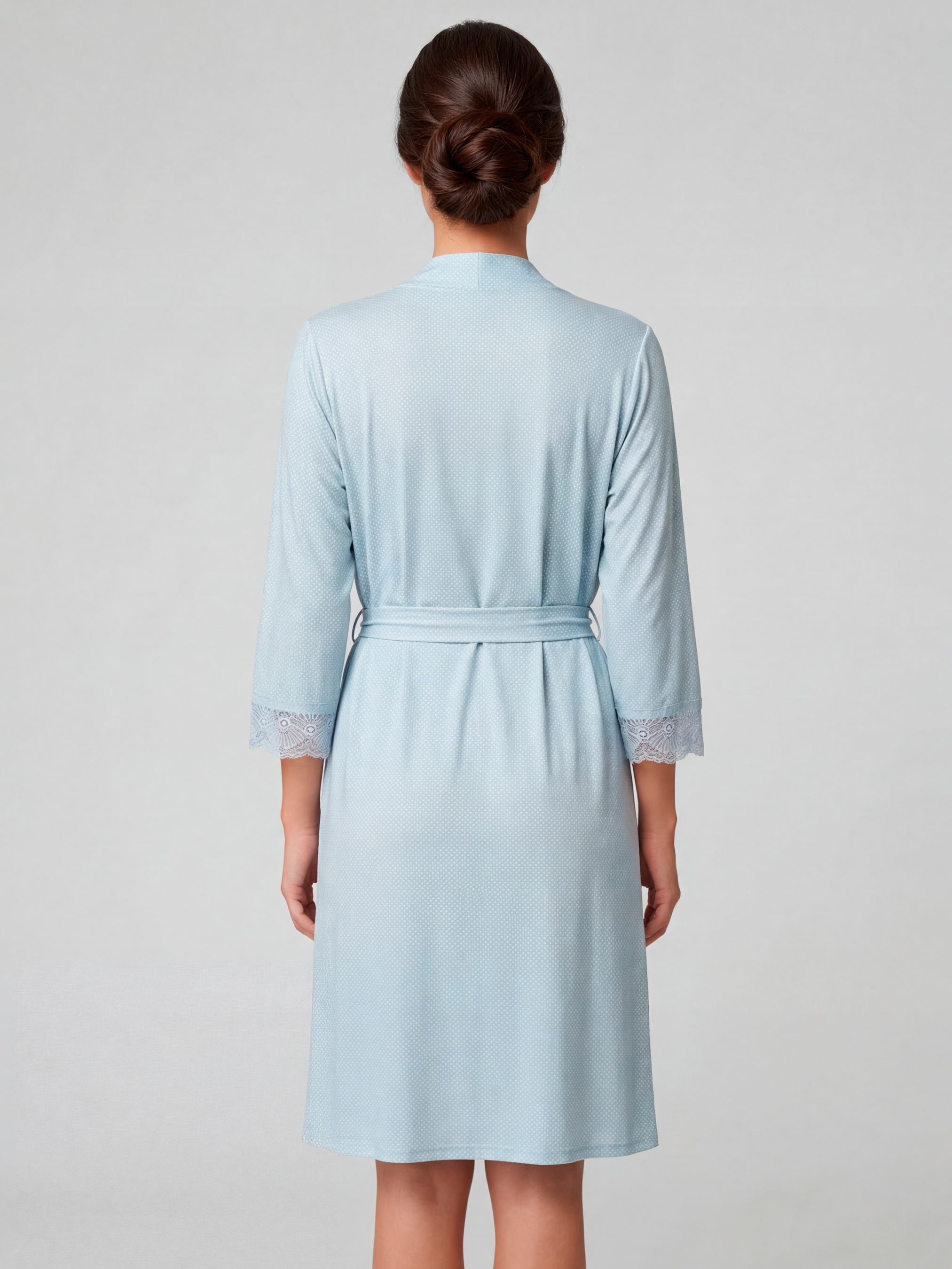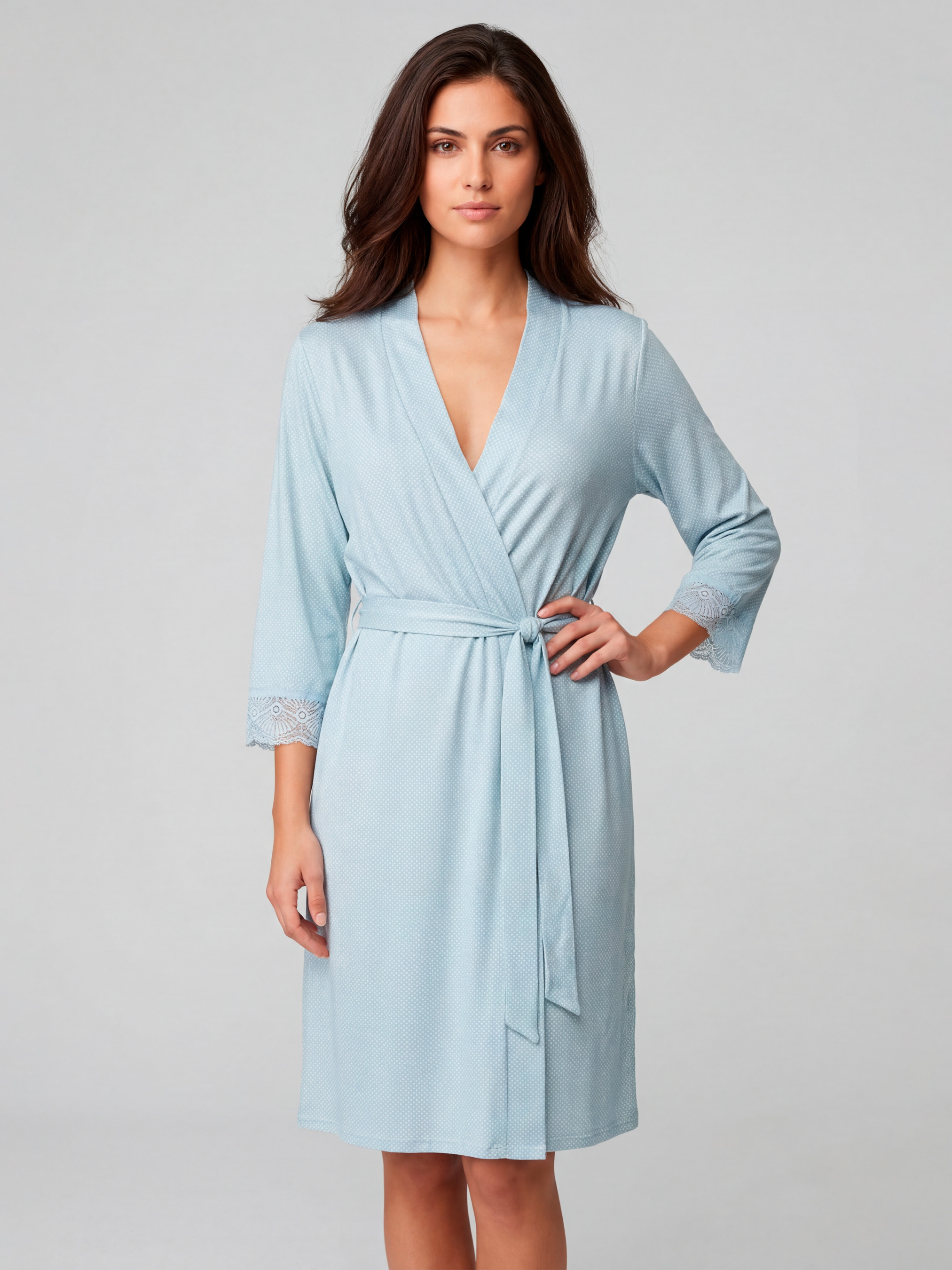 95% cotton, 5% elastane. Домашнее утро чувствуется совсем иначе, когда рядом есть изысканный халат, в который приятно завернуться сразу после сна или душа. Эта модель создает уютное и спокойное чувство, без спешки и лишних хлопот. Халат домашний имеет комфортный прямой силуэт, длину до колена и рукава 3/4, придающие еще большее удобство в ежедневной носке. Запах с пояском позволяет красиво зафиксировать посадку по фигуре, а кружево на манжетах делает образ более деликатным и женственным. Нежный голубой цвет в мелкий горошек смотрится легко, свежо и очень кстати для домашней одежды для женщин. Халат из хлопка отлично подходит для утренних сборов, отдыха вечером, спокойных выходных дома и уютных пауз в течение дня. Он не сковывает движения, обеспечивает комфорт и помогает сохранять ощущение воздушности в домашних моментах. Это женская домашняя одежда, которую хочется носить каждый день, поэтому стоит заказать и купить для красивого и удобного быта. Обратите внимание, что оттенок ткани и принт могут иметь незначительные отличия от изображения на фото из-за особенностей освещения во время съемки или индивидуальных настроек экрана вашего устройства.