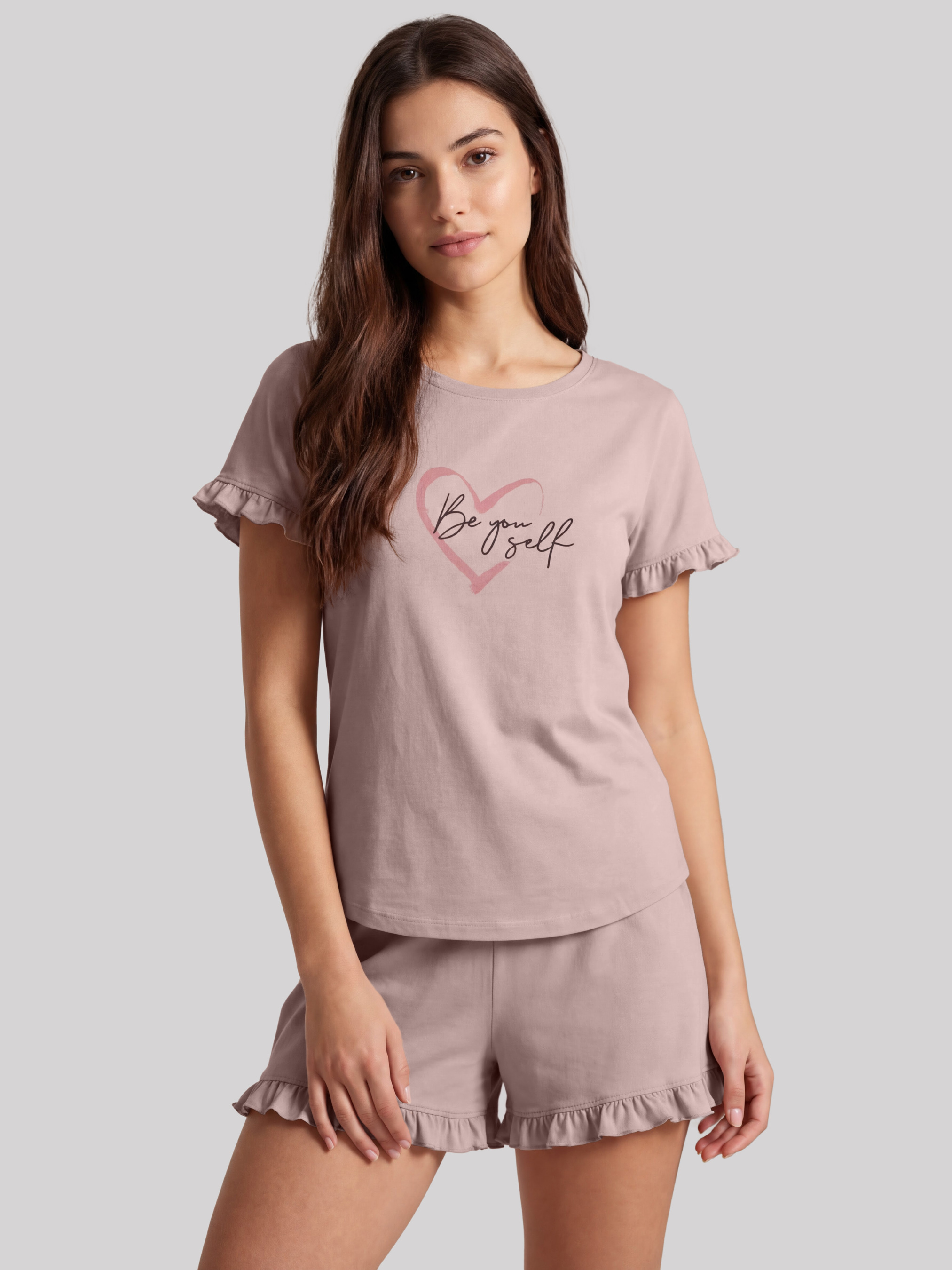 95% cotton, 5% elastane. Пижама женская кофейного цвета – это сочетание современного дизайна и природного комфорта для домашнего ритма. Теплый оттенок кофе смотрится глубоко и стильно, создает атмосферу покоя и гармонии, подчеркивает женственность без лишней яркости. Такой цвет универсален, легко сочетается с другими вещами домашнего гардероба и остается актуальным вне зависимости от сезона. Комплект состоит из футболки с коротким рукавом и шорт с мягкой посадкой. Легкие рюши по краям придают образу нежности, а деликатный принт с сердцем формирует акцент, что делает дизайн выразительным и одновременно сдержанным. Женская пижама из хлопка приятна к телу, хорошо пропускает воздух и подходит для сна, отдыха и медленных утренников дома. Хлопковая женская пижама станет удачным выбором для тех, кто ценит натуральный состав, комфортный крой и продуманный стиль. Если вы ищете пижаму женскую кофейную окраску для себя или на подарок, эту модель легко заказать и купить онлайн уже сейчас. Оттенок ткани может иметь легкие отличия от изображения из-за особенностей фото и цветопередачи на различных устройствах.