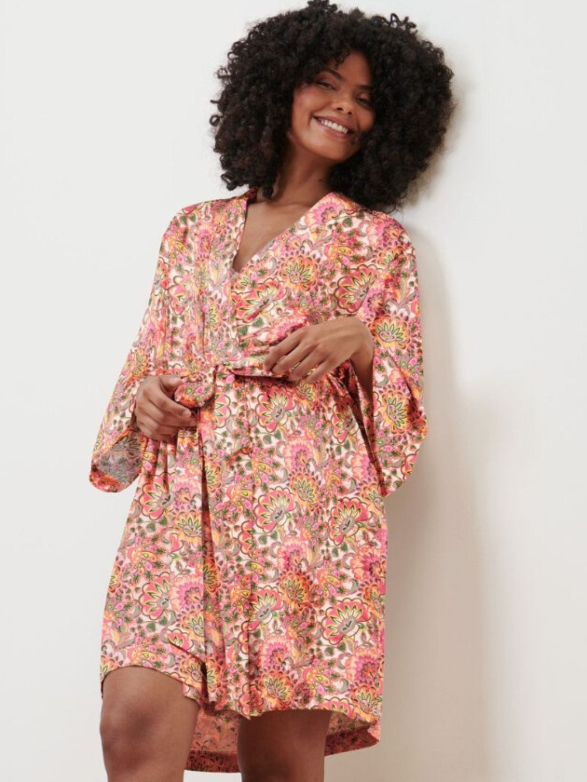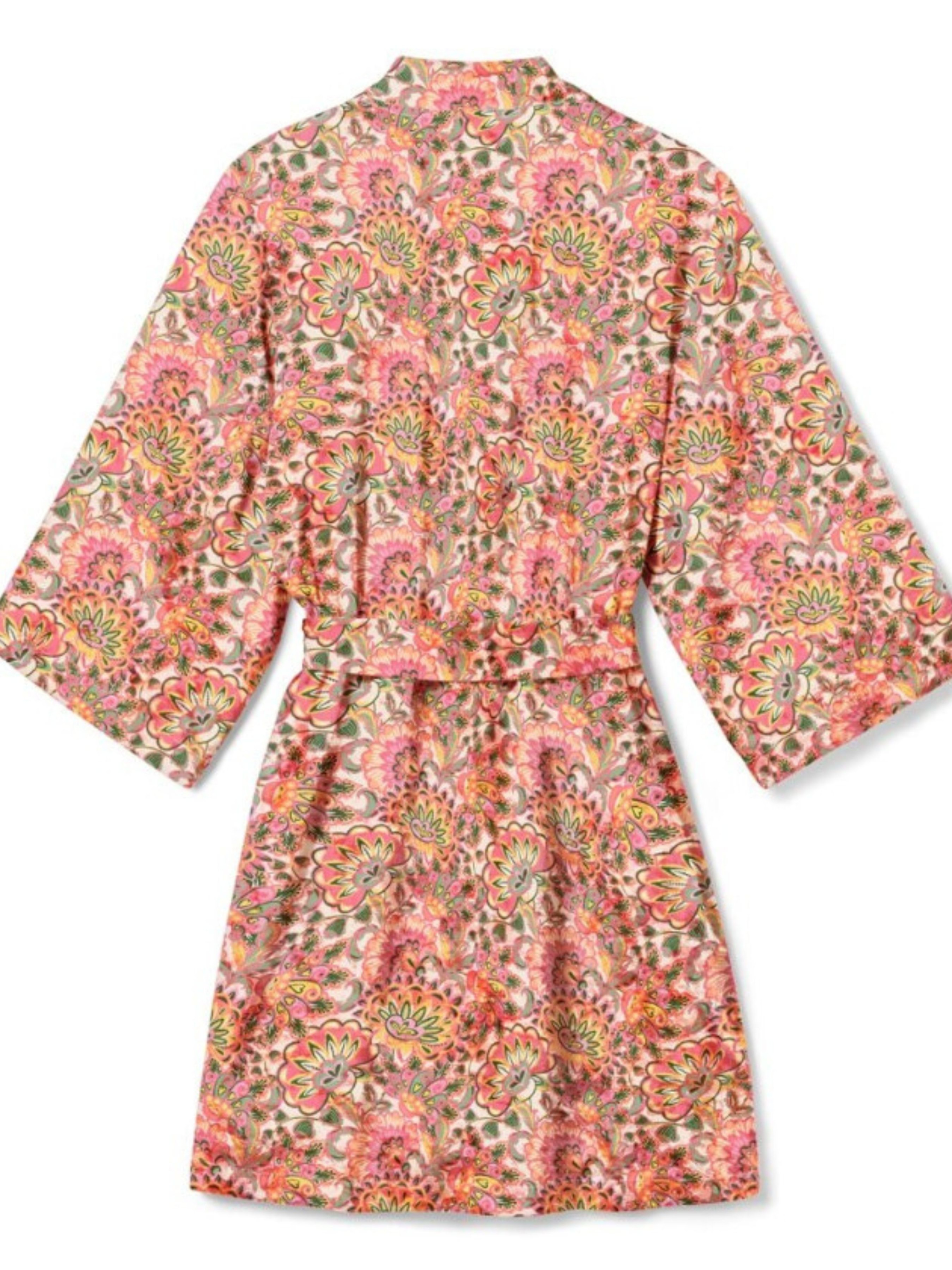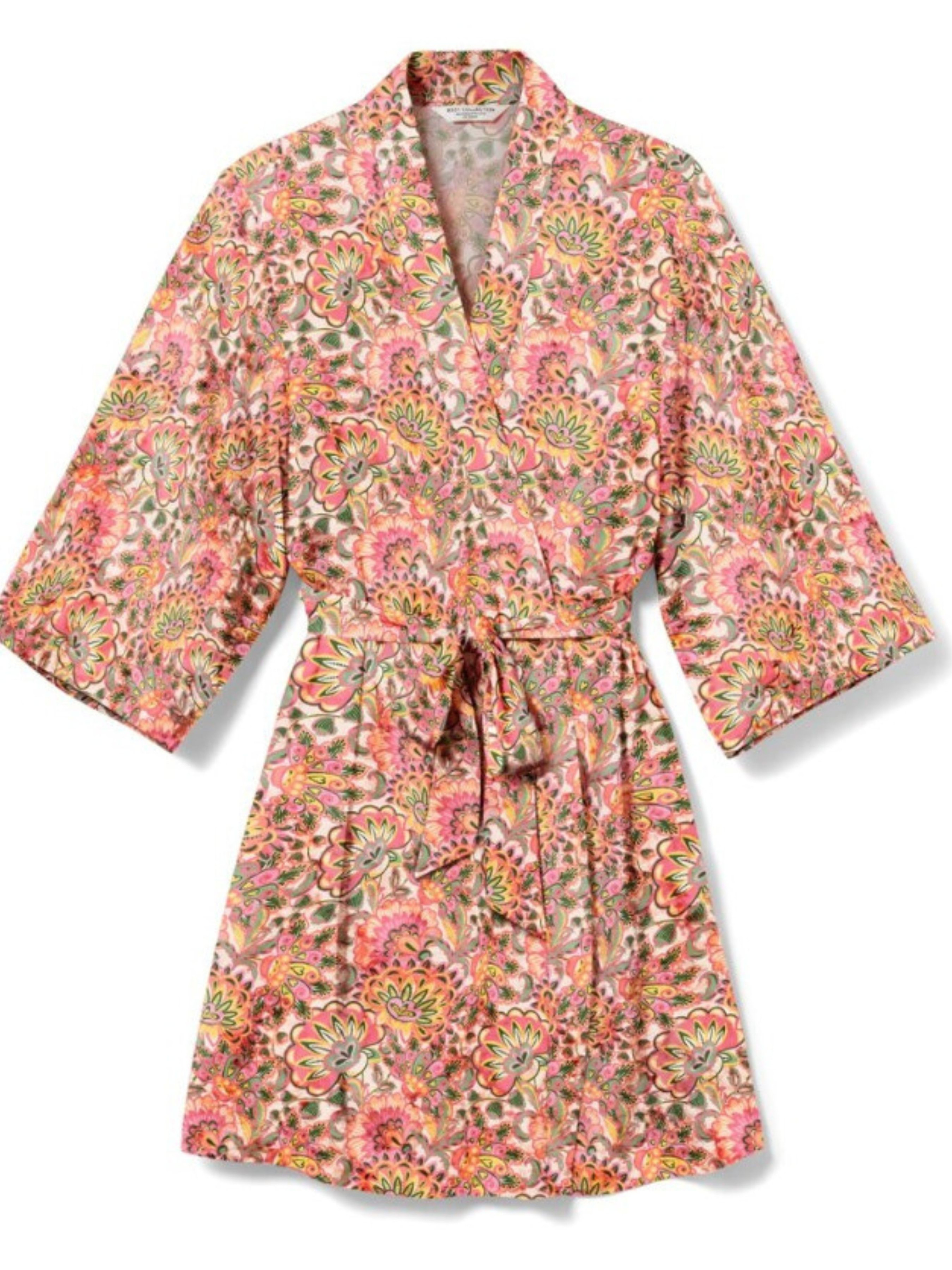 Мягкая струящаяся вискоза С дополнительной завязкой внутри Долговечна и легко стирается благодаря высококачественному брендовому эластану. Этот халат содержит переработанные древесные волокна. Проверено наличие вредных веществ внешними аккредитованными институтами Цвет Цветочный принт по всей поверхности кремового, розового и зеленого цветов. Материал 97% вискоза, 3% эластан Размер 48-50 ПОГ: 70 см, Длина рукава: 47 см, Длина: 103 см, " Замеры могут иметь погрешность измерения ±1/2 см. Уважаемые покупатели! Одежда бренда практически вся без бумажных этикеток, за редким исключением, и со срезанными частично или полностью внутренними бирками и ярлыками с составом ткани и другими данными. .Бирки срезают на оригинальных вещах. Заставляет это делать сам Бренд.