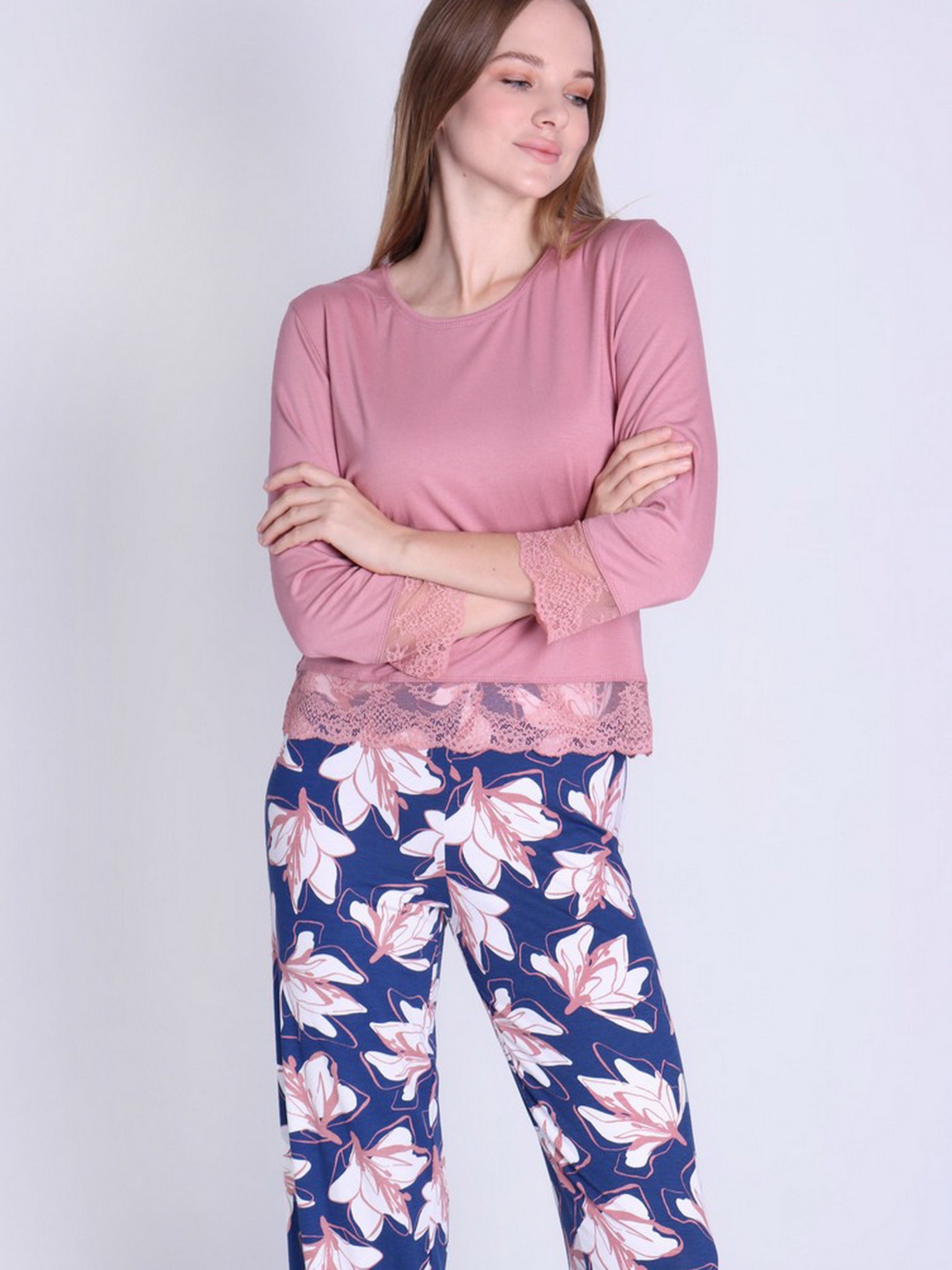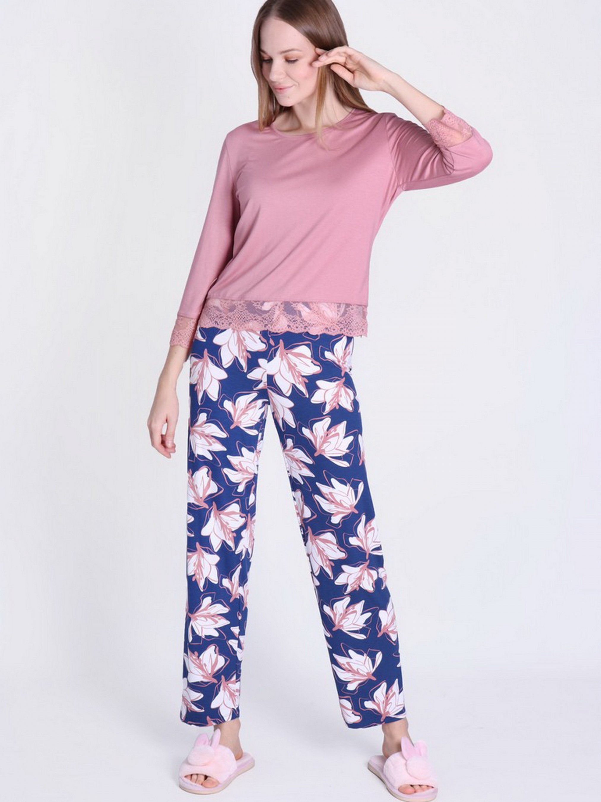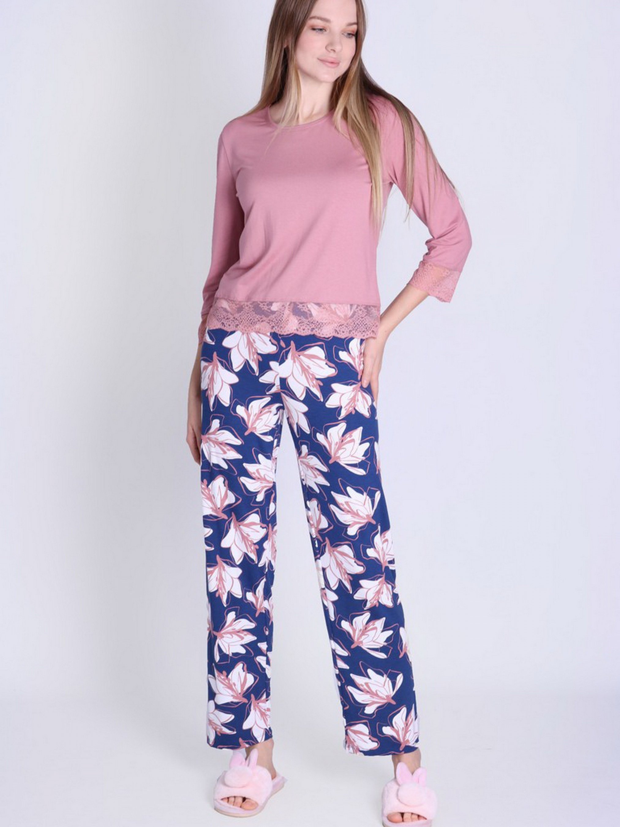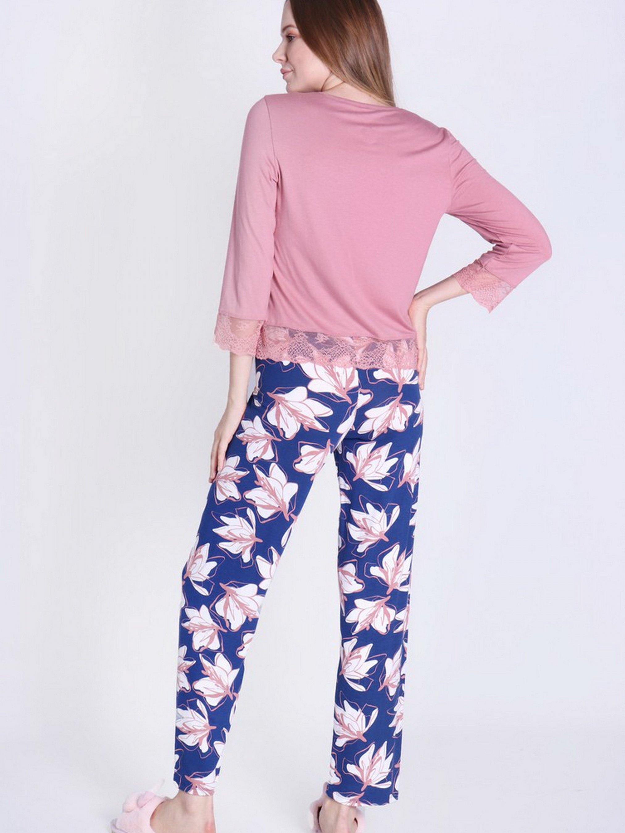 Брюки и лонгслив в комплекте для сна. Кофта однотонная имеет рукав 3/4, низ украшен кружевом. Штаны принтованные длинные с высокой посадкой. Уход за изделием: 1.Вискозы подходит ручная или машинная стирка на деликатном режиме 2.Не отбеливать, сушить без отжима. 3.Если вы стираете вручную, не выкручивайте вискозу, дайте изделию стечь естественным образом, затем сушите в расправленном виде. 4.Праты вискозной ткани рекомендуется при температуре указанной на этикетке (в основном это не более 30°С) 5.Использовать мягкие моющие средства (на кондиционеры при стирке, вискоза реагирует хорошо, приобретая дополнительную мягкость и шелковистость)
