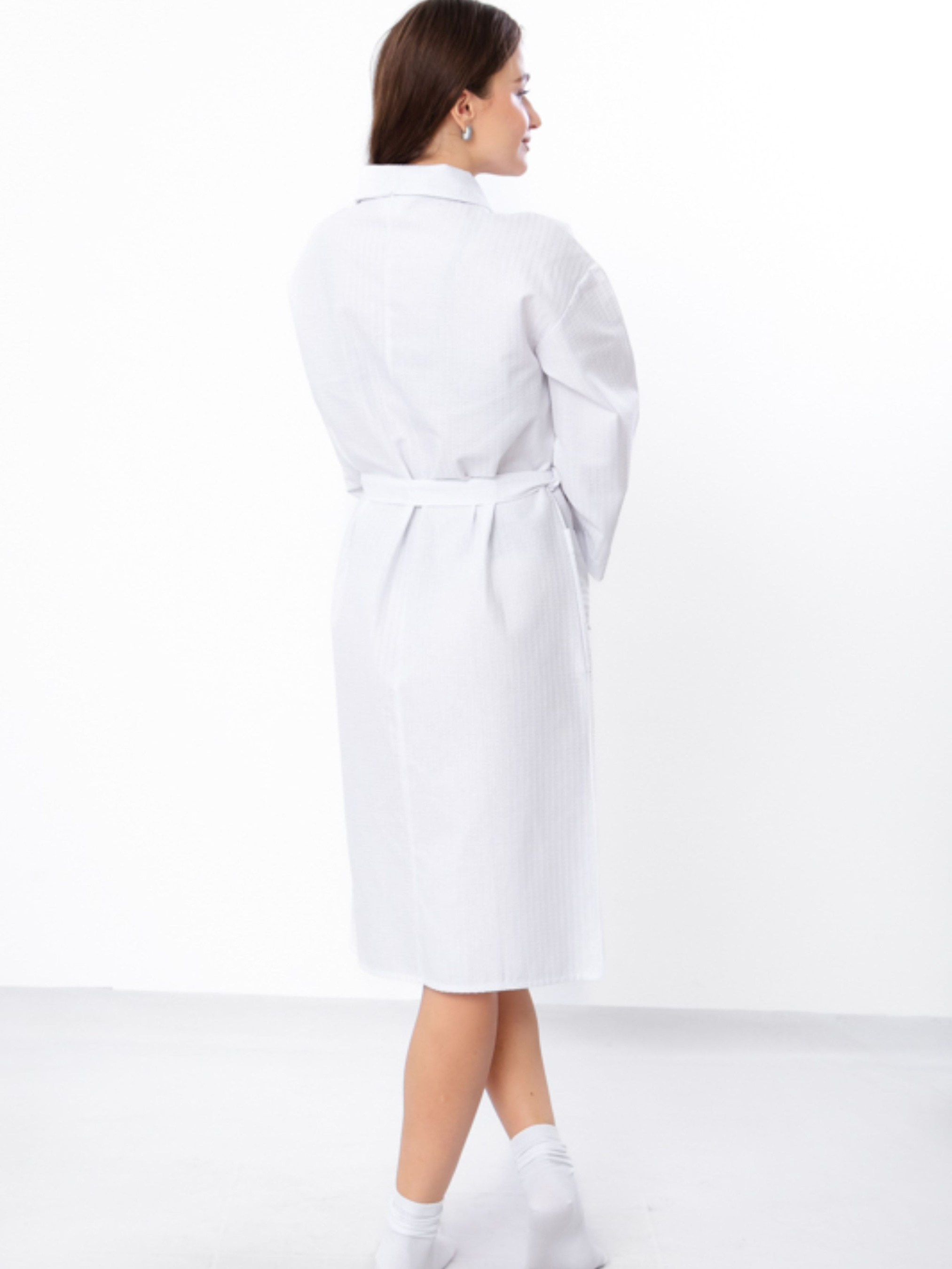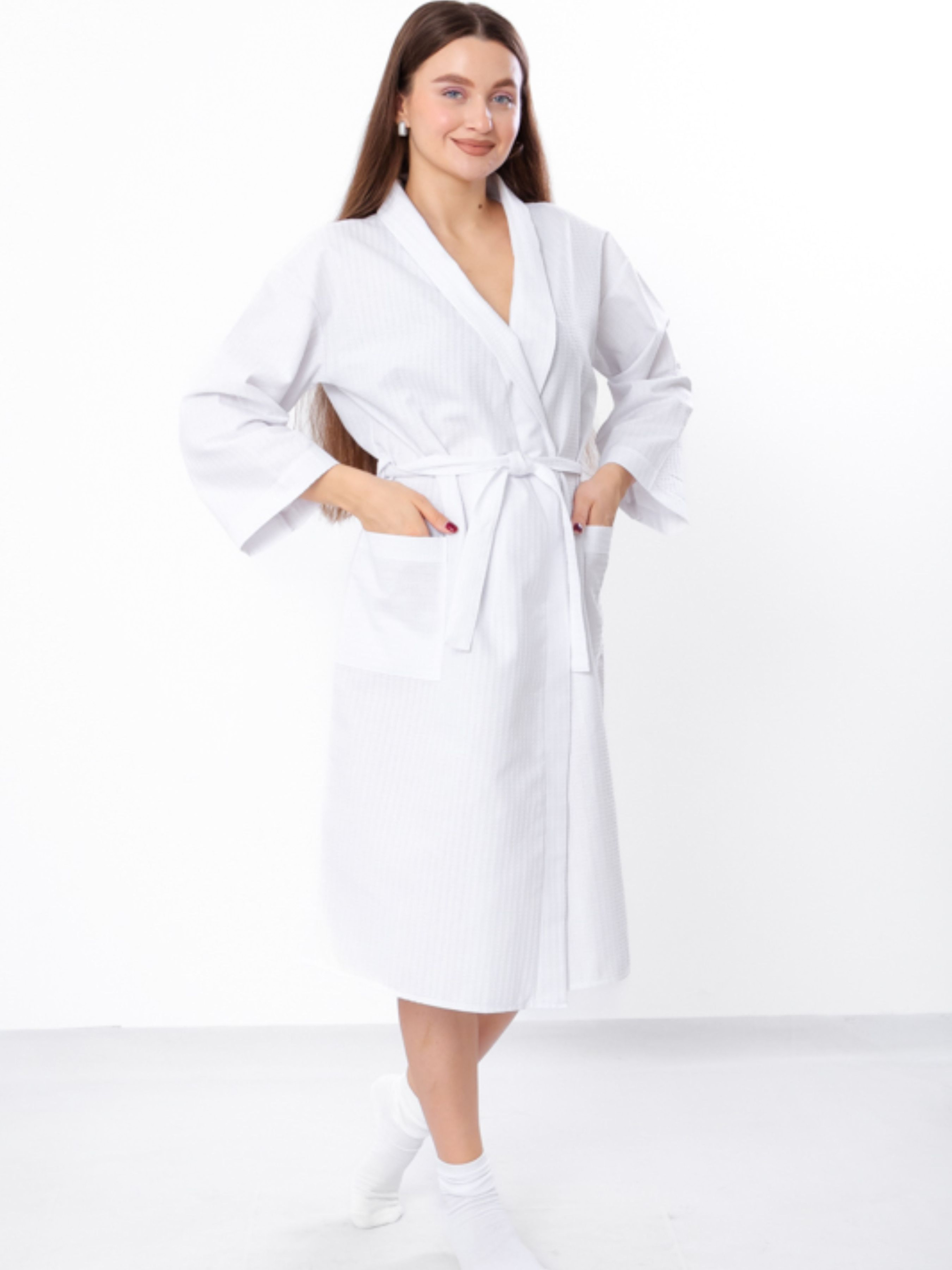 Полотно: вафельне Склад: 100% бавовна Щільність тканини 200 г/м2; Легкий жіночий халат із вафельної тканини ідеально підходить для дому, лазні, басейну чи фітнесу. Завдяки коміру-чаші, вільному фасону з запахом і рукавам ¾, які можна відвертати, він забезпечує максимальний комфорт. Натуральна тканина добре вбирає вологу та дарує приємні тактильні відчуття. Дві зовнішні кишені додають зручності, а легкість матеріалу робить халат ідеальним для будь-якого сезону.
