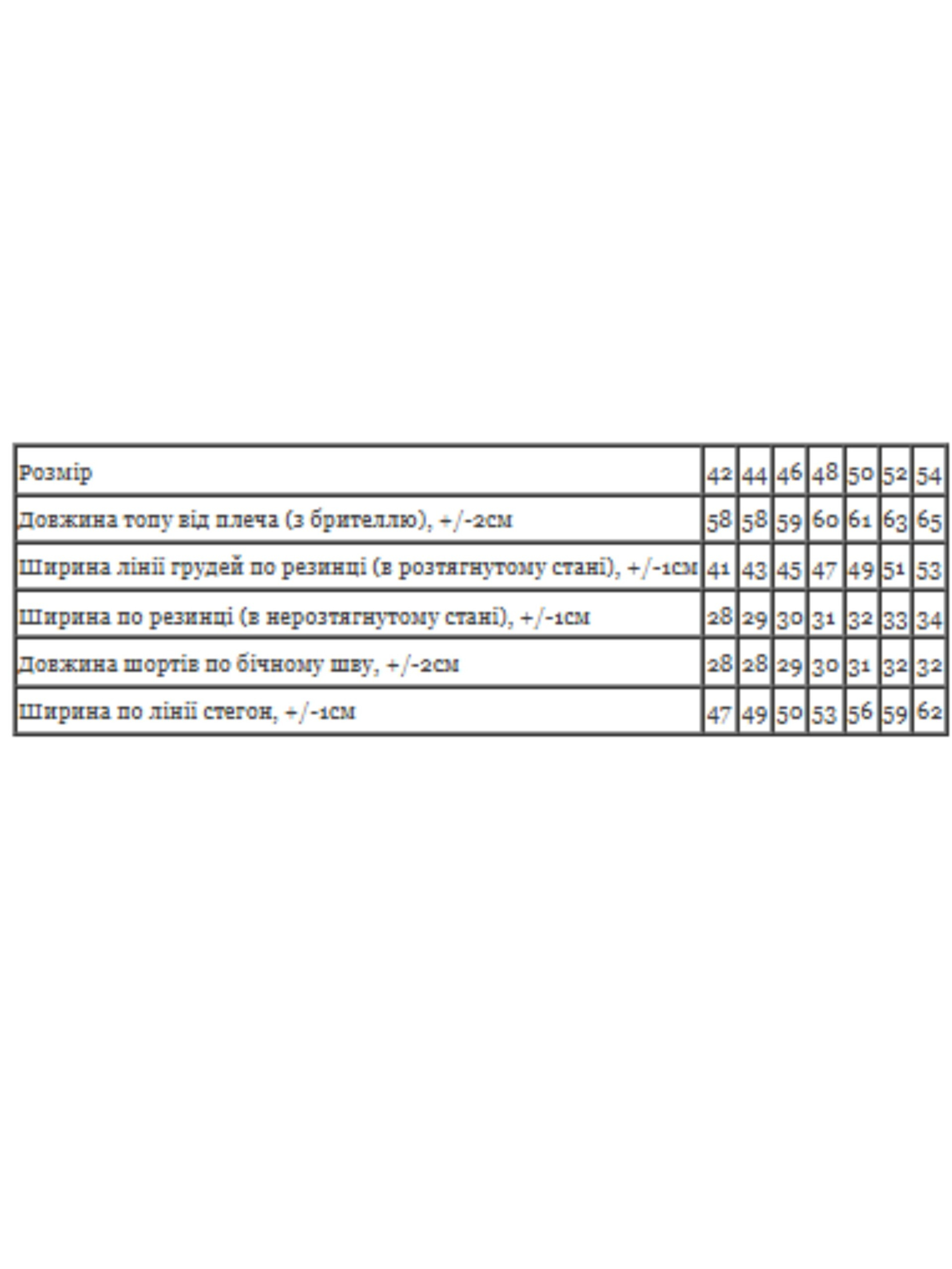 Полотно: кулір принтований Склад полотна: 100% бавовна Розмір: 42-54 Цей ультрамодний комплект жіночого топу і шорт - ідеальний вибір для літнього гардеробу. Він поєднує в собі комфорт та стиль, забезпечуючи легкість рухів та бездоганний вигляд. Доступний у різних кольорах та розмірах для ваших індивідуальних вподобань. Зробіть свій образ неповторним з цим чудовим комплектом!