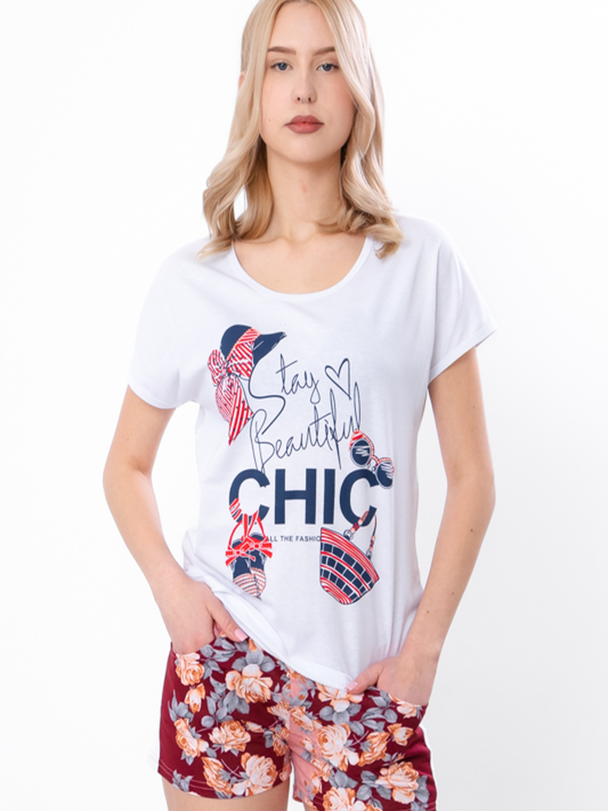 Полотно: кулір принтований, кулір однотонний Склад полотна: 100% бавовна Розмір: 42-54 Жіноча піжама (футболка + шорти) — це комфорт і стиль для домашнього відпочинку та сну. М’яка трикотажна тканина приємна до тіла, добре дихає та не сковує рухів. Футболка з коротким рукавом має вільний крій і яскравий принт, що додає настрою. Шорти на резинці — зручні, легкі та ідеальні для літніх ночей. Піжама легко переться, не втрачає кольору й форми.