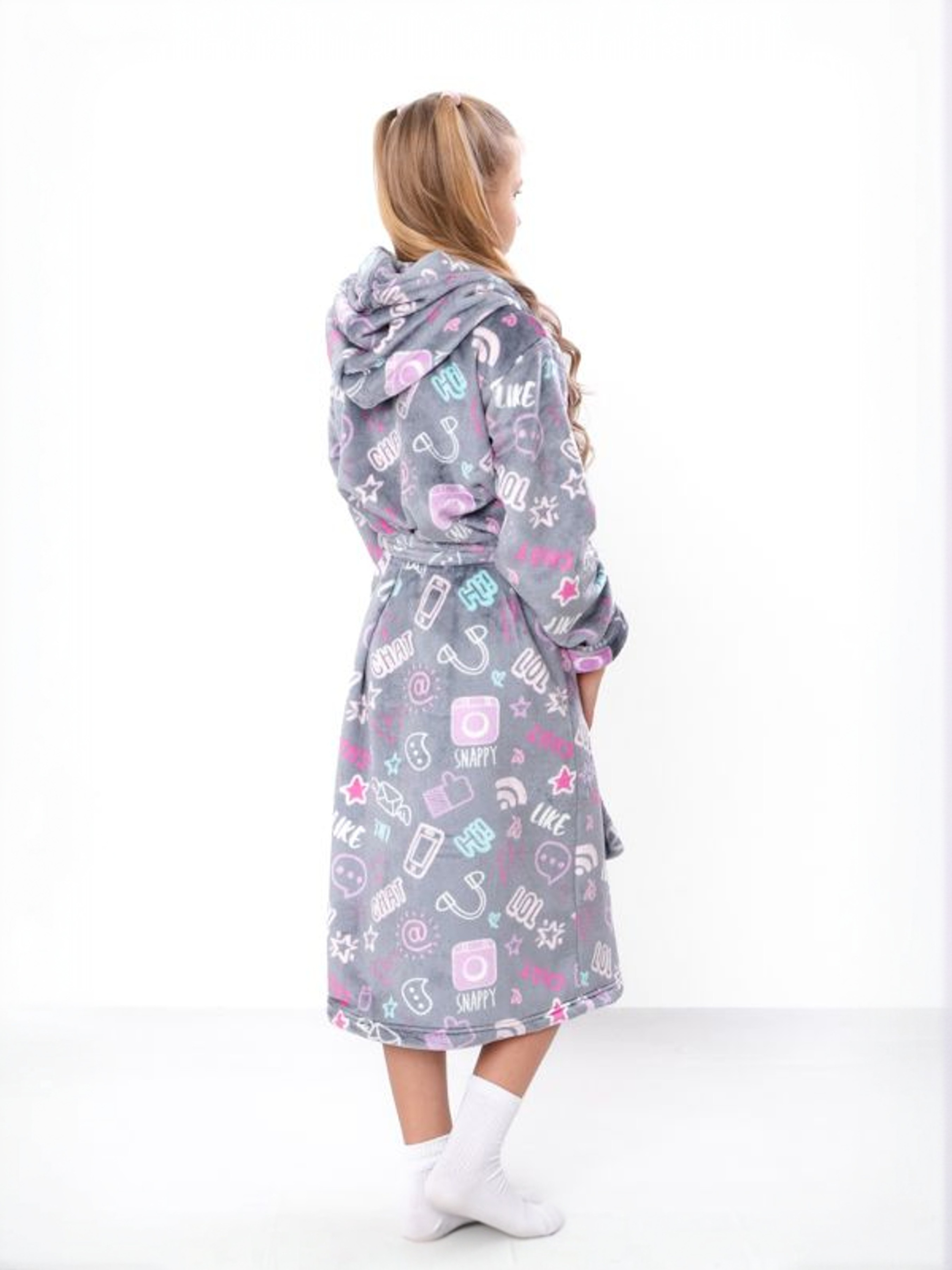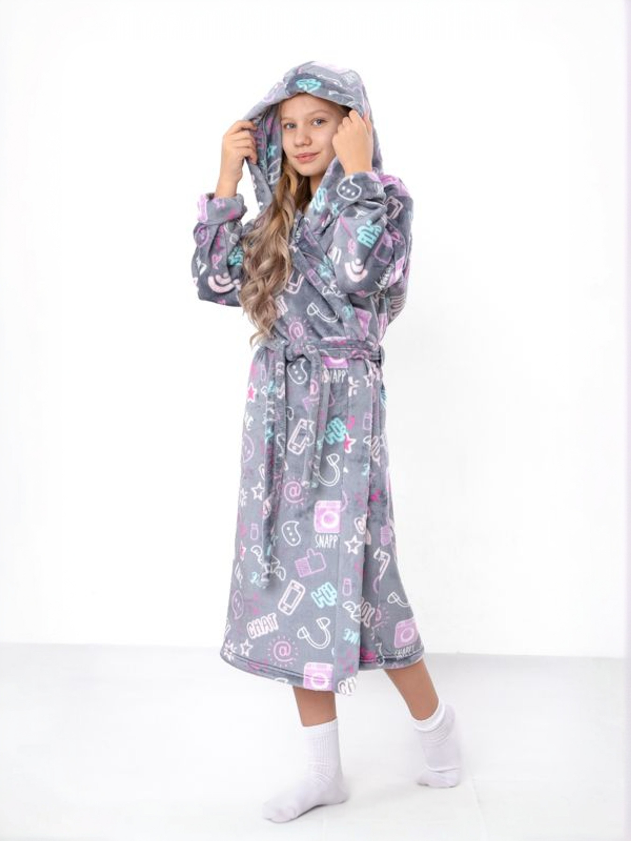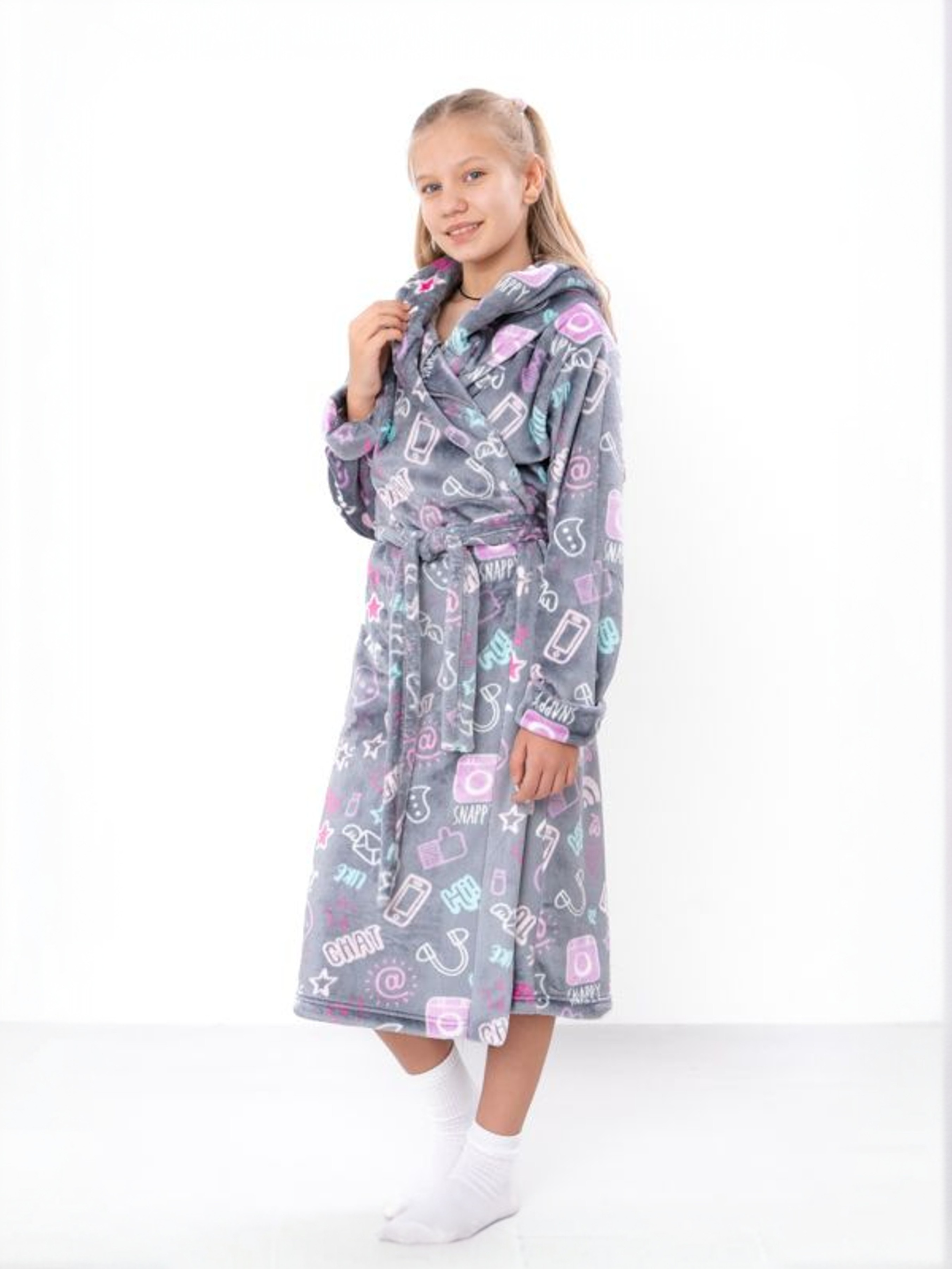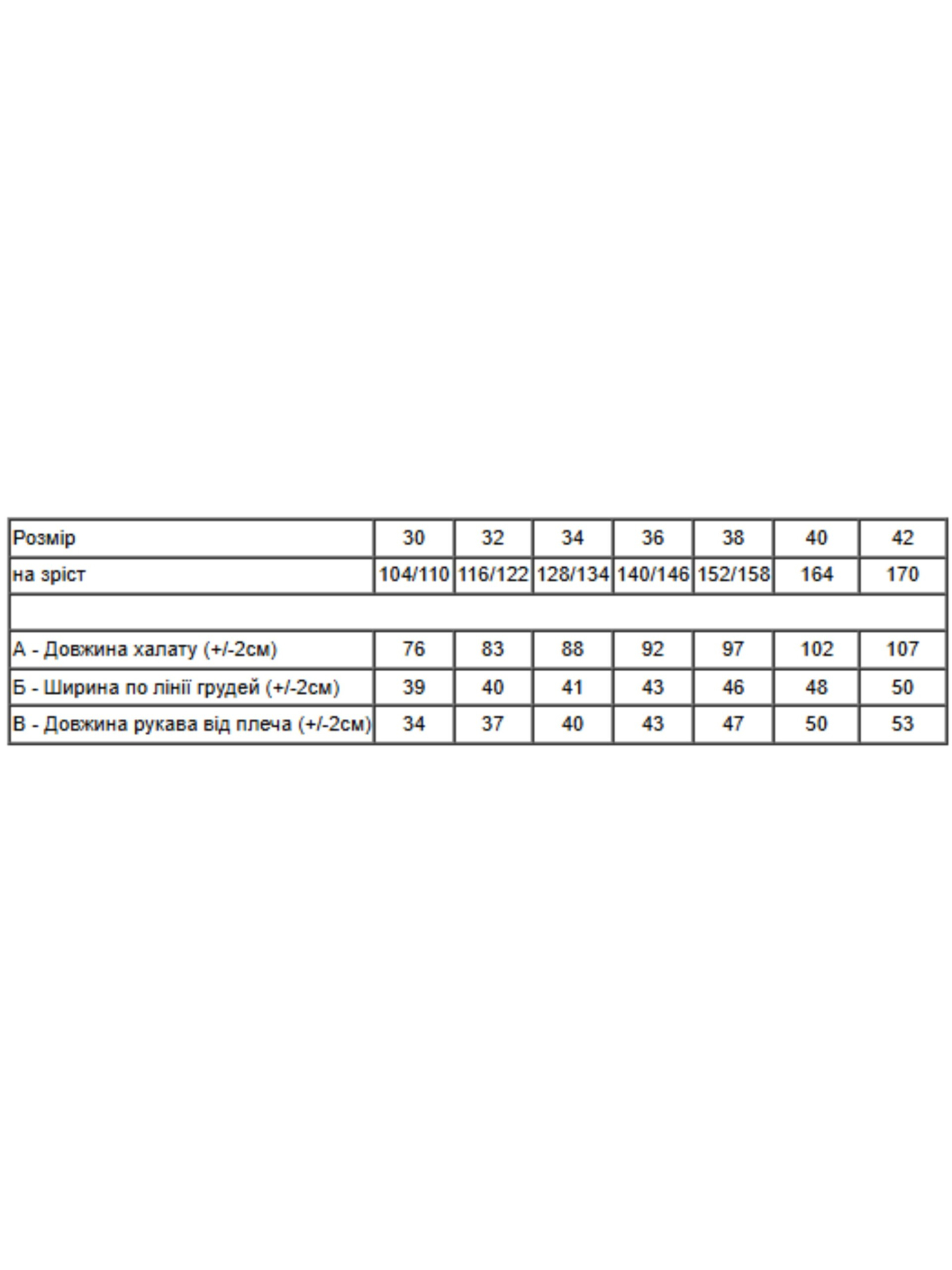 Полотно: махра рвана принтована Склад полотна: 100% поліестер Розмір: 30-40 Зріст: 104-170 Махровий принтований халат для дівчинки з розмірами від 30 до 42 – це втілення затишку та тепла. Виготовлений з м'якої рваної махри (велсофт), що на 100% складається з поліестеру, він дуже приємний до тіла та гіпоалергенний. Халат має практичний капюшон та застібку на запах, забезпечуючи теплоту та турботу після водних процедур або в прохолодний ранок. Яскравий принт та неперевершена м'якість зроблять цей халат улюбленим предметом домашнього гардеробу.