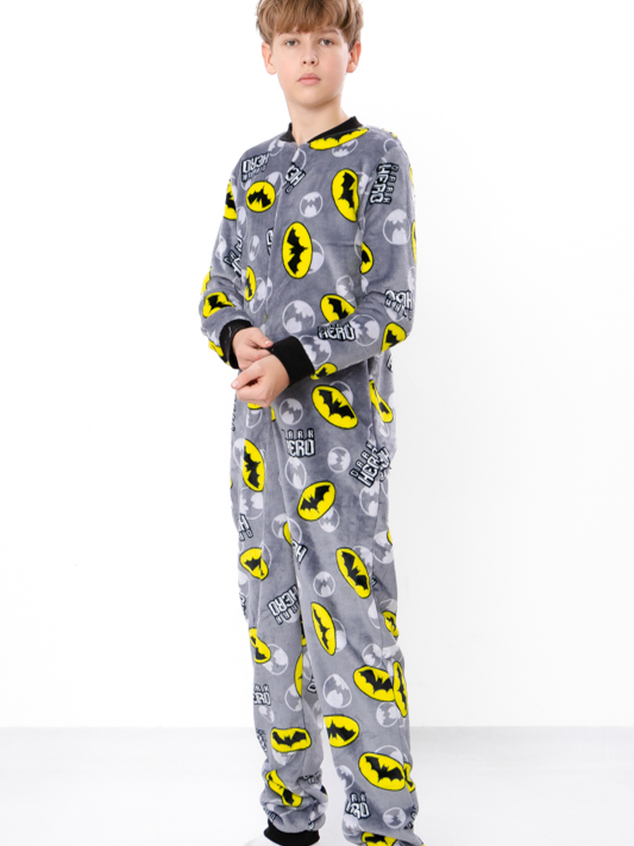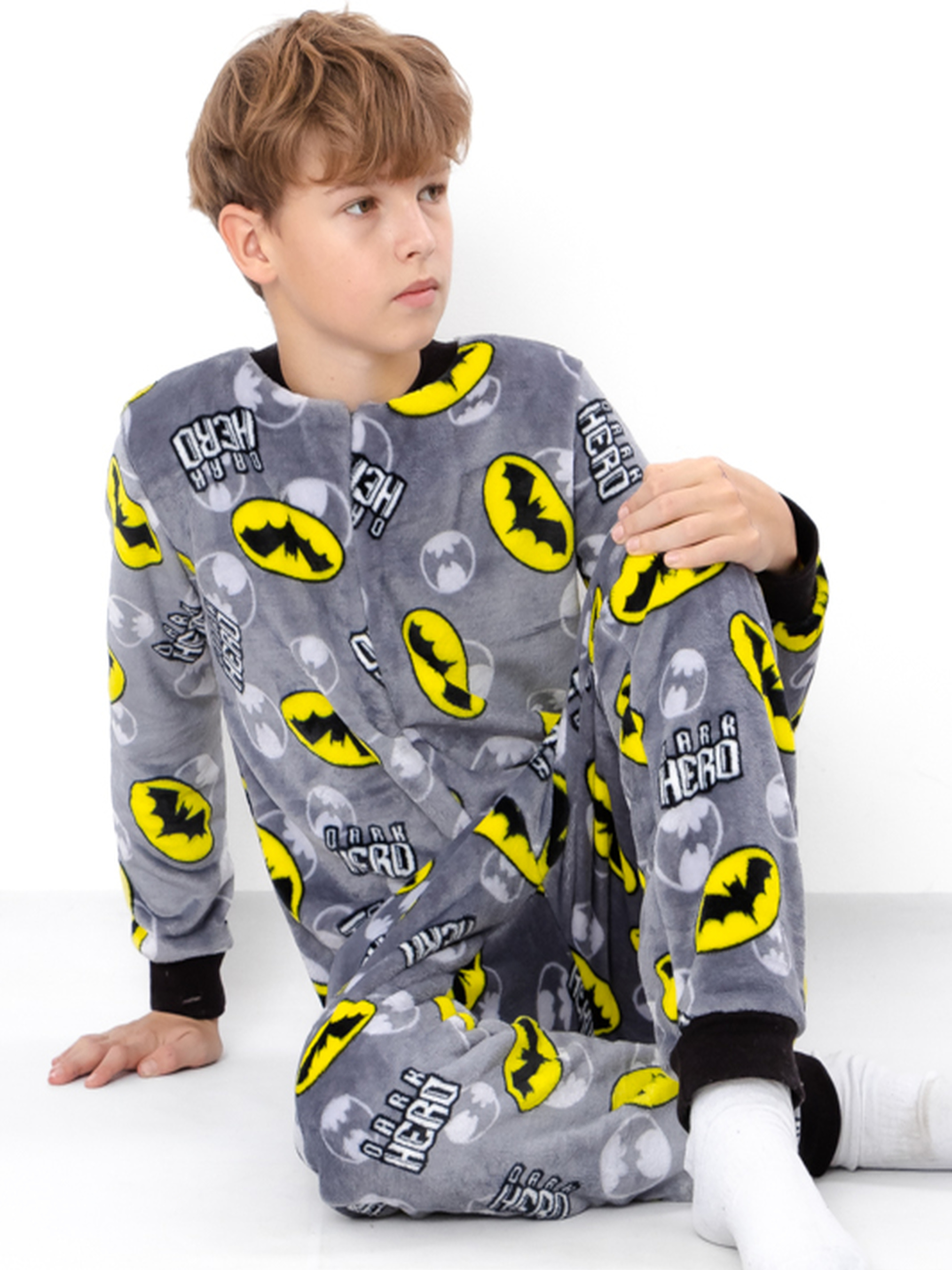 Полотно: махра принтована Склад полотна: 100% поліестер Зріст: 140-170 Махровий комбінезон для хлопчика-підлітка на блискавці — це безсумнівний лідер серед зручного домашнього одягу оазис затишку та комфорту. Комбінезон виготовлений із м'якого теплого принтованого полотна махра (100% поліестер). Це смішна та оригінальна модель продумана до дрібниць. Вона має довгі рукави прилеглі манжети на ручках і ніжках та кишеню що відстібається що додасть зручності в щоденному використанні. Унікальна модель має клапан на попі що відстібається. Тепла піжамка замінить майки штани непривабливі халатики старі футболки.