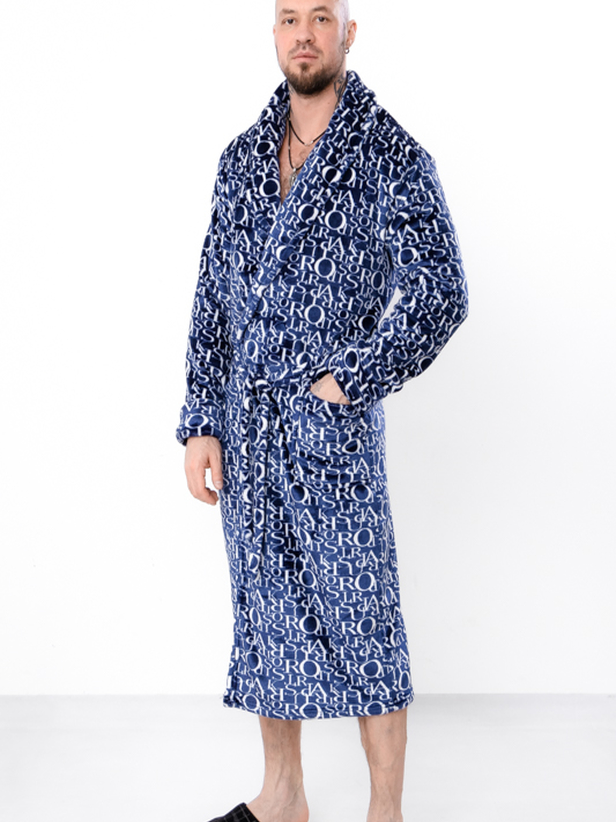 Полотно: махра рвана принтована Склад полотна: 100% поліестер Розмір 48/50-60 Халат чоловічий з рваної принтованої махри — це дуже теплий м'який та комфортний домашній одяг. Виготовлений із полотна махра (100% поліестер) що має пухнастий ворс він забезпечує високий теплозахист вологопоглинання і м'якість на дотик. Модель має крій з запахом та відкладним коміром і доповнена поясом та кишенею. Завдяки вільному крою та м'якому полотну халат дарує відчуття затишку ідеально підходячи для прохолодної пори року.
