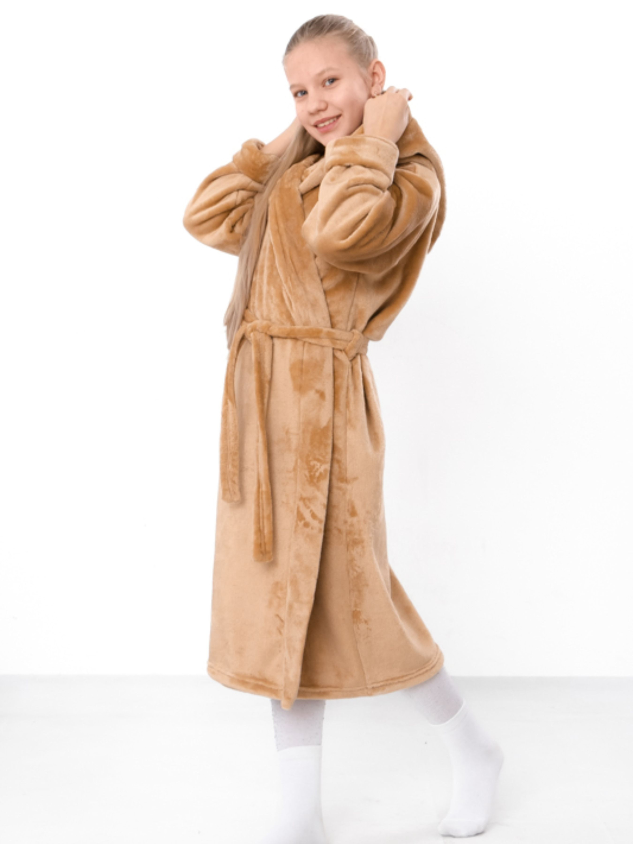 Полотно: махра однотонна Склад полотна: 100% поліестер Розмір: 104-170 Махровий халат для дівчинки з капюшоном — це поєднання затишку, практичності та ніжного стилю. Виготовлений із м’якої, приємної на дотик махри, він чудово вбирає вологу та забезпечує комфорт після купання або під час домашнього відпочинку. Модель має зручний запах, капюшон і пояс у комплекті, що дозволяє легко регулювати посадку та надійно фіксувати халат. Однотонний дизайн виглядає стильно та акуратно, підходить для щоденного використання. Висока якість матеріалів і пошиття гарантують довговічність навіть після частих прань. Цей халат подарує дитині тепло, комфорт і відчуття турботи щодня.
