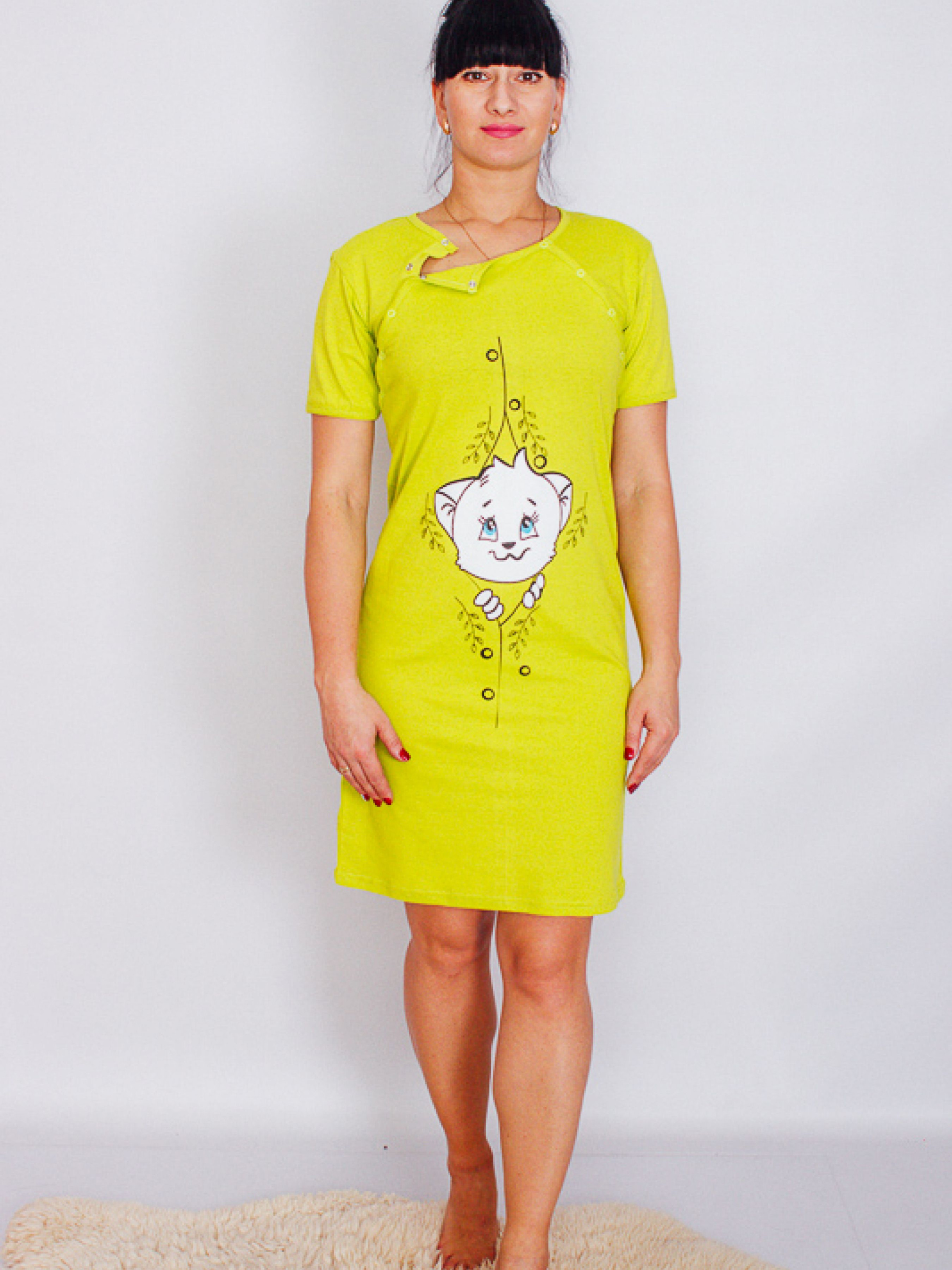 Полотно: кулір Склад полотна: 100% бавовна Розмір: 44-52 Практична зручна нічна сорочка для годуючих мам. Виконана з легкого повітряного полотна кулір. Матеріал добре пропускає повітря і не сковувує рухів. Сорочка відмінно підійде для дому і для сну. Прикрашена дуже ніжним милим накатом. Дуже приємна до тіла добре носиться прати при температурі 30 градусів. Кнопки розстібаються на дві сторони дуже зручно для годуючих мам.