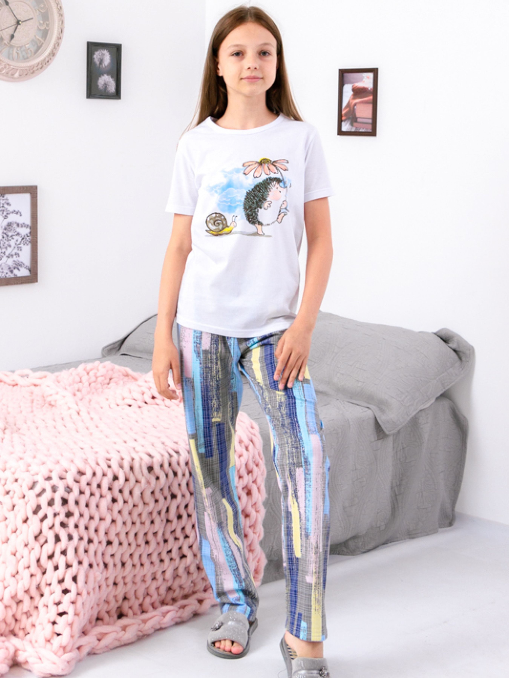 Полотно: кулір принтований кулір однотонний Склад полотна: Хлопок Зріст: 140-170 Піжама від виробника дитячого одягу ТМ Носи Своє стане прекрасним варіантом для дівчинки яка любить красиві і зручні речі. Комплект що складається з футболки з коротким рукавами і штанів пошитий з 100% бавовняного куліру і ідеально підходить для сну і домашнього відпочинку практично в будь-який сезон року. Принт неодмінно сподобається кожній дівчинці. Чудова піжама не втрачає охайного вигляду в процесі тривалої експлуатації і при правильному догляді витримує безліч пранів. Догляд: дбайливе прання при t не більше 40С; прасувати при t не більше 110С; з вивороту трохи вологим.