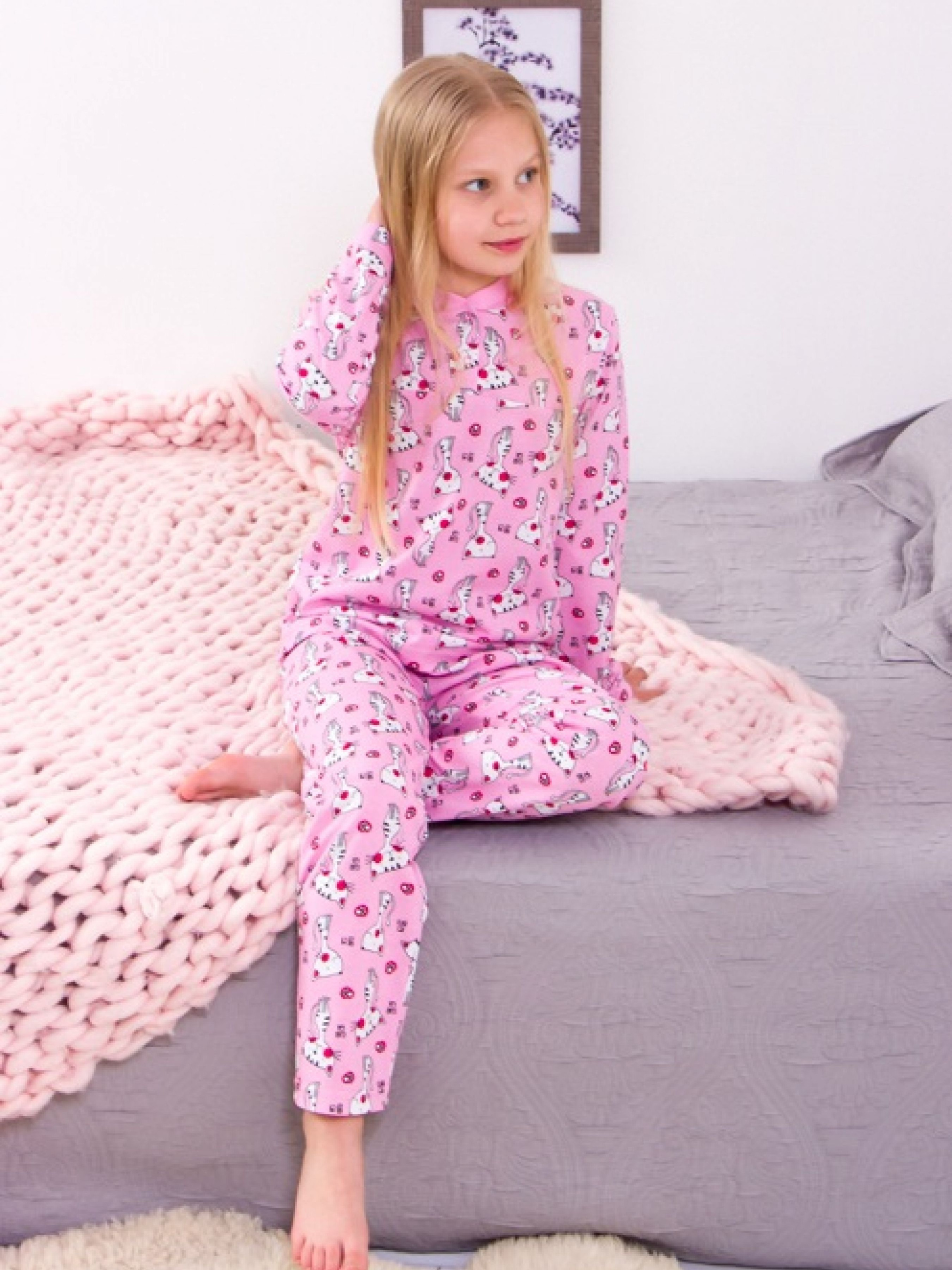 Полотно: кулір набивний Склад полотна: Хлопок Зріст: 92-98110-134 Найсолодші сновидіння сняться тільки в зручному нічному одязі. Класична зручна дитяча піжама з набивного куліру. Кофта з довгим рукавом доповнена 2 кнопками. Брюки на резинці. Кулір вважається найтоншим трикотажним полотном з бавовни одяг з нього виходить легкий і повітряний дозволяє тілу дихати. Тепер кожен вечір ніч і ранок будуть ще світліші приємніші і добріші.