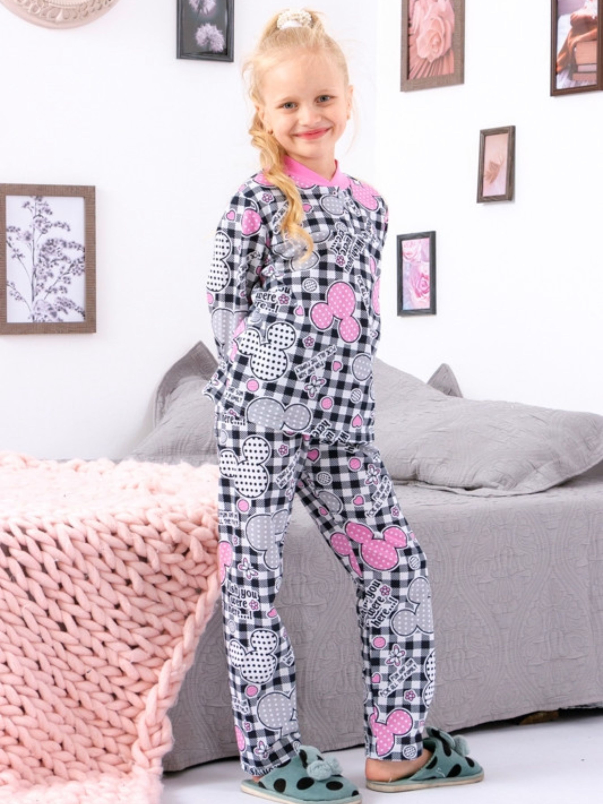 Полотно: начос набивний Склад полотна: 100% бавовна Зріст: 92-134 Дитячий одяг ТМ Носи Своє дуже подобається маленьким і дорослим споживачам за рахунок високої якості безпеки сировини і практичності. Модель відрізняється продуманим кроєм що дозволяє дитині не тільки комфортно себе почувати але і виглядати красиво і охайно. Піжама для дівчинки на кнопці стане ідеальним варіантом для вашого непосиди який обирає в повсякденному носінні стильно оформлені речі. Комплект складається з кофти з довгим рукавом і кнопками по переду і довгих штанів. Набір пошитий з тонкого дихаючого трикотажу до складу якого входить 100% бавовни. Матеріал забезпечує відмінні експлуатаційні і естетичні властивості. Полотно прекрасно пропускає повітря не затримує вологу допомагаючи регулювати термобаланс. При цьому відрізняється підвищеною стійкістю до зносу прекрасно витримує часті прання без втрати насиченості оформлення та форми. Догляд: трикотажне полотно може дати усадку і деформуватися при пранні в гарячій воді. БУДЬ ЛАСКА ВИКОНУВАТИ РЕКОМЕНДАЦІЇ ПО ДОГЛЯДУ! Рекомендоване дбайливе прання при 40 градусах; делікатний віджим; не викручувати; відбілювання заборонено прасувати при t не більше 110 градусів.