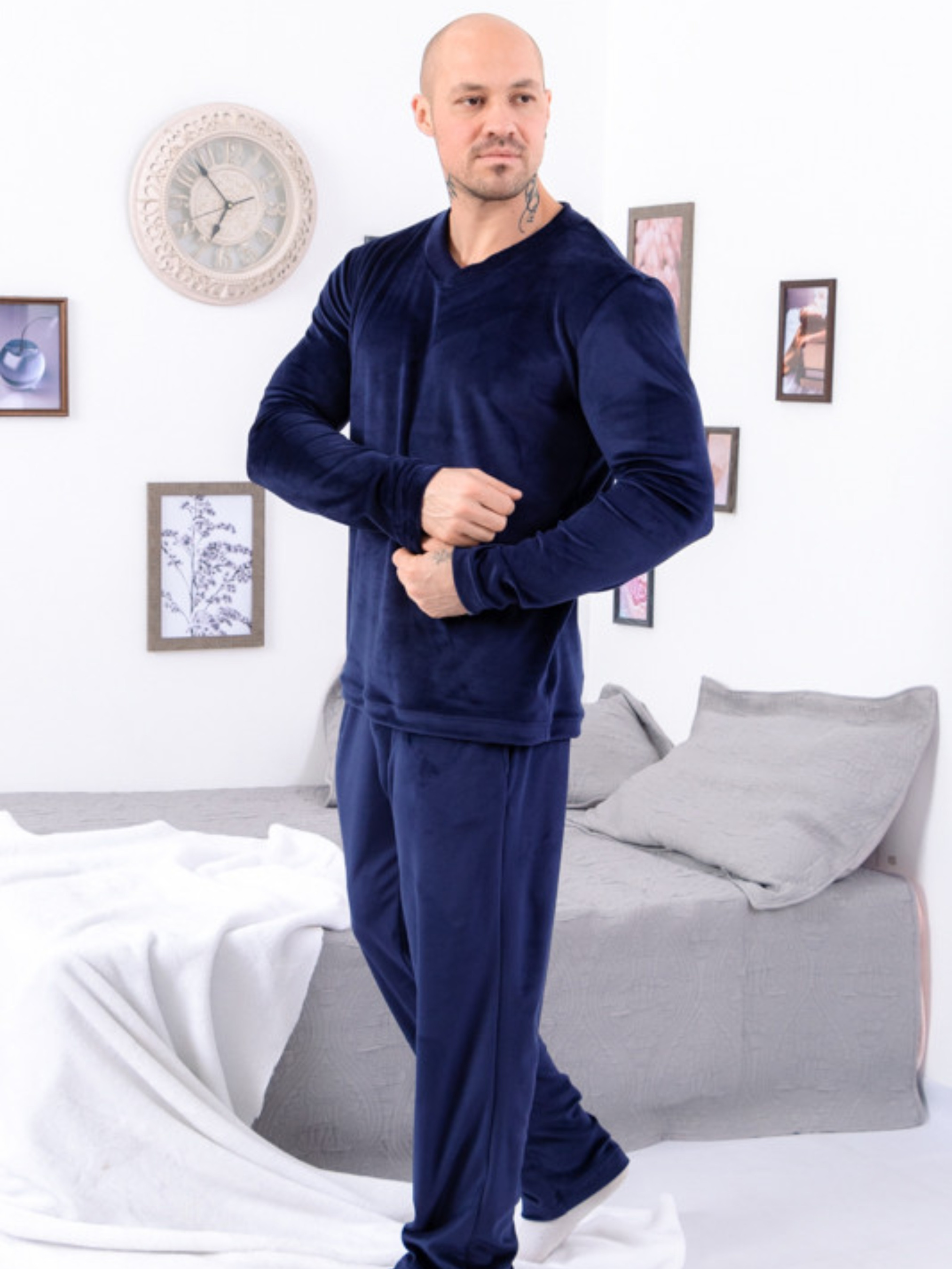 Полотно: велюр плюш Склад полтна: 80% бавовна 20% поліестер Розмір: 44-54 Стильна чоловіча піжама або домашній костюм - прекрасний подарунок чоловікові. Це дуже зручна річ яка дає відчуття затишку і комфорту. У такій піжамі буде зручно не тільки спати в прохолодні ночі міжсезоння а й цілком комфортно займатися домашніми звичними справами перебуваючи вдома. Костюм пошитий з трикотажного полотна преміум класу - велюр склад 90% бавовна 10% лайкра. Піжама не має гудзиків блискавок та інших застібок її зручно і швидко надягати. Складається комплект з двох частин: верхня частина - це пуловер з V-подібним вирізом нижня частина - штани прямого крою злегка завужені до низу. Піжама упакована у фірмову упаковку. Зробіть чудовий подарунок собі або своїм близьким! Українська фабрика Трикотажний рай - це вироби високої якості доступні ціни висока якість обслуговування. Догляд: прати одяг з велюру можна в машинці проте в делікатному режимі при температурі 30 градусів. Рекомендуємо використовувати м'які миючі засоби без різних хімічних добавок. Щоб не пошкоджувати однорідність ворсу і його напрямків велюр краще дбайливо віджимати руками.