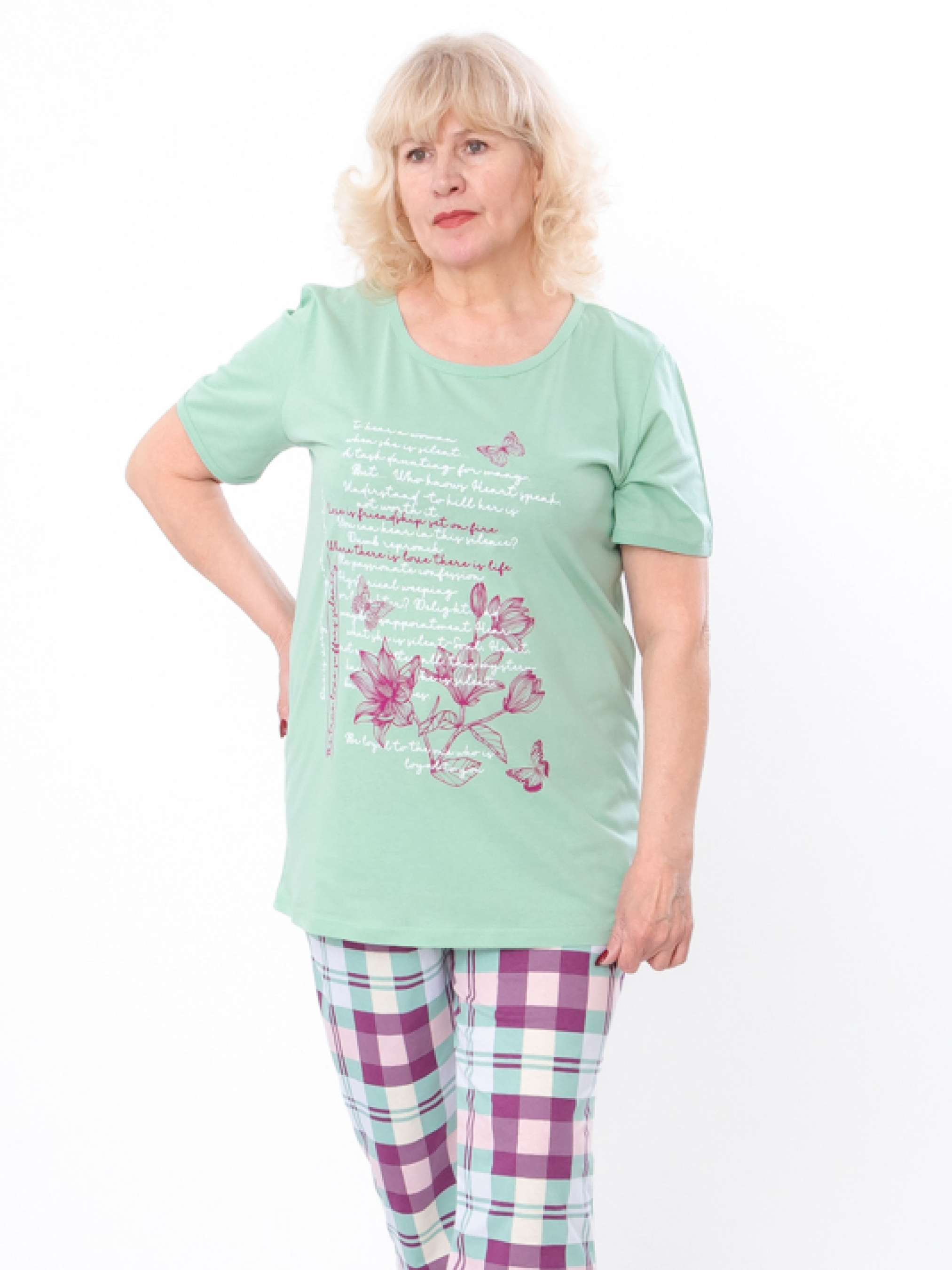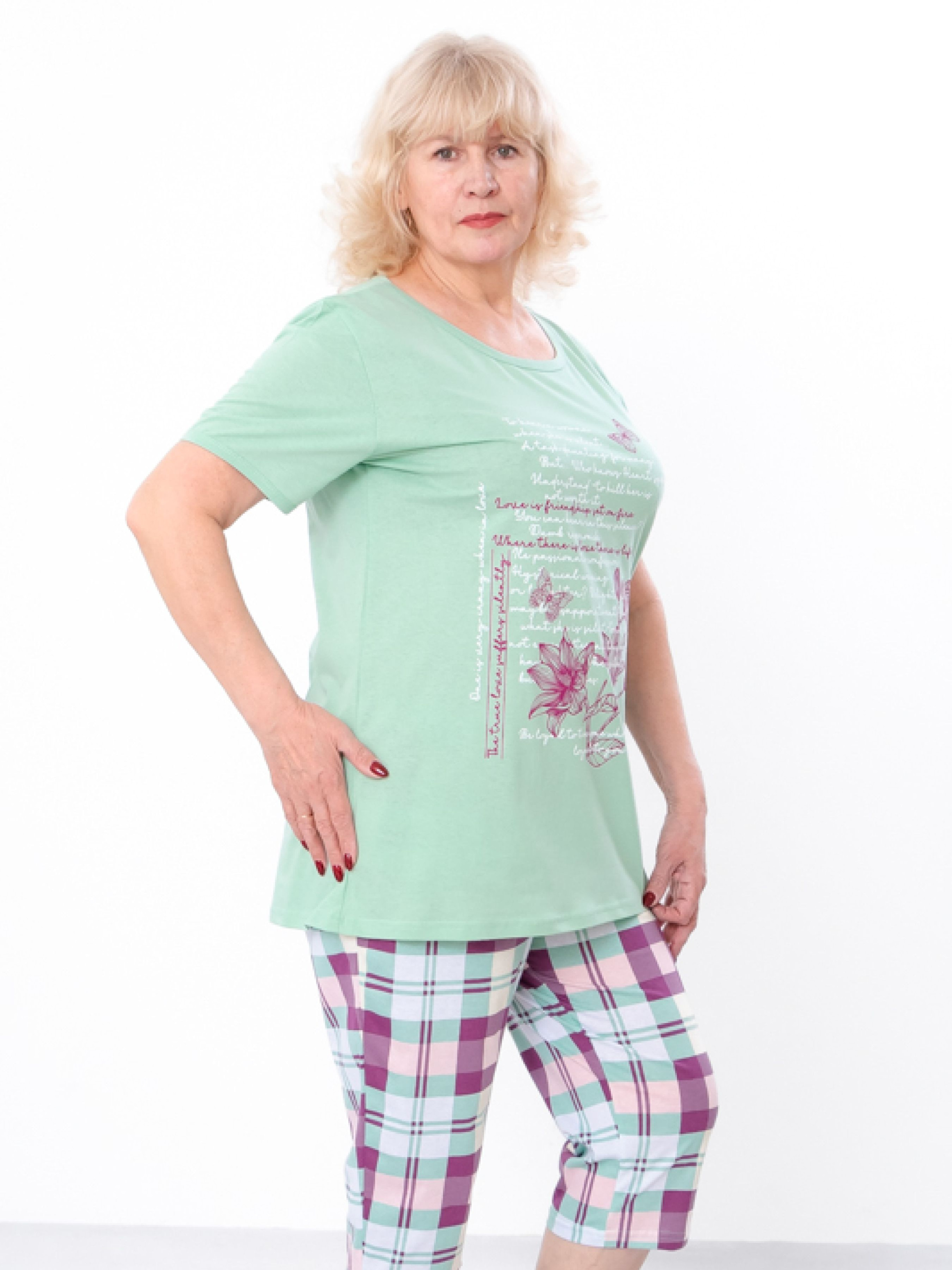 Полотно: кулір однотонний, кулір принтований Склад полотна: 100% бавовна Розмір: 54-62 Жіночий комплект футболка і бріджі – відмінний вибір для комфортного відпочинку та домашнього використання. Цей комплект виготовлений з м'яких, дихаючих тканин, які забезпечують максимальний комфорт і свободу рухів. Стильний дизайн футболки і бріджів доповнює елегантний вигляд, а різноманітність кольорів дозволяє вибрати ідеальний варіант для будь-якої пори року. Ідеальний для домашнього використання, відпочинку або легких прогулянок. Замовте жіночий комплект футболка і бріджі для сучасного і зручного стилю кожного дня.