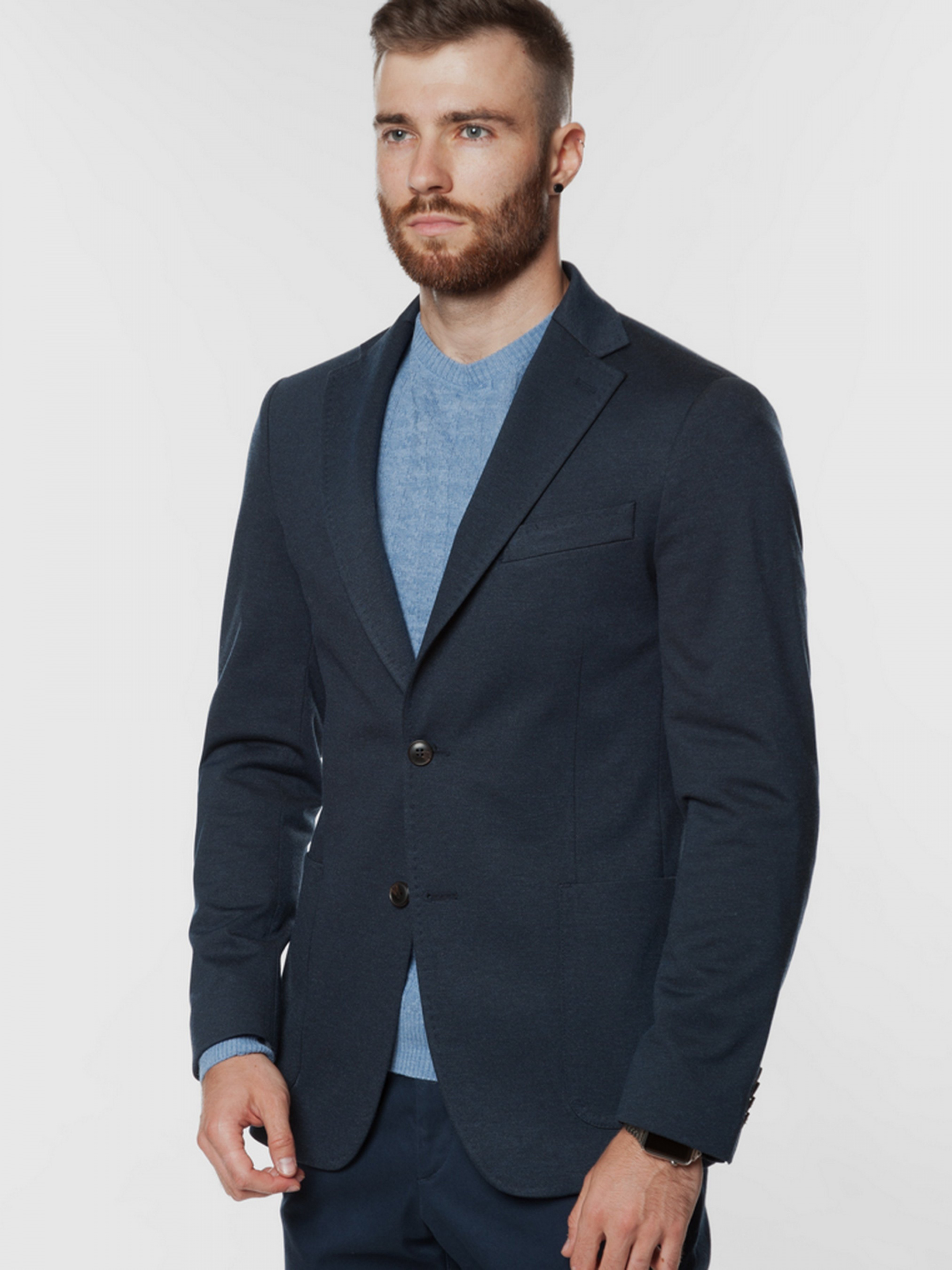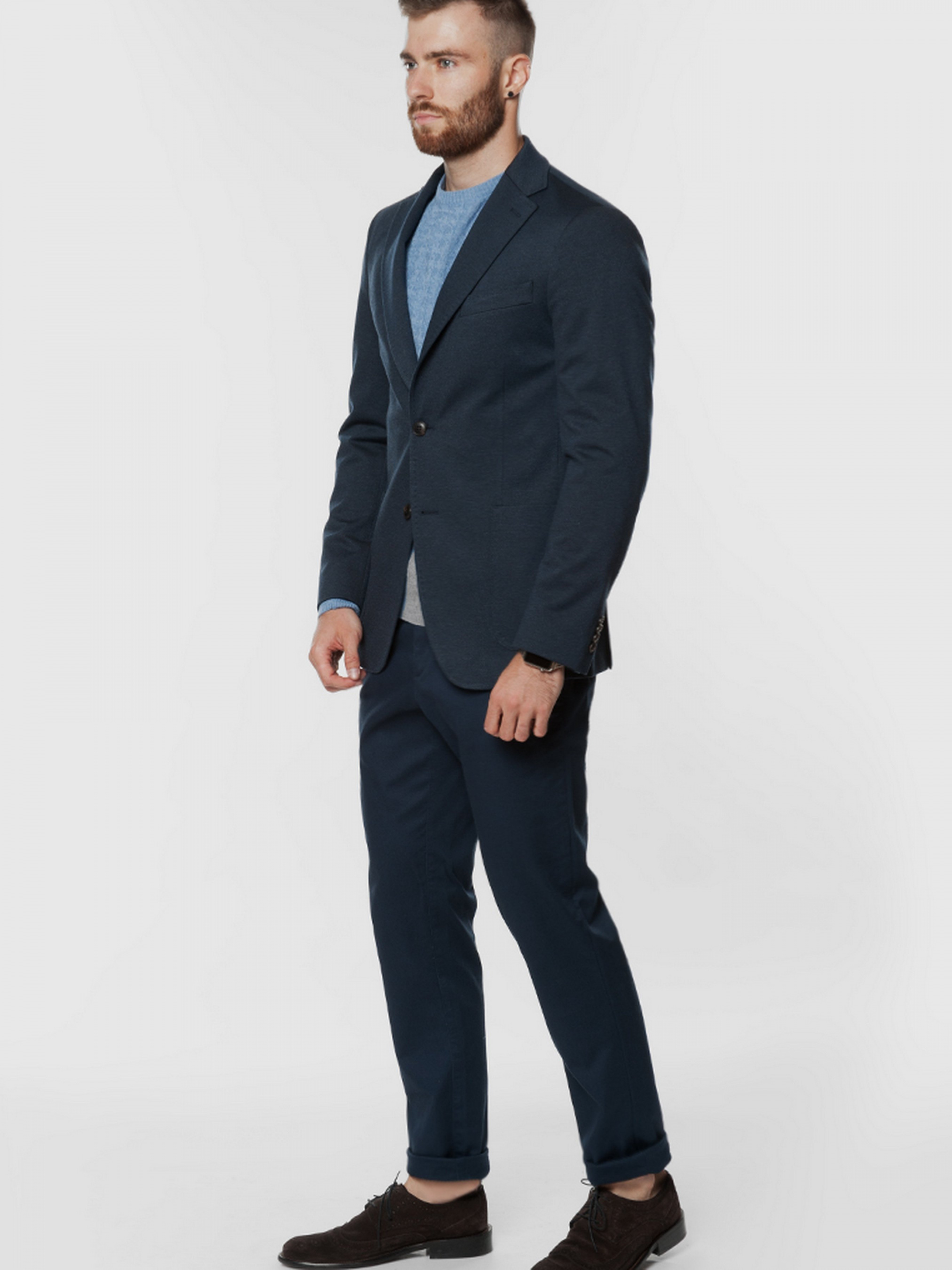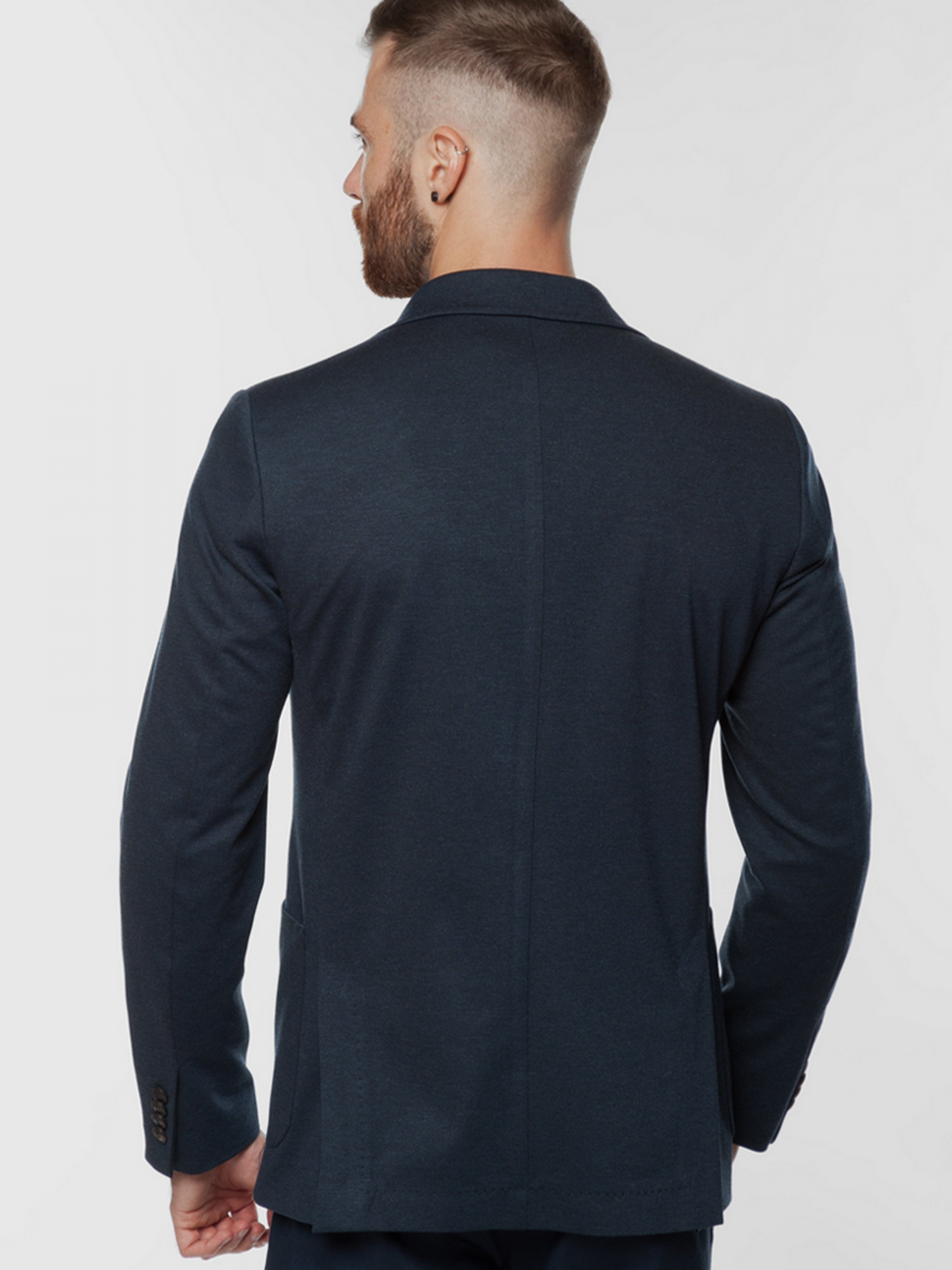 Трикотажный приталенный пиджак Arber тёмно-синего цвета, выполнен из эластичной ткани, на основе вискозы с добавками. Пиджак идеально сидит на фигуре, не сковывает движение и почти не ощущается на теле. Модель на 2 пуговицы, с прямым лацканом, двумя накладными карманами, двумя шлицами, подкладка спинки укороченная. Пиджак прекрасно сочетается с однотонными брюками серого или синего цвета. Дополнить образ можно тонким трикотажем или сорочкой casual и неформальной обувью. Так же есть возможность составить комплект из пиджака и брюк одного цвета (брюки AO 01.32.30).