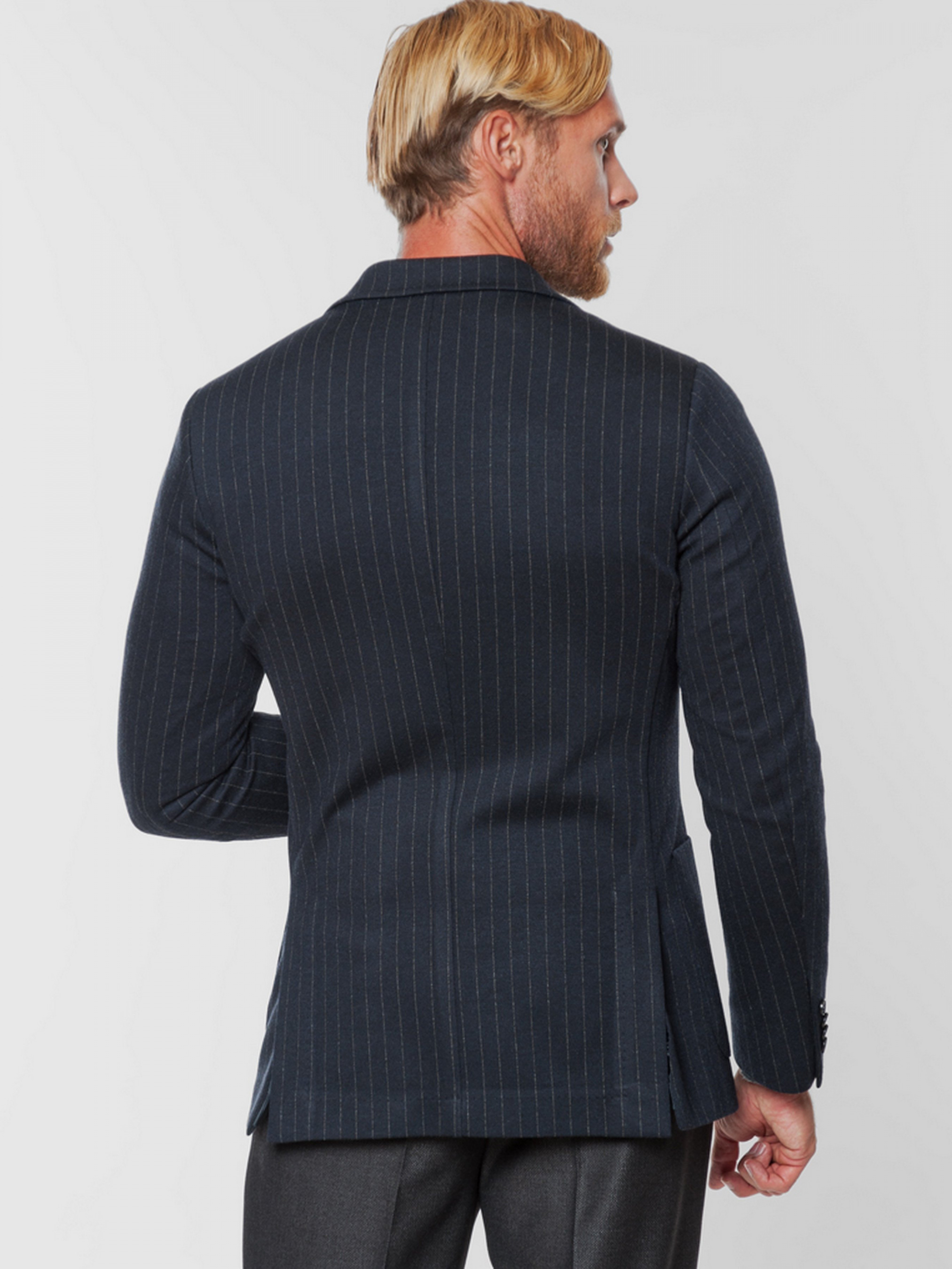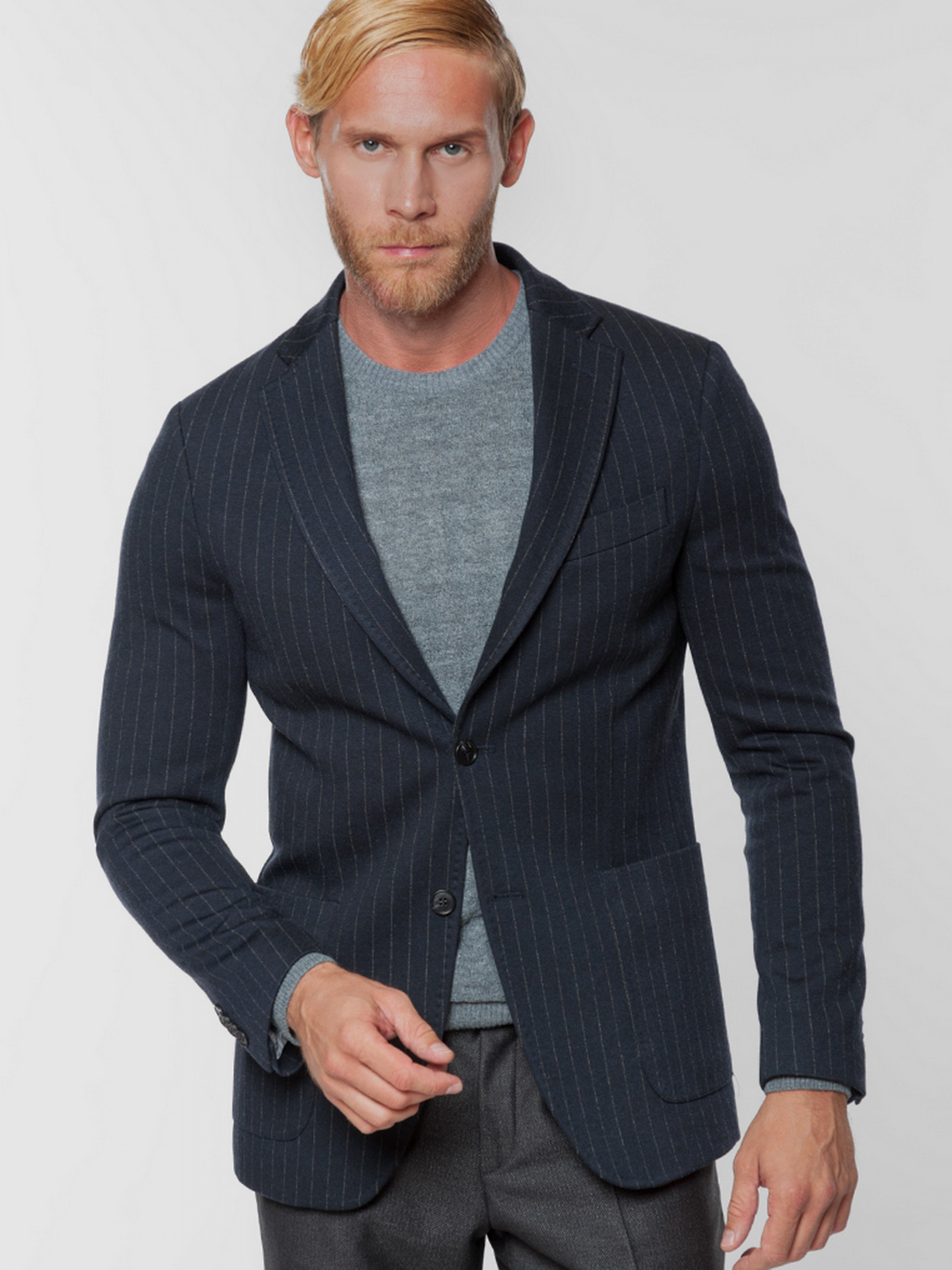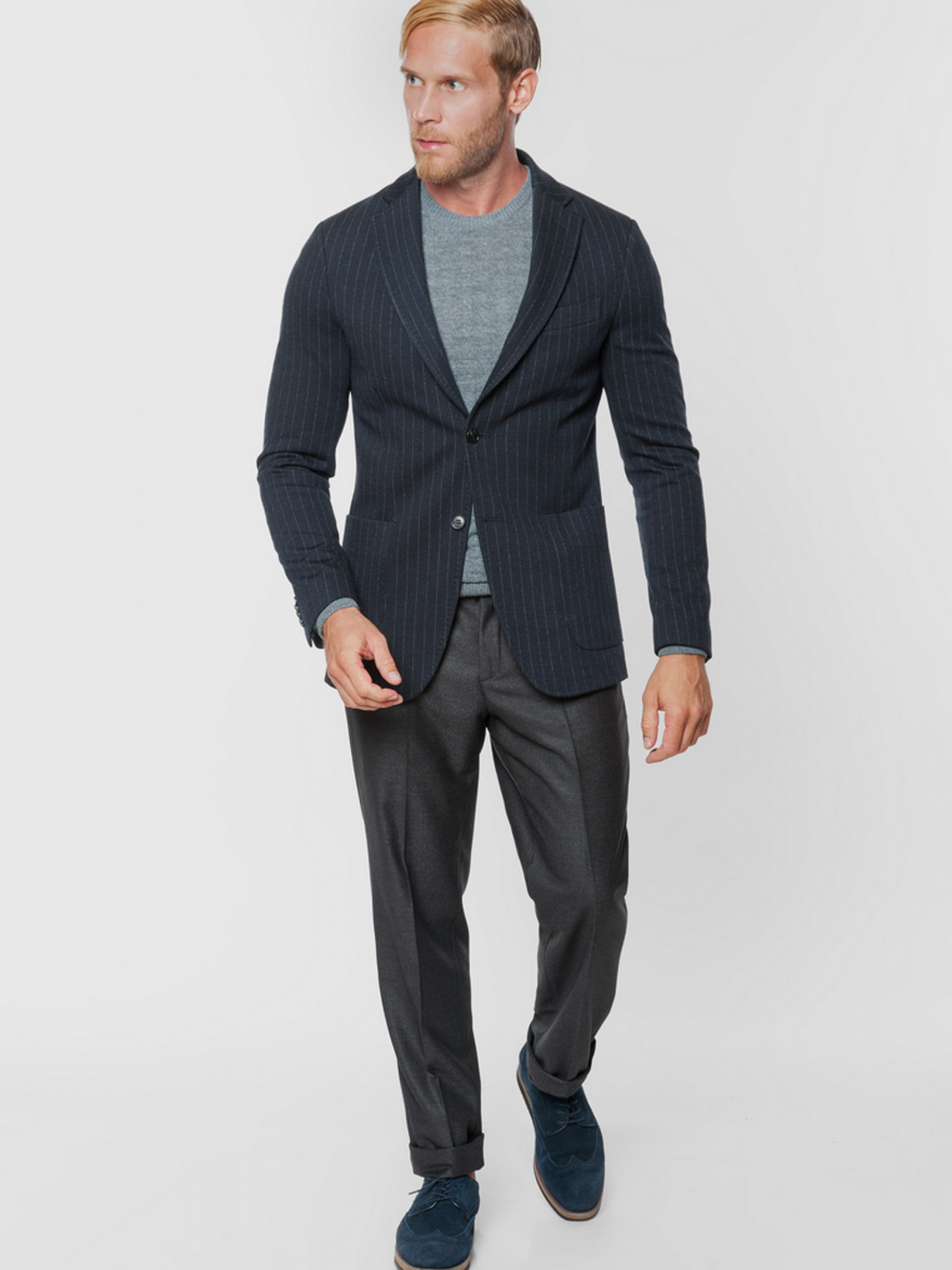 Трикотажный приталенный пиджак Arber синего цвета в полоску, выполнен из эластичной ткани, на основе вискозы с добавками. Пиджак идеально сидит на фигуре, не сковывает движение и почти не ощущается на теле. Модель на 2 пуговицы, с прямым лацканом, двумя накладными карманами, двумя шлицами, подкладка спинки укороченная. Пиджак прекрасно сочетается с однотонными брюками серого или синего цвета. Дополнить образ можно тонким трикотажем или сорочкой casual и неформальной обувью. Так же есть возможность составить комплект из пиджака и брюк одного цвета (брюки AO 01.35.30).