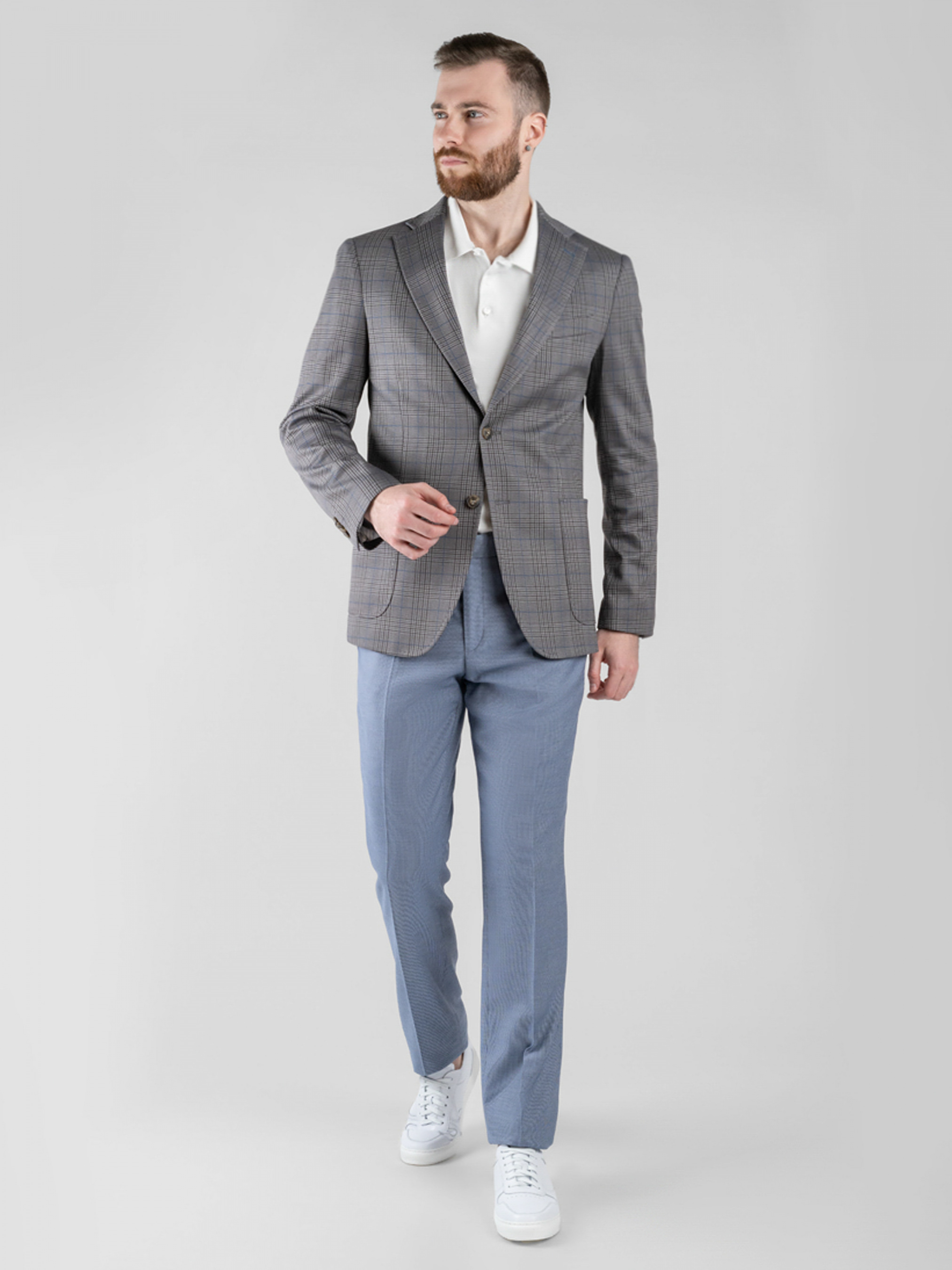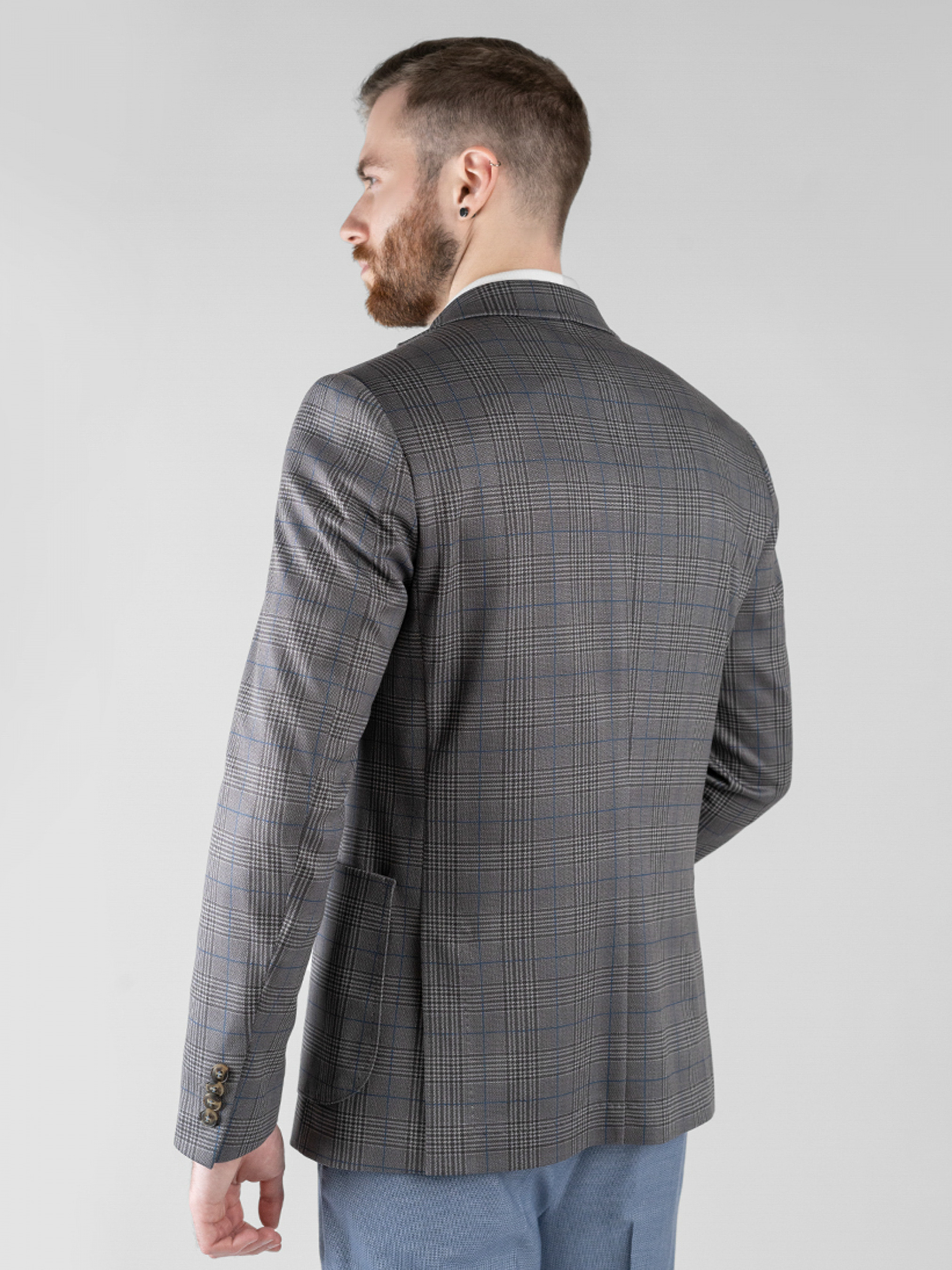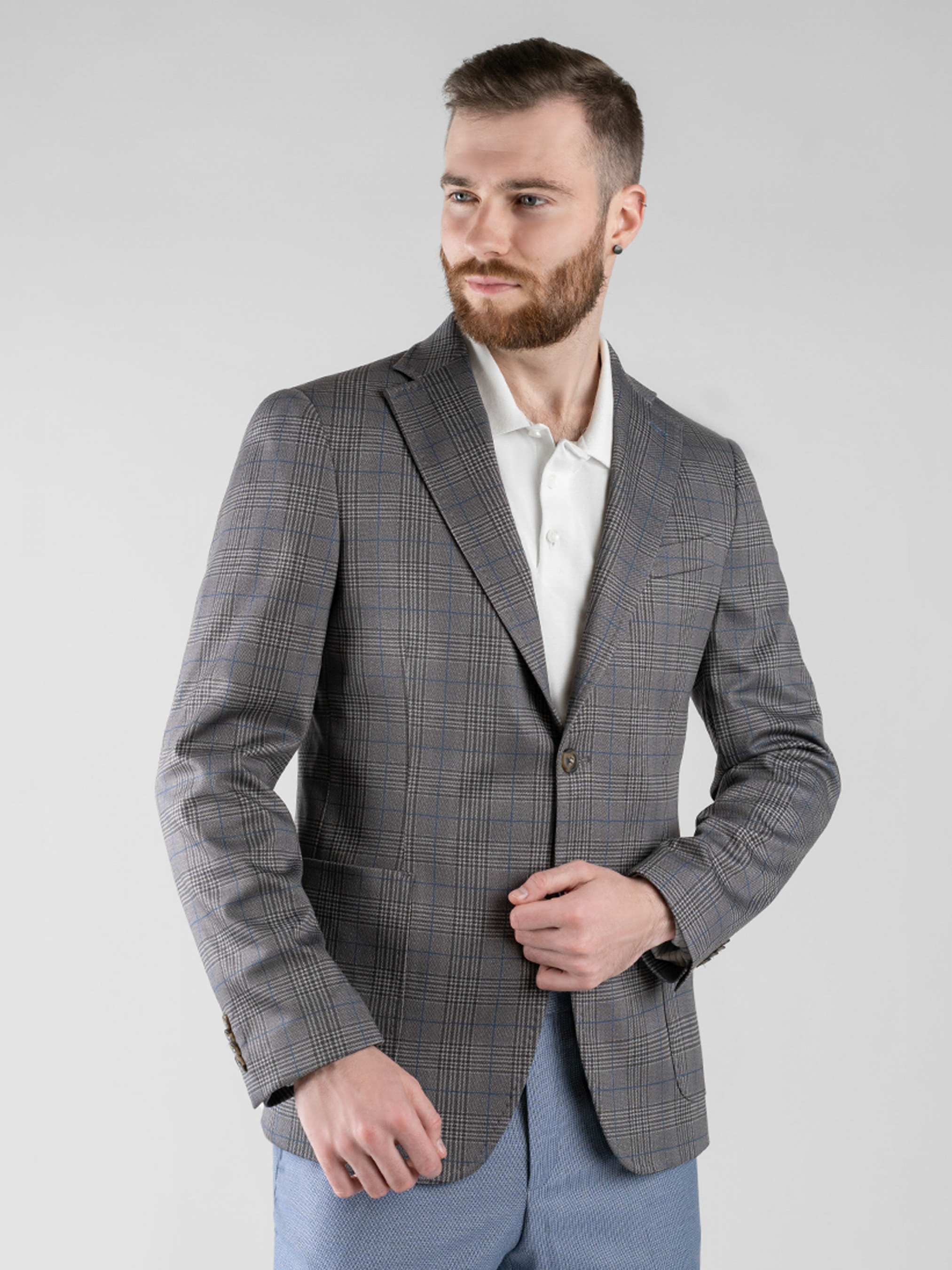 Трикотажный приталенный пиджак Arber серого цвета в клетку, выполнен из эластичной ткани, на основе шелковистой вискозы. Пиджак комфортный, идеально сидит на фигуре за счет мягкой трикотажной ткани. Модель на 2 пуговицы, с прямым лацканом, двумя накладными карманами, двумя шлицами, подкладка спинки укороченная. Пиджак прекрасно сочетается с брюками из хлопка или джинсами. Дополнить образ можно тонким трикотажем, сорочкой casual и неформальной обувью.