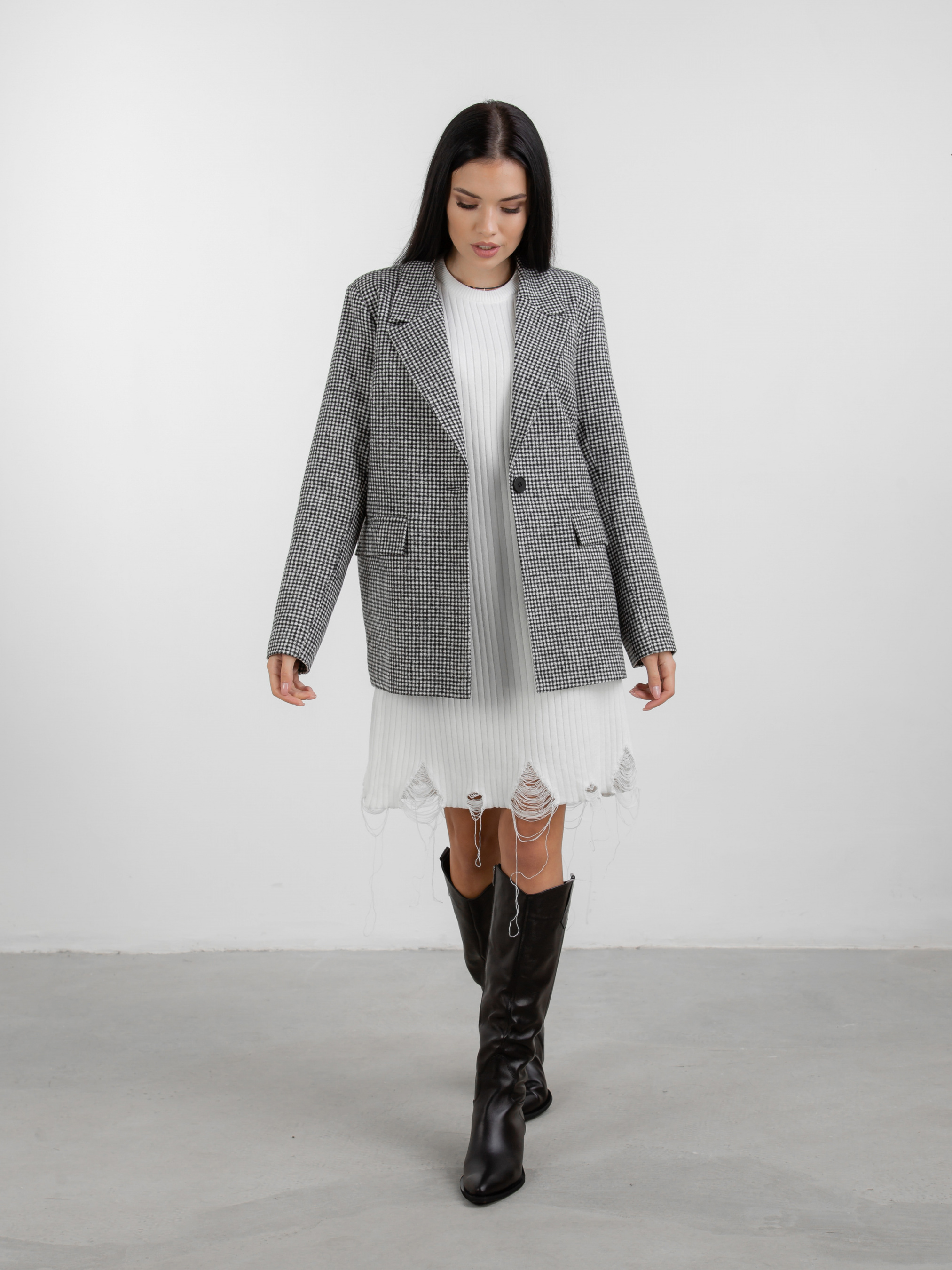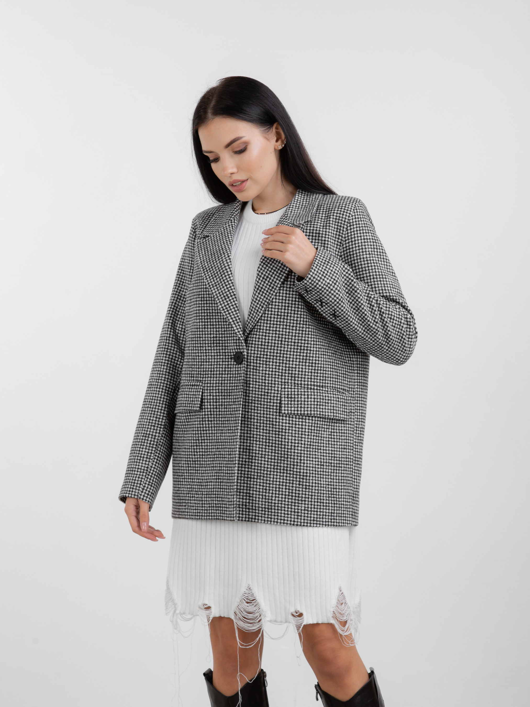 Пиджак "Бельфор" однобортный в принт ROMASHKA Однобортный пиджак в принт. Акцент на широкую линию плечей. Фасон свободный, не приталенный. Есть карманы и пуговица по центру. Базовый вариант, который можно скомбинировать как в классическом образе, так и в повседневном. Сочетается с любой обувью и аксессуарами в базовых оттенках.