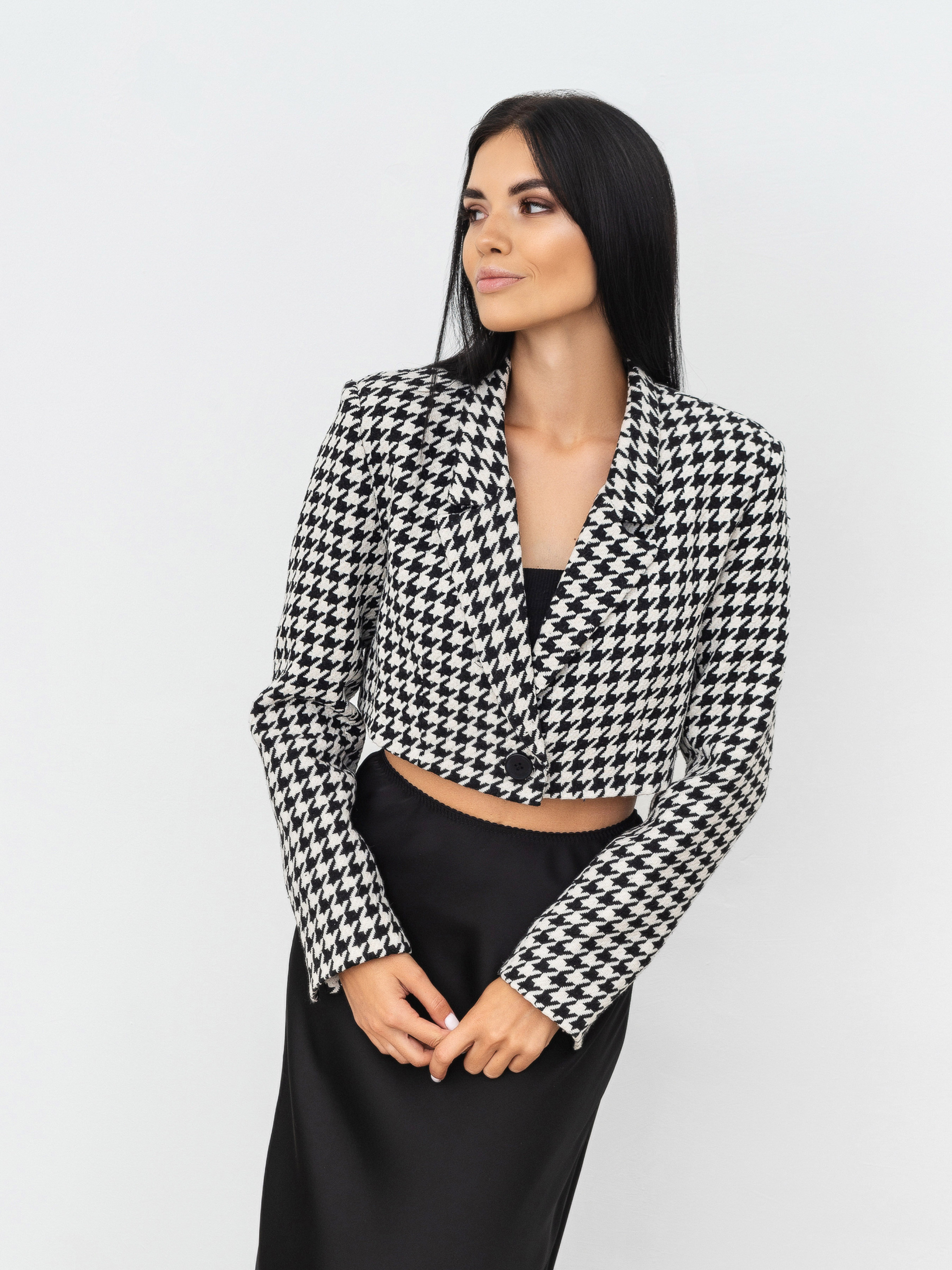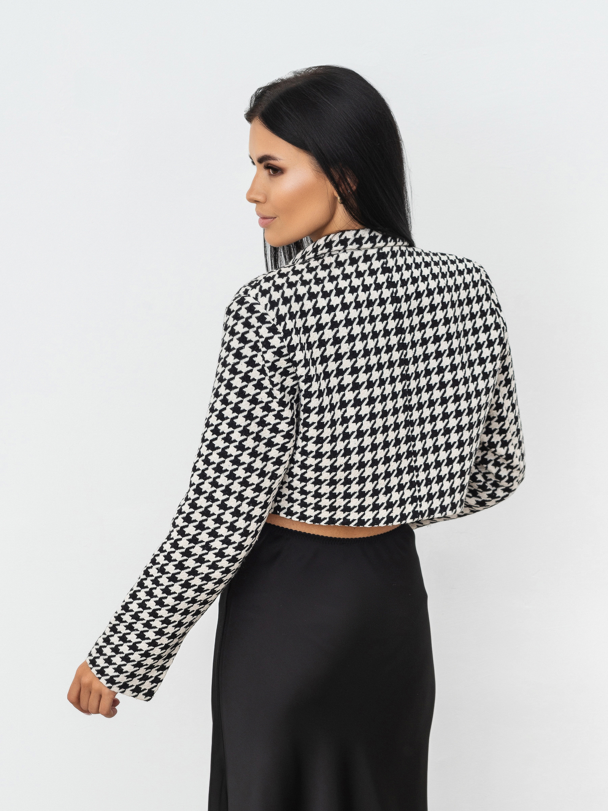 Твидовый укороченный жакет в принт гусиная лапка. Стильная модель, которая станет акцентом любого образа. Изделие идет с подкладом. Благодаря полиэстеру в составе (60% хлопок, 40% полиэстер) хорошо носится, не кашлатится. Садится размер в размер. Может быть как верхней одеждой, так и одним из элементов многослойного образа. Прекрасно подчеркивает талию благодаря укороченному фасону. Советуем носить с джинсами и юбками с высокой посадкой (например, "Таллин", "Найроби", "Ватерлоо", "Сельма"). XS-S : Длина по спине : 39 см Длина рукава : 57 см Плечи : 40 см. S-M : Длина по спине : 39 см. Длина рукава: 60 см Плечи : 43 см. M-L : Длина по спине : 39 см. Длина рукава: 58 см Плечи : 43 см