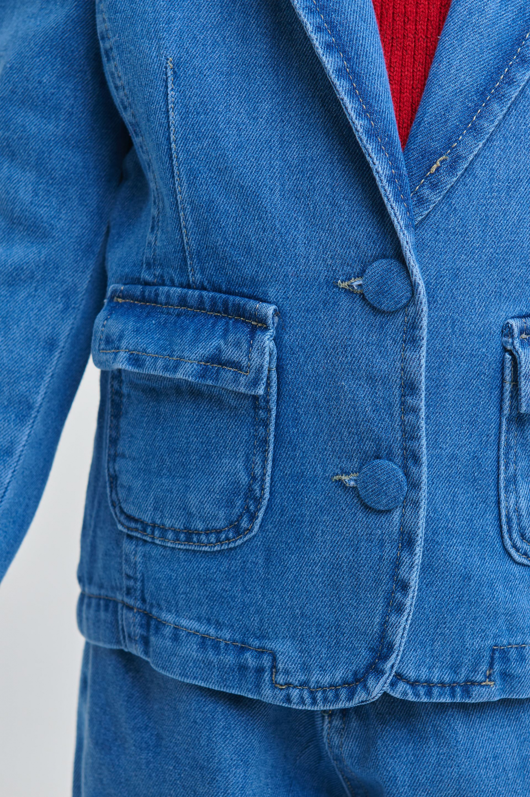 Детали: Джинсовый пиджак синего цвета. Застегивается на две пуговицы. По бокам два накладных кармана. Классический ворот. Крой: прямой.